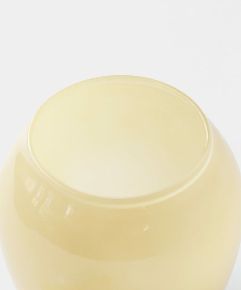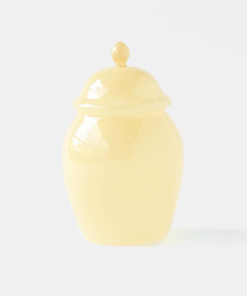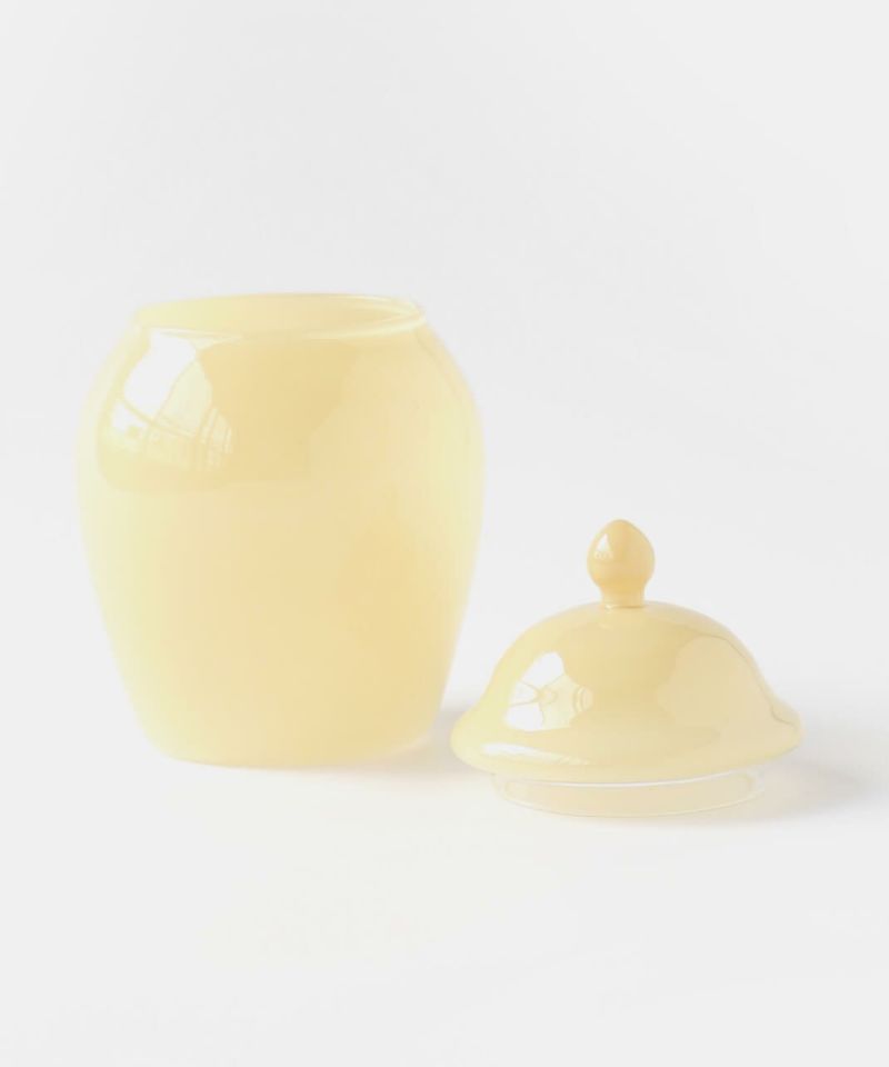 丸みを帯びたレトロなフォルムに乳白系の塗装が施された、耐熱ガラス製のキャニスター。 ガラスのフタをかぶせるだけのシンプルな作りです。ポットの底面は透明。 砂糖などの調味料やスパイスなどの乾物を入れたり、綿棒やコットンを入れても。お菓子を忍ばせてテーブル上に置いておくのもおすすめです。 まぁるくポテっとしているフォルムが可愛いですね。