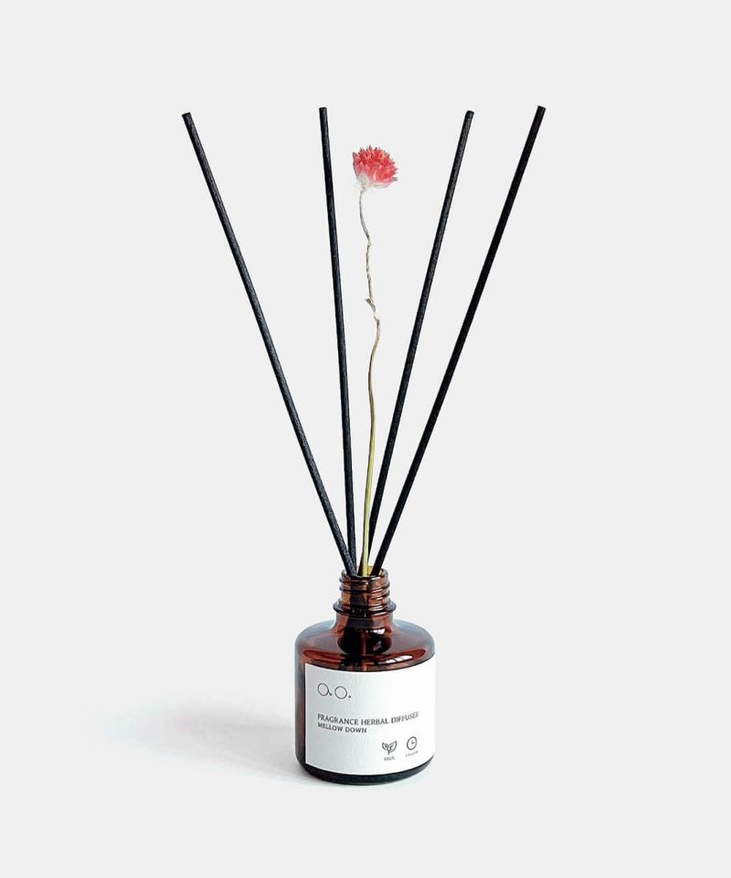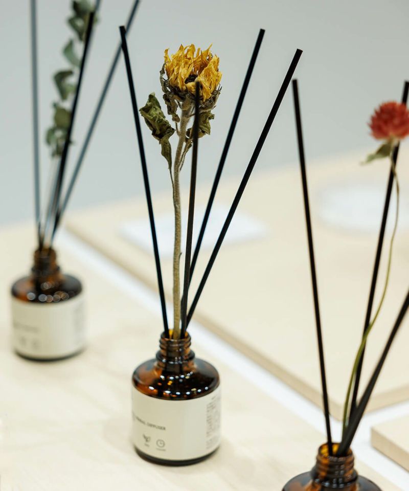 精油だけではなく、配合するアルコールやグリセリンにいたるまで、トウモロコシやヤシ由来の天然由来原料を使用し、安心してお使いいただけます。ao.のアトリエで作るFRAGRANCE HERBAL DIFFUSERは、厳選した原材料を配合し、ブレンドや調合、ラベルの糊付けに至るまで一点一点ハンドメイドにて製造しています。