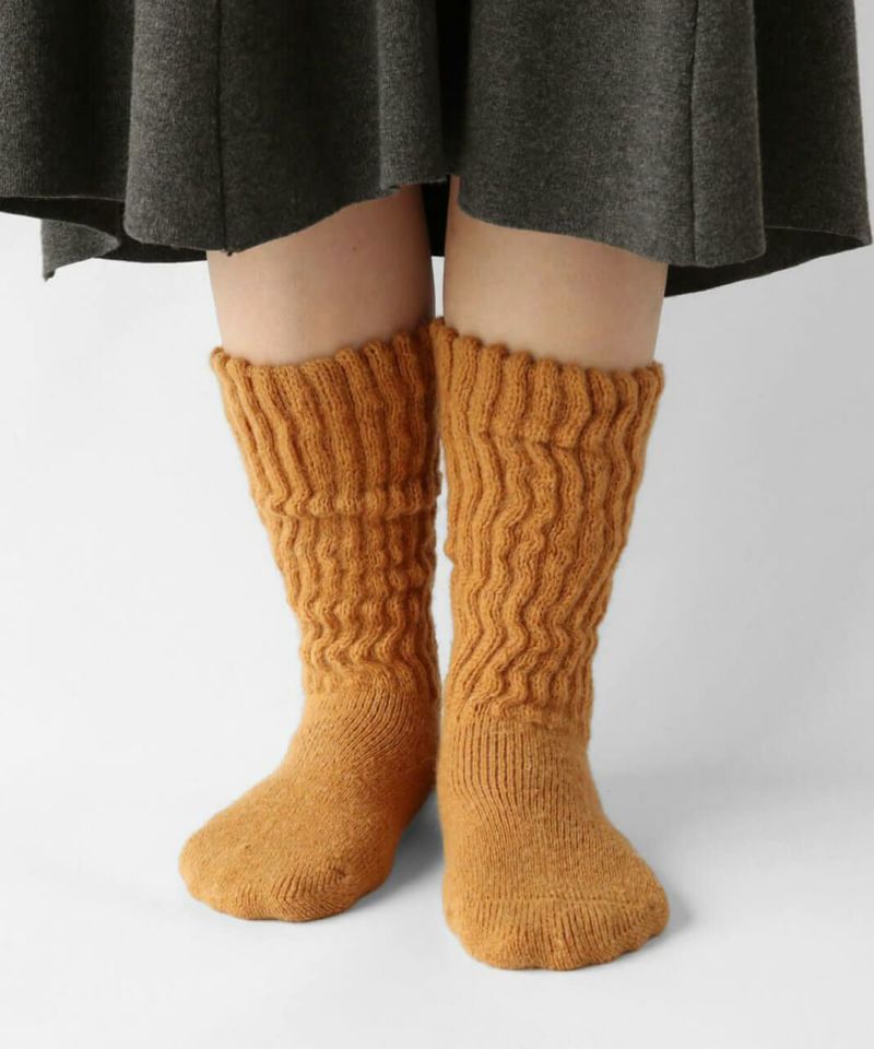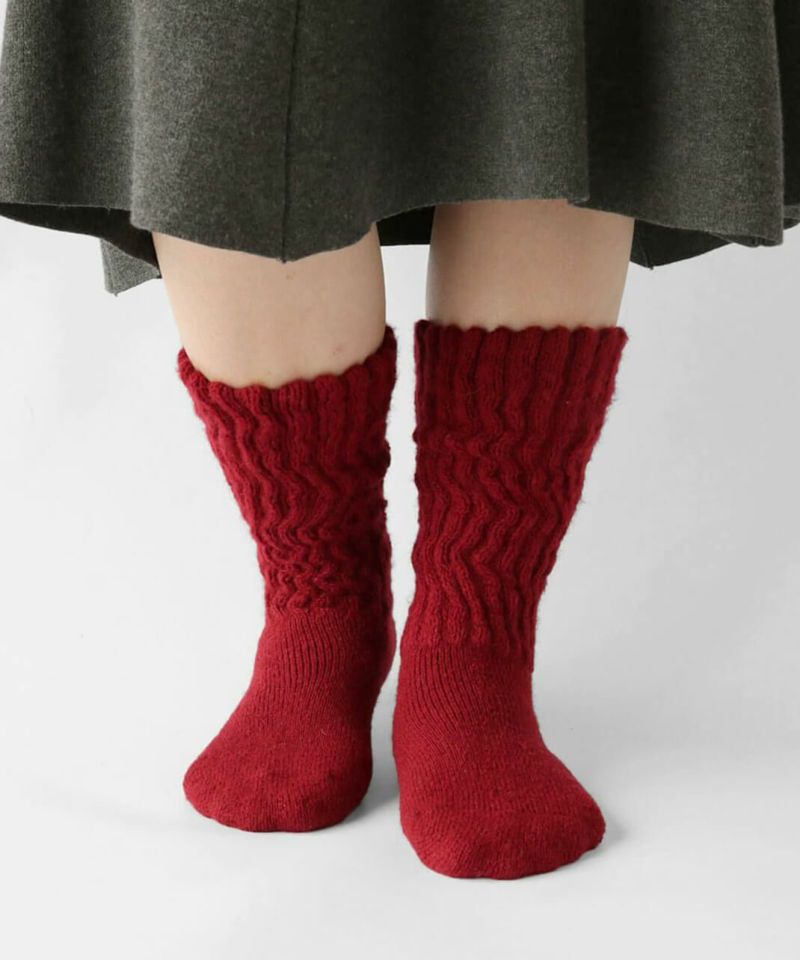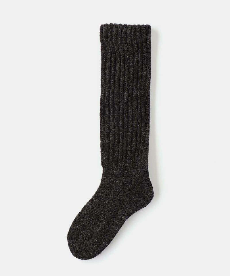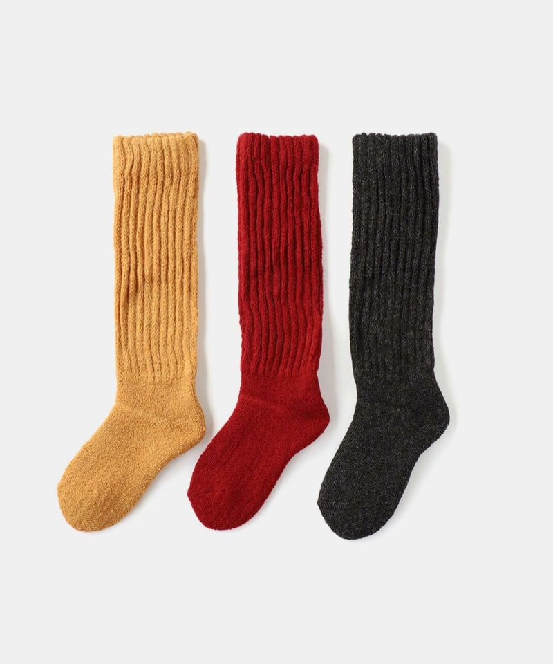 靴下とレッグウォーマーを合体させたロング靴下。ふくらはぎに当たる内側にシルクを使い、2重編みで編み立てました。足底はパイルでクッション性があります。長さは約30cmで足先からふくらはぎをしっかり暖めてくれます。ルームソックスやおやすみ靴下としてもおすすめです。