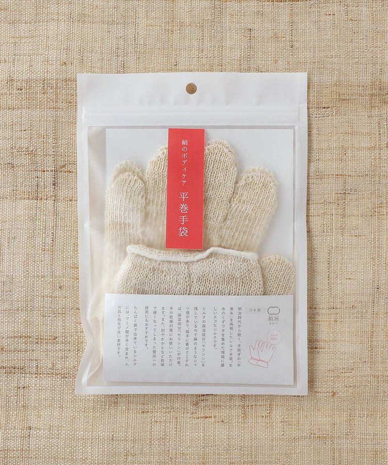 シルクの保湿成分「絹セリシン」がたっぷり残った平巻糸を編んで作られた保湿手袋。 糸の表面に残っているセリシンを肌に擦りつけることで、セリシンが付着し、肌を保湿してくれます。 メッシュ編みで空気が通りやすく、蒸れにくく快適。 就寝時にご使用いただいても、蒸れによる不快感がなく、朝まで心地よく保湿してくれます。 また、セリシンは水溶性で水に反応して溶けだすため、お風呂上りなどに使用していただくと効果が高くなります。