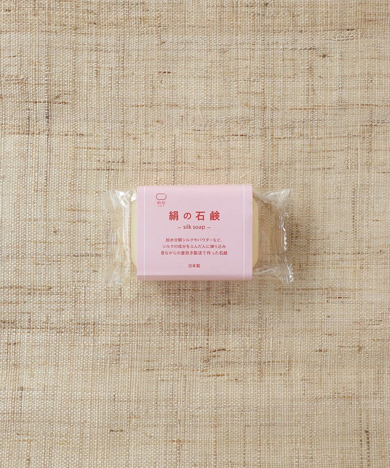 人と環境に配慮した昔ながらの製法にこだわった絹の石鹸。 石鹸の素材を大きな釜でゆっくり時間をかけて炊き上げる「釜炊き製法」と、釜で炊いた石鹸を枠に流し込んで自然に冷ます「枠練り製法」で作られています。