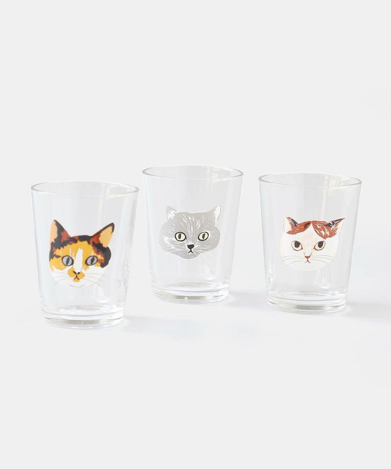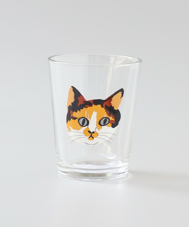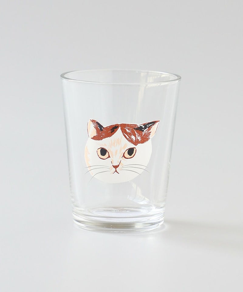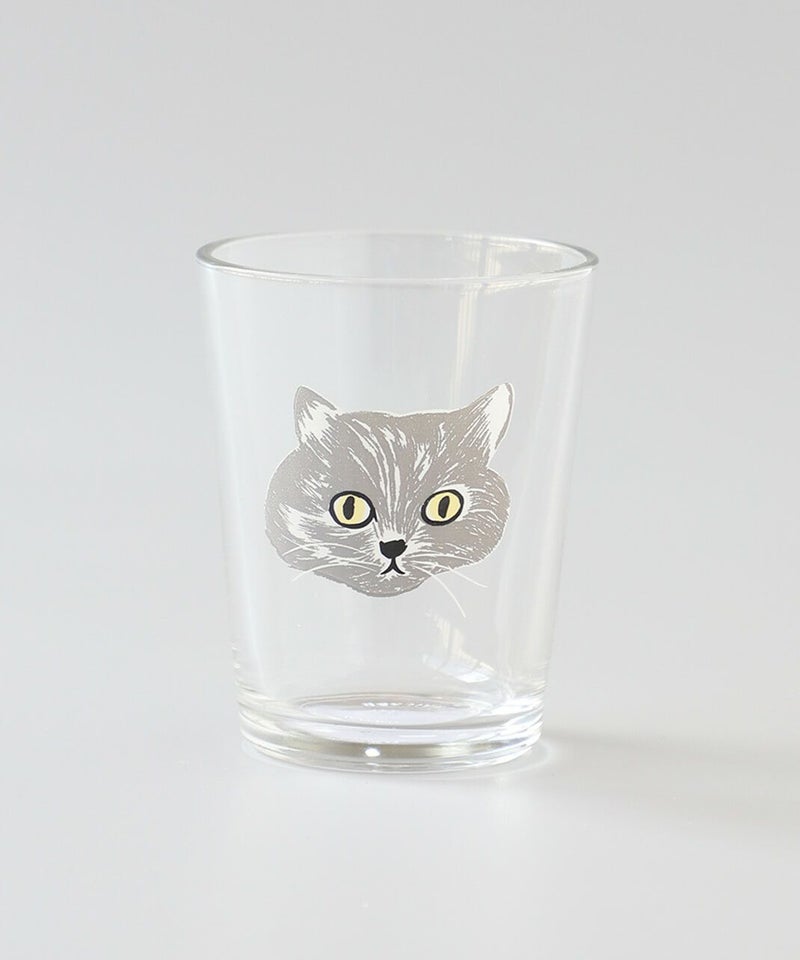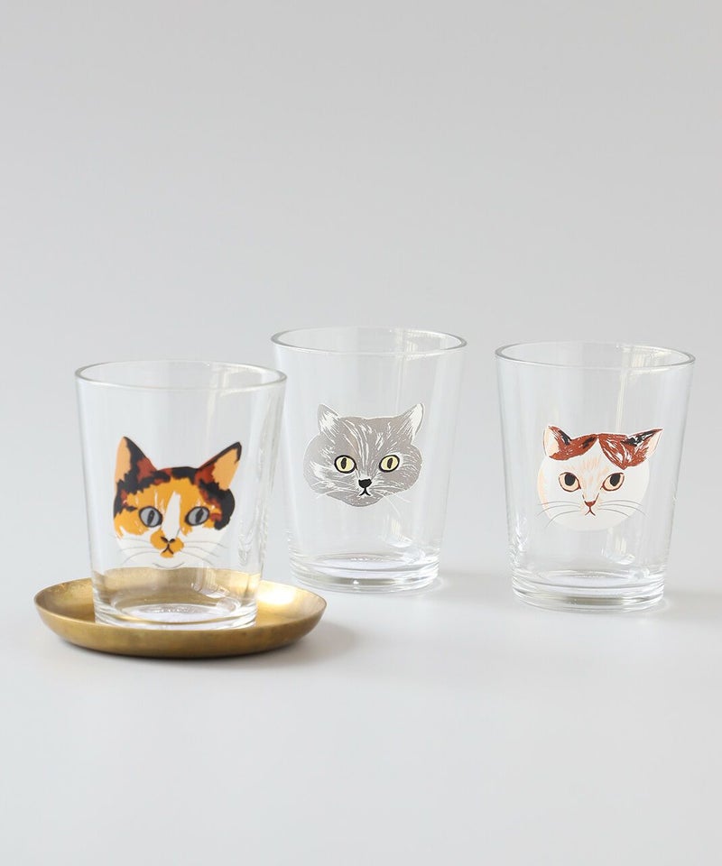 小さめのグラスがなんとも可愛らしい。 松尾ミユキさんの描く、じっと見つめるネコ達が大きくプリントされているのがポイント。