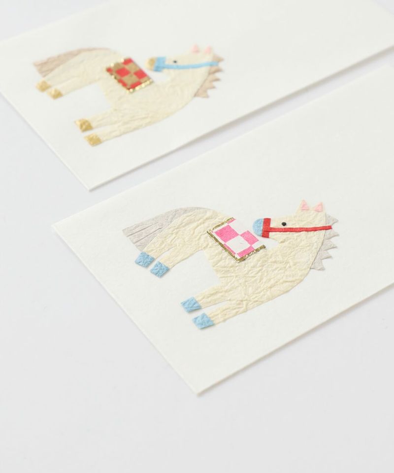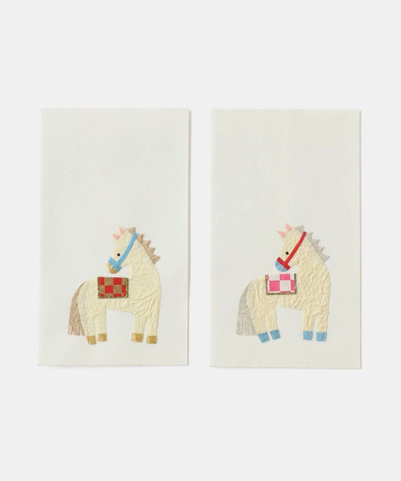 穏やかな表情でたたずむ馬の切り絵ぽち袋です。2色各1枚、計2枚をセットにしました。 揉み加工や光沢のある和紙を一つひとつ手作業で貼り合わせています。切り絵の豊かな表情をお楽しみください。 お年玉だけでなく新年のご挨拶に添えるミニ封筒としてもお使いいただけます。お年賀やお歳暮などのギフトに添えるのもおすすめです。 お札が三つ折りで入るサイズです。