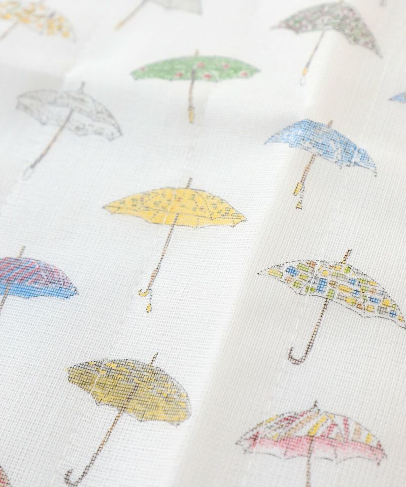 パッと大きく開く、傘たちのシルエット。これまでにイイダ傘店で生み出された傘があっちにこっちに舞い踊る。 一度にたくさんの傘は差せないけれど、このテキスタイルがあれば、傘の花がいっせいに咲き誇る。