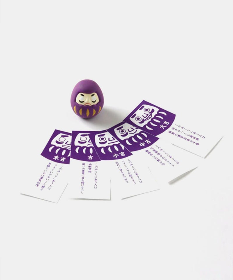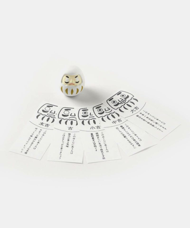 だるまの底面にある赤い紐を引くと、大吉・中吉・小吉・吉・末吉のいずれかが入ったおみくじが1枚出てきます。 おみくじの楽しさと、願いを込めた飾り物としての魅力がひとつになったアイテムです。