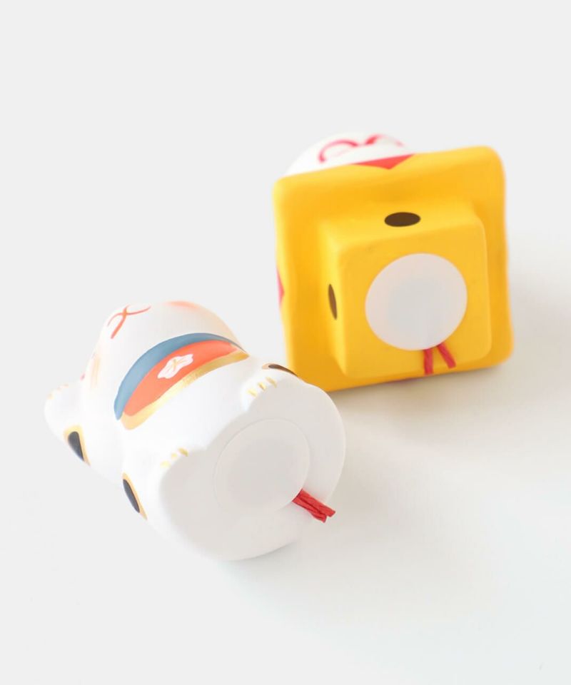 陶製の人形の中に、小さく折りたたんだおみくじが入っています。 底面の赤い紐を引いていただくと、5種類から1枚、そのモチーフにちなんだおみくじが出てきます。 おみくじを楽しんだ後は、お好きな場所に飾ってお楽しみください。 来年の干支の午は、にっこりと朗らかな顔で新しい年を駆けていく姿をイメージし表現しています。 背中の鞍(くら)には縁起のいい梅の模様入り。白いウマには白梅、赤いウマには薄紅色の梅が描かれており、2種類並べてお飾りいただくのもおすすめです。 農耕や運搬、移動手段などに役立つことで古くから人々の暮らしを支え、大切にされてきた午(ウマ)。 その力強くたくましい印象から、生命力や健康、発展を象徴する招福の縁起物とされ、牛とともに神様の乗り物としても尊ばれてきました。 また、「ウマ」という名前の響きから「うまくいく」、走る姿から「幸運が駆け込んでくる」などの願いがこめられることもあります。