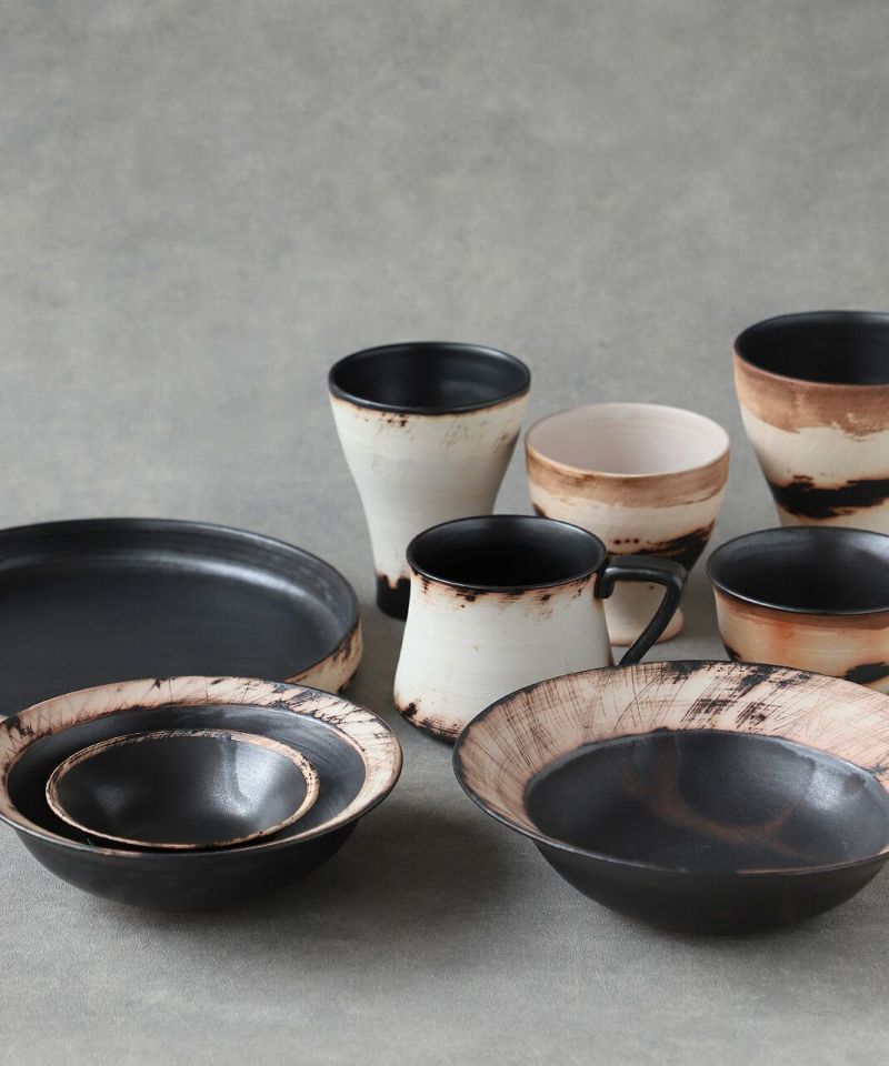 一つ一つデッサンした器の、インクが滲んだような焼け色が温かみをもたせてくれます。ボウルやマグカップには温かいカフェオレがとても合います。