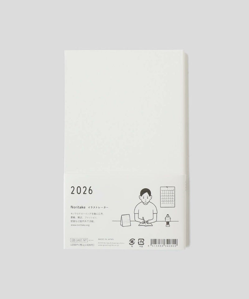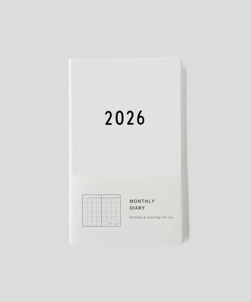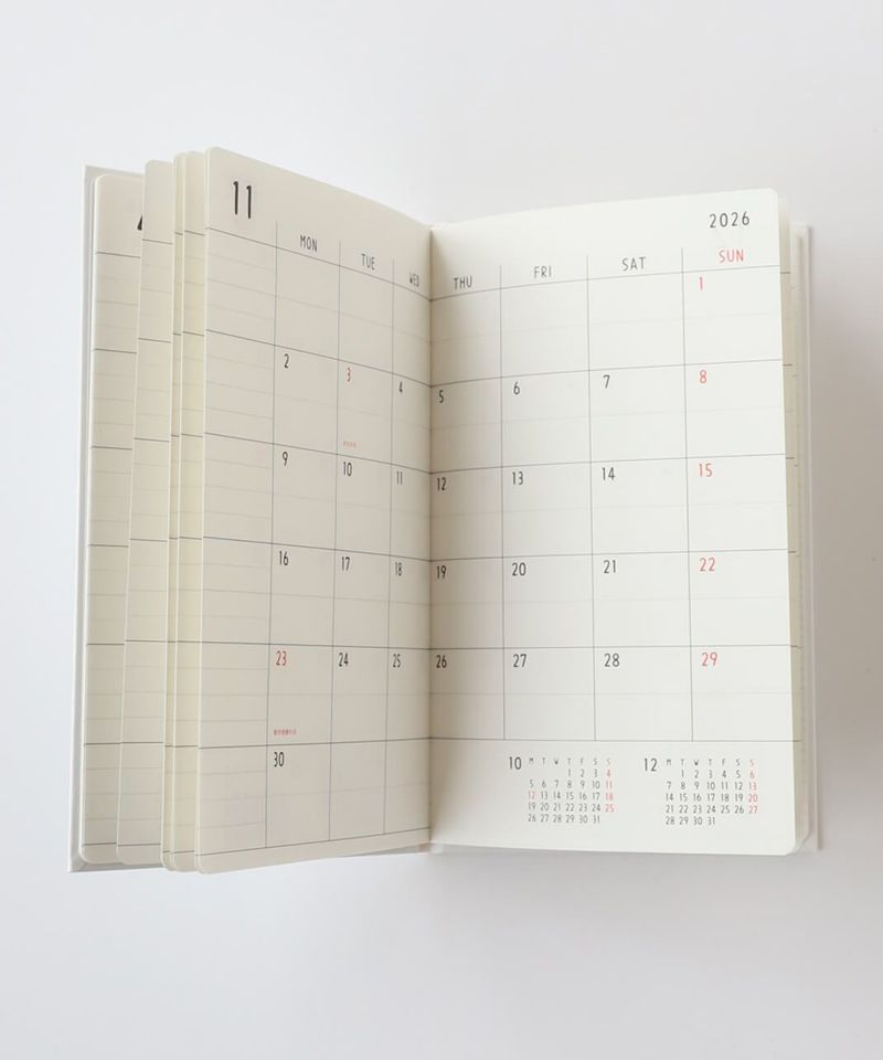 イラストレーター Notitake の文字にこだわったマンスリーダイアリー。 風合いのある活版印刷と丸みを帯びた文字で、シンプルでありながら無機質さを感じさせないデザインです。 表紙はビニールペーパーのハードカバーに箔押しを施した、シンプルながら存在感のある1冊です。