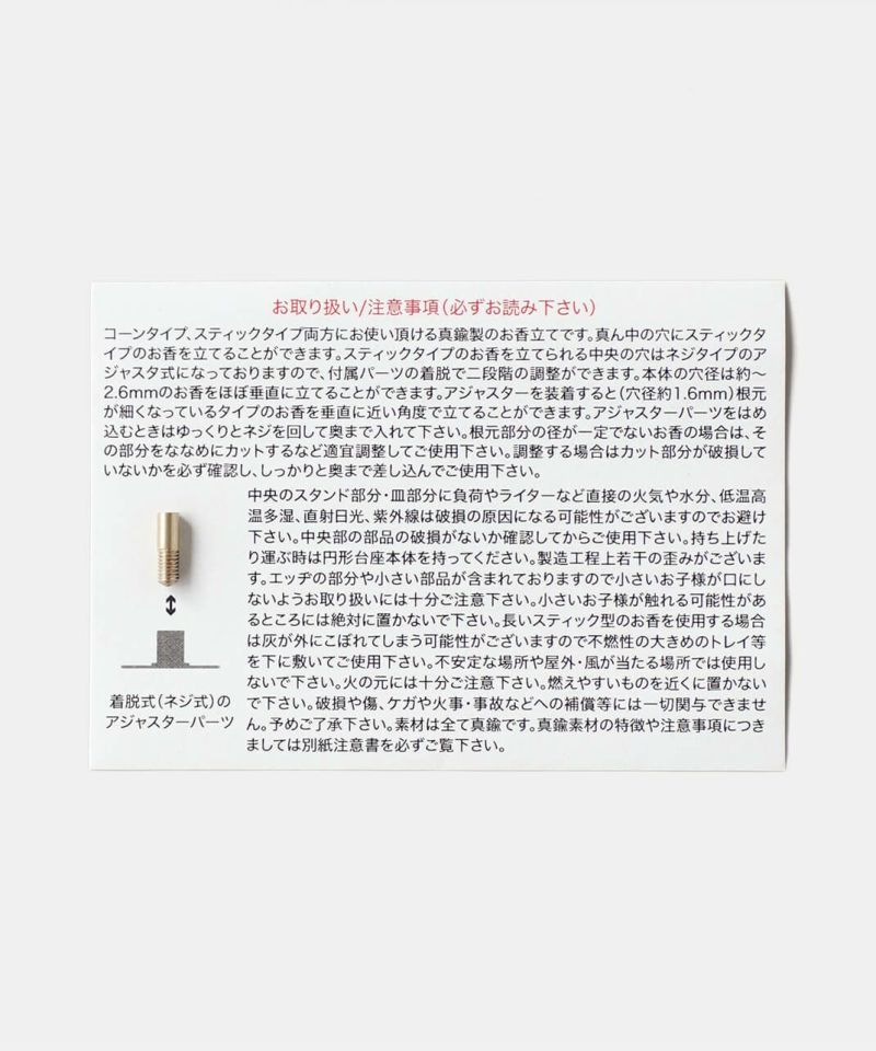 真鍮製のお香立てです。 真ん中の穴にスティックタイプのお香を立てることができます。 お香を立てる中央の穴はネジタイプのアジャスタ式になっておりますのでパーツの着脱で二段階の調整ができます。 大きい方の穴は直径約~2.6mmのお香をほぼ垂直に立てることができます。 小さい方の穴の径は約1.6mmで根元が細くなっているタイプのお香を垂直に近い角度で立てることができます。 box付きですのでギフトにもおすすめです。