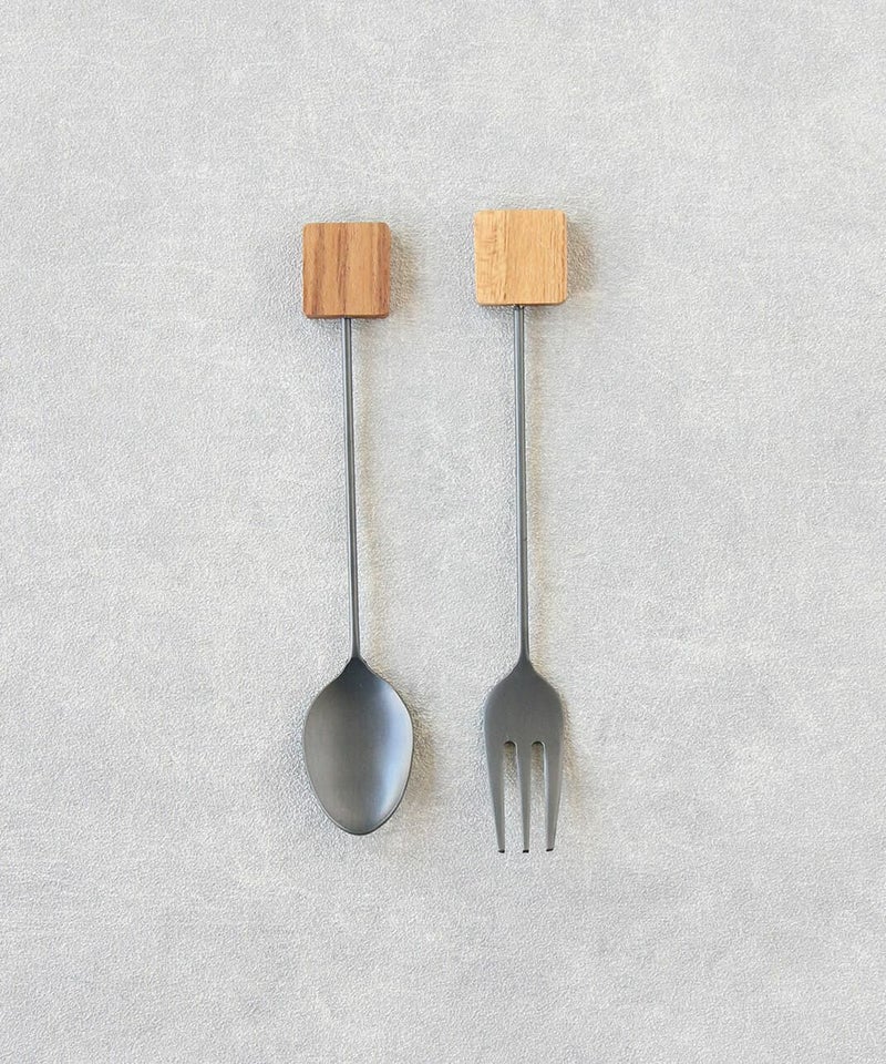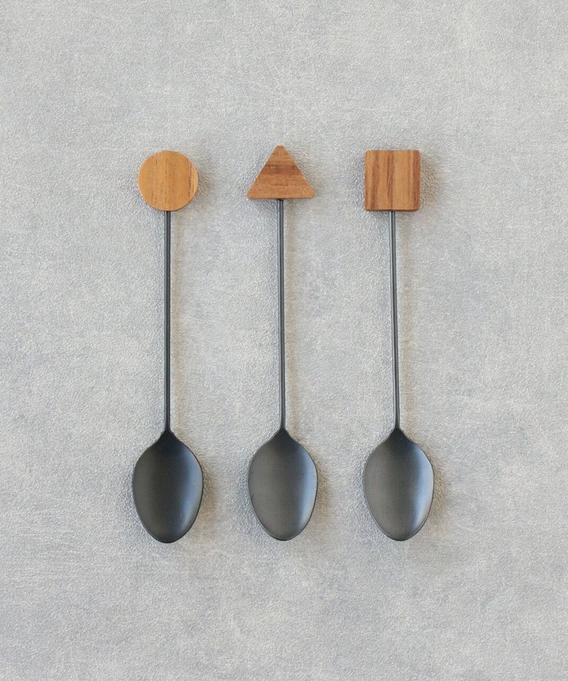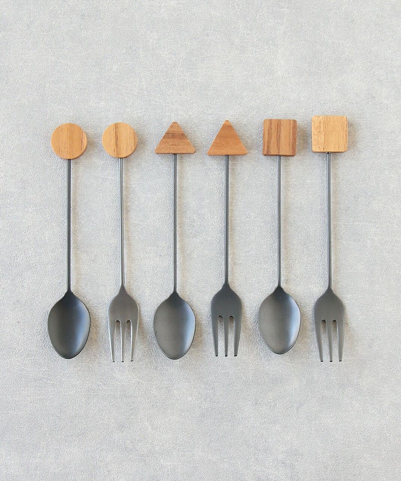 幾何学モチーフの木製パーツがアクセントのカトラリーです。