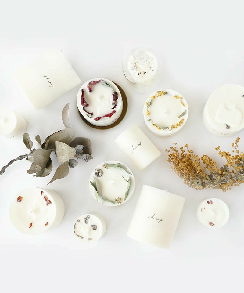 名古屋市のアトリエにて、全て手作業で制作しているソイキャンドル。素材はワックスと精油、綿芯のみで人工の着色料や香料は一切使用しておりませんので、食後やお休み前のリラックスタイムにどうぞ。ソイキャンドルは、すすが出にくく有害物質も発生しにくいため、お食事中でも安心してお使いいただくことができます。
