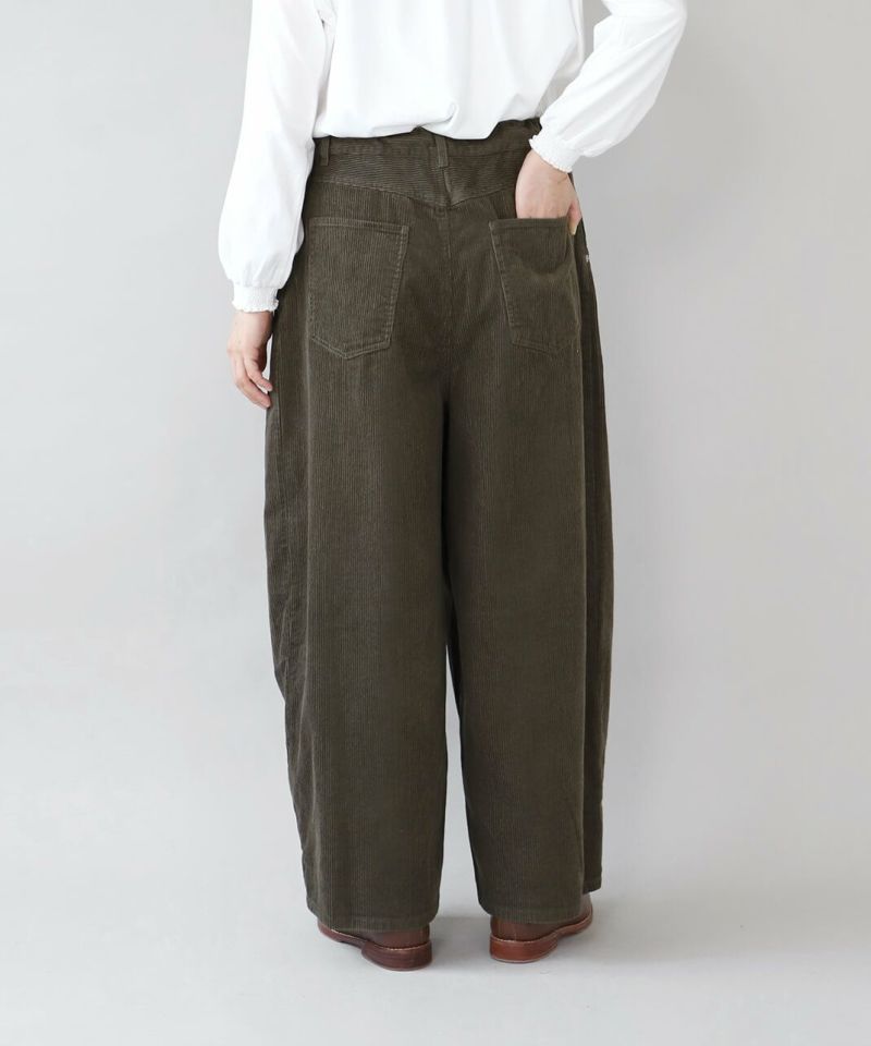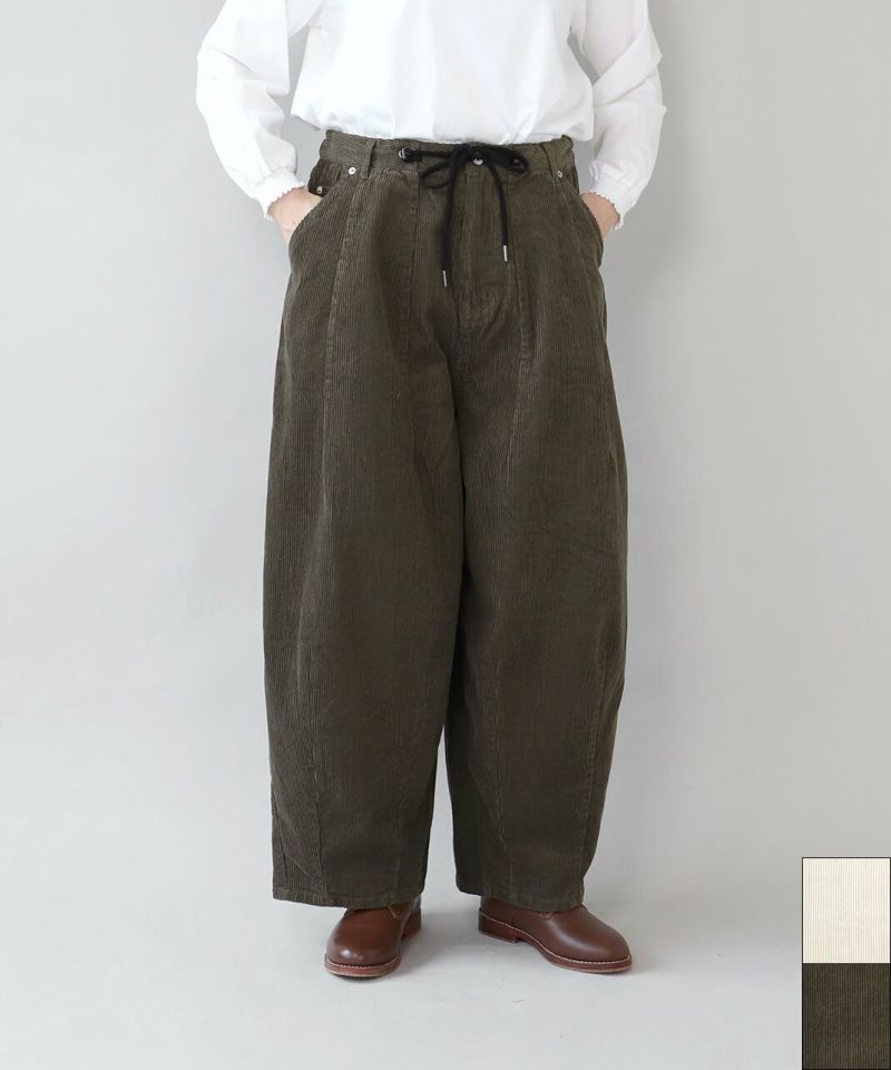 上質なコットンコーデュロイ生地を使用したタックバルーンパンツです。 ウエストと裾のダーツがボールの様な立体的なシルエットの1着。ゆったりとしたウエストはドローコードタイプの紐でジャストサイズに調整可能です。リラックスしたサイズ感は足のラインを拾わず、トップスとのバランスも取ってくれます。