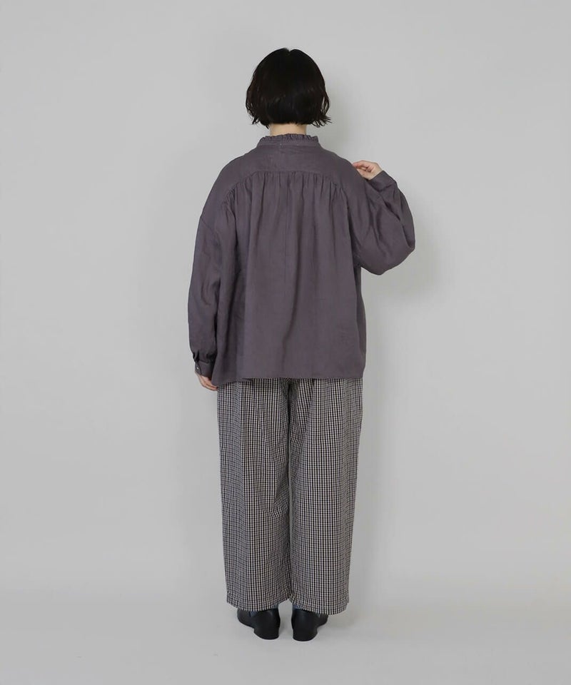 背中のヨーク切替え部分に施したギャザーが、ふんわりと自然な広がりのあるシルエットに。