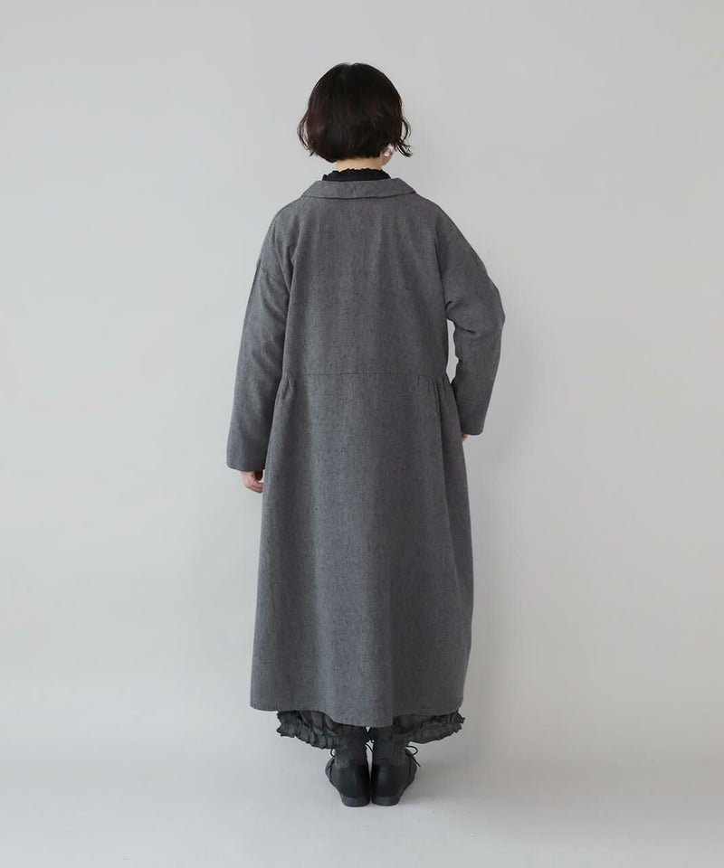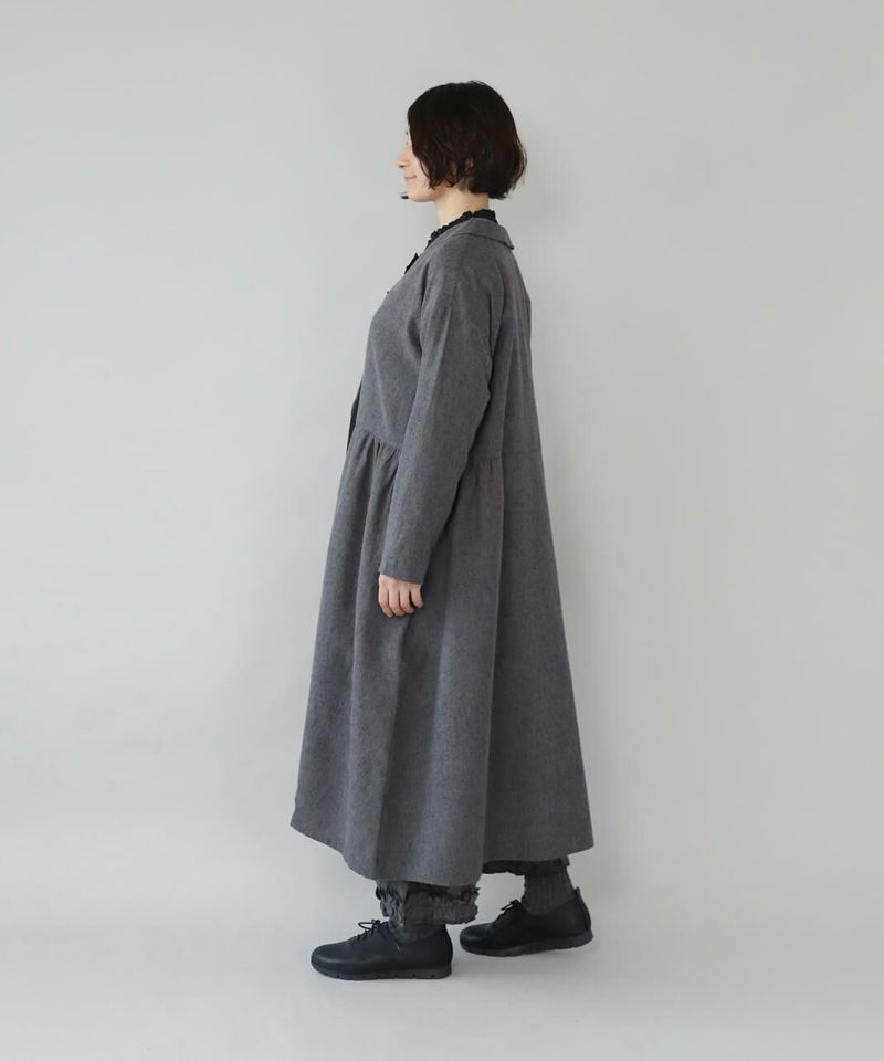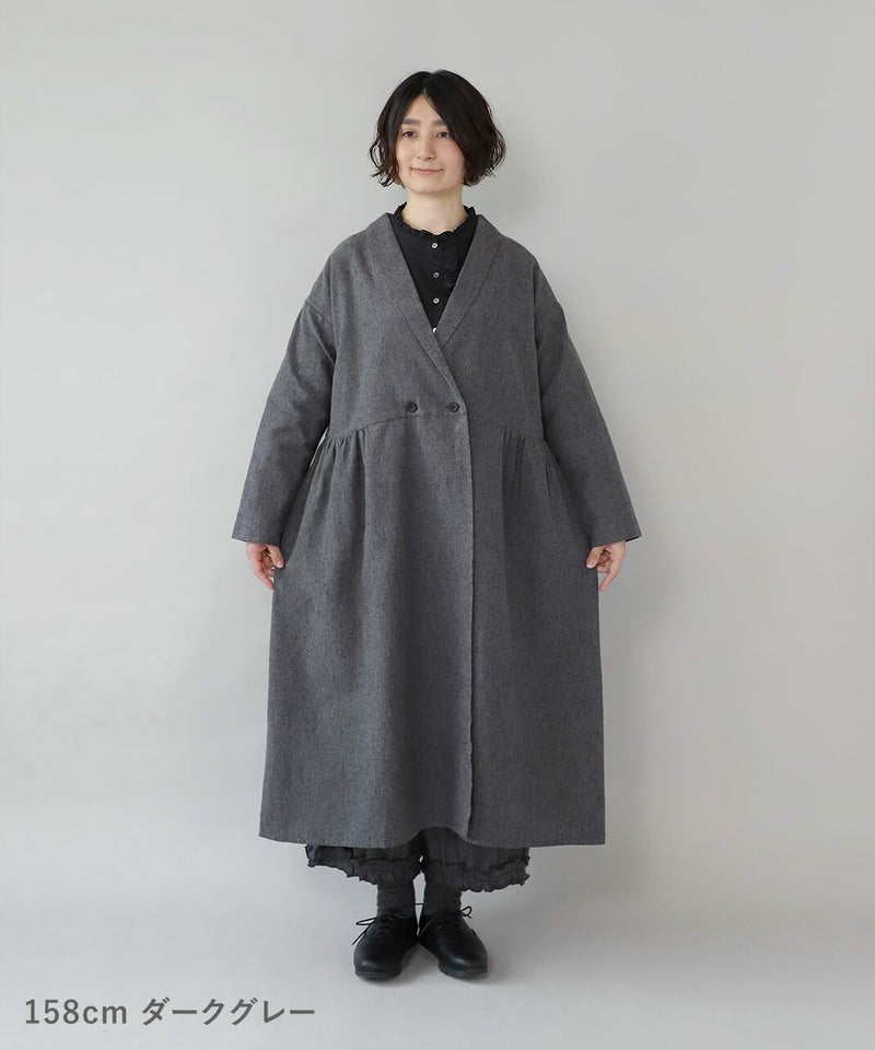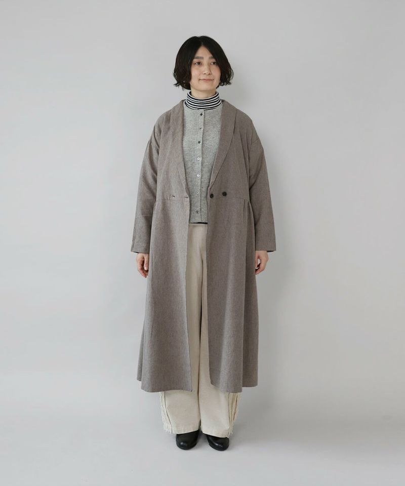 柔らかい微起毛のコットンリネン素材を使用したショールカラーコートワンピースです。 ワンピースとしても、軽いコートとしても楽しめるデザイン。ショールカラーとボタンが並んだダブルブレスト仕様が上品で大人な雰囲気を演出してくれます。ウエストのサイドギャザー切替えでふんわりと広がるシルエットはふんわりと柔らかく、この季節に重宝します。