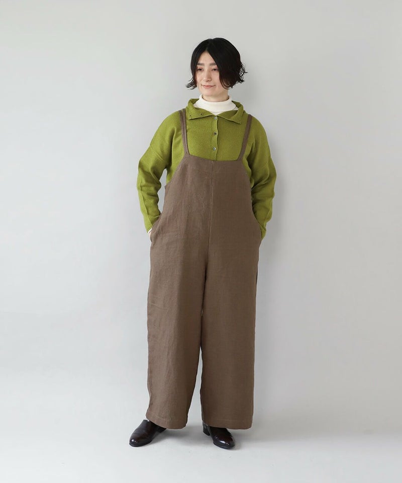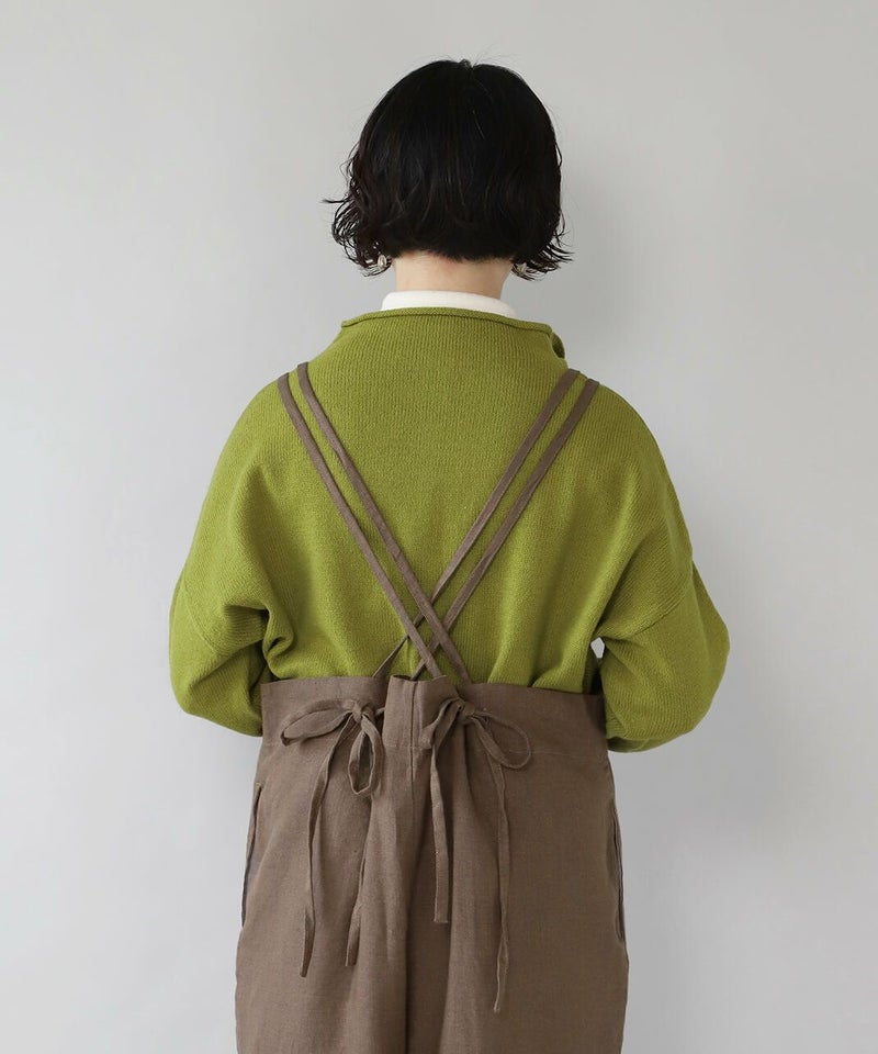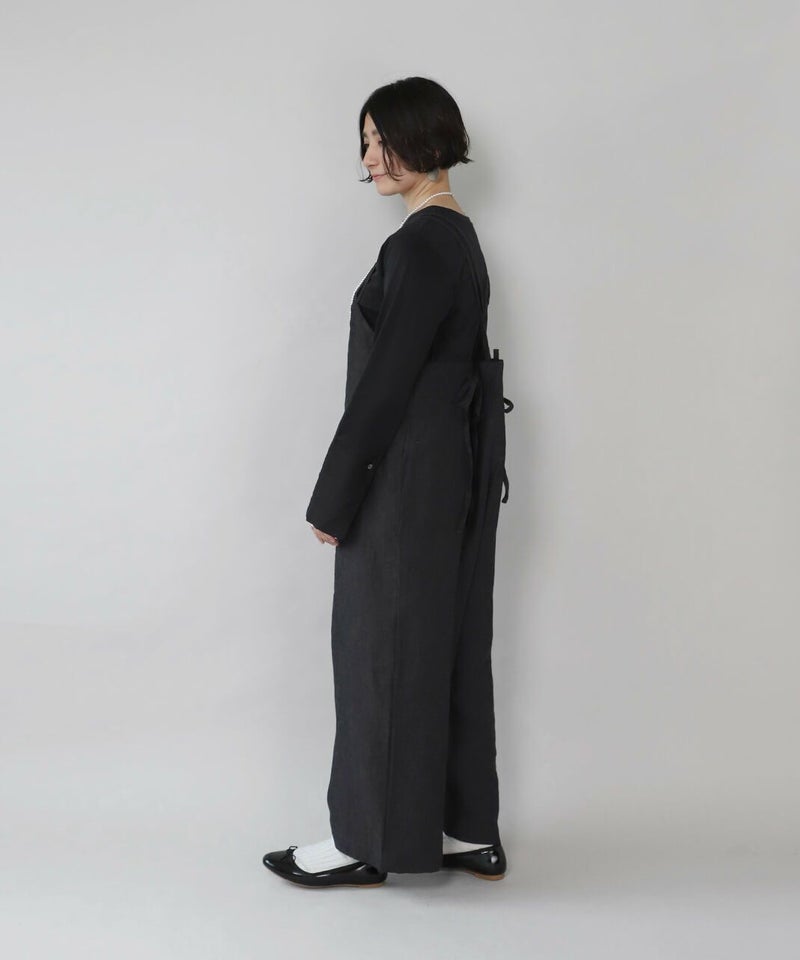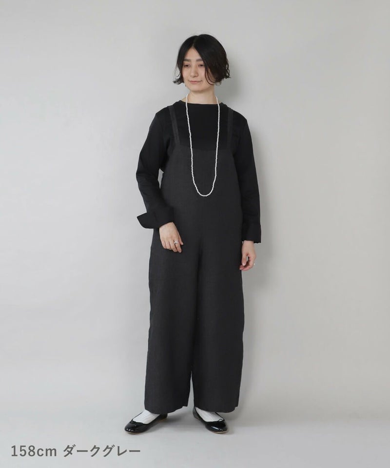 ハリのある太番手のリネン糸を使用したサロペットです。 ゆったりとしたシルエットでリラックスした着心地。二重になった細い肩紐が華奢でおしゃれな印象を演出してくれます。後ろのリボン結びがコーディネートのアクセントになります。紐の長さはそのリボンで調整可能です。リネン特有のナチュラルな風合いがカジュアルにもキレイめにもスタイリングできます。