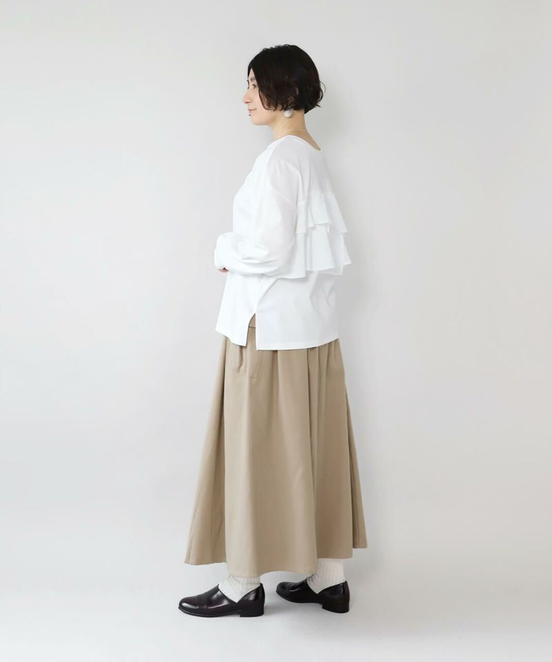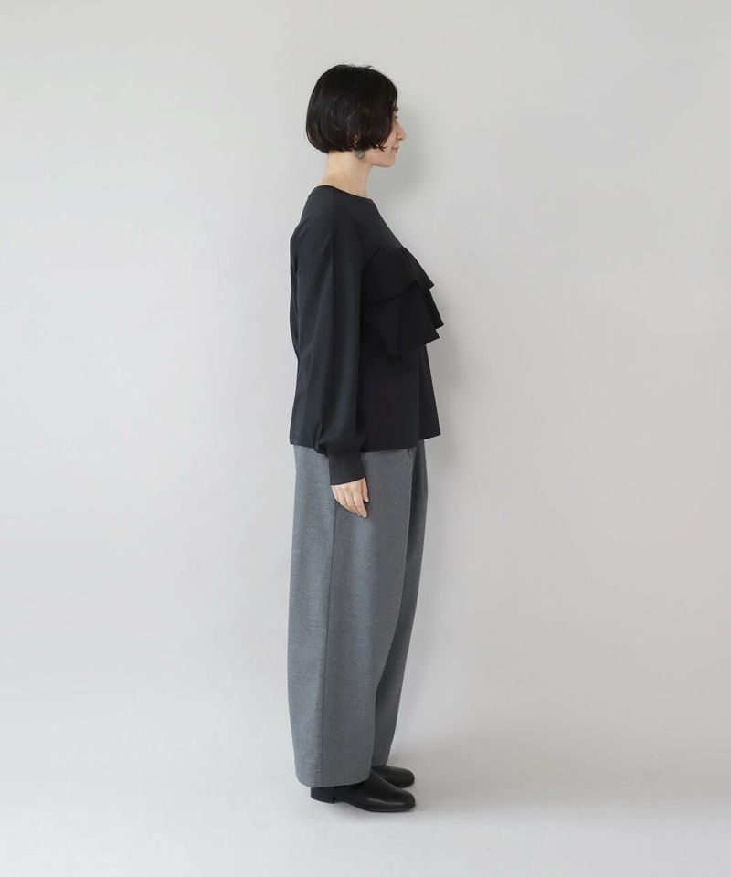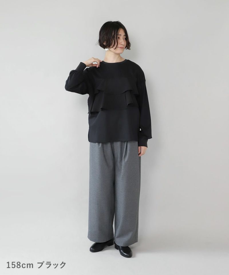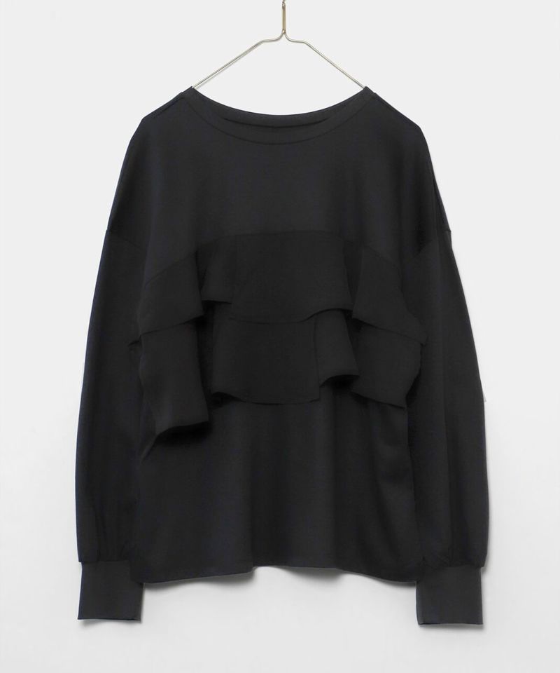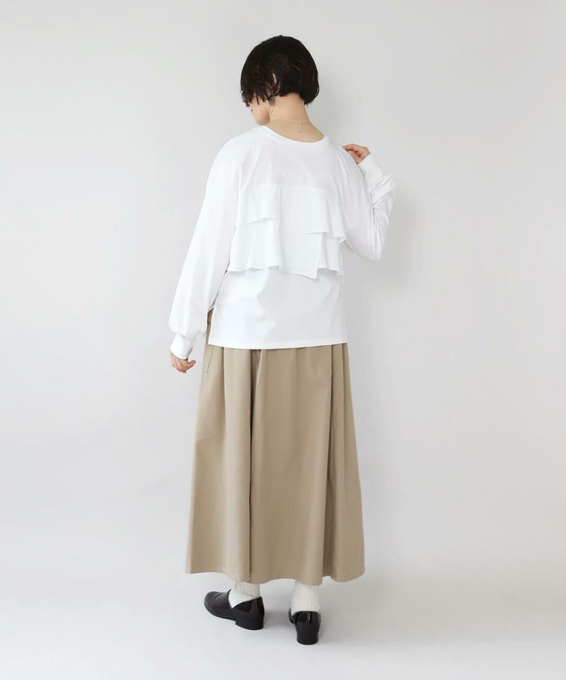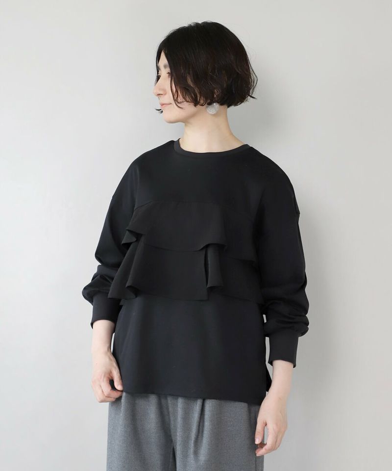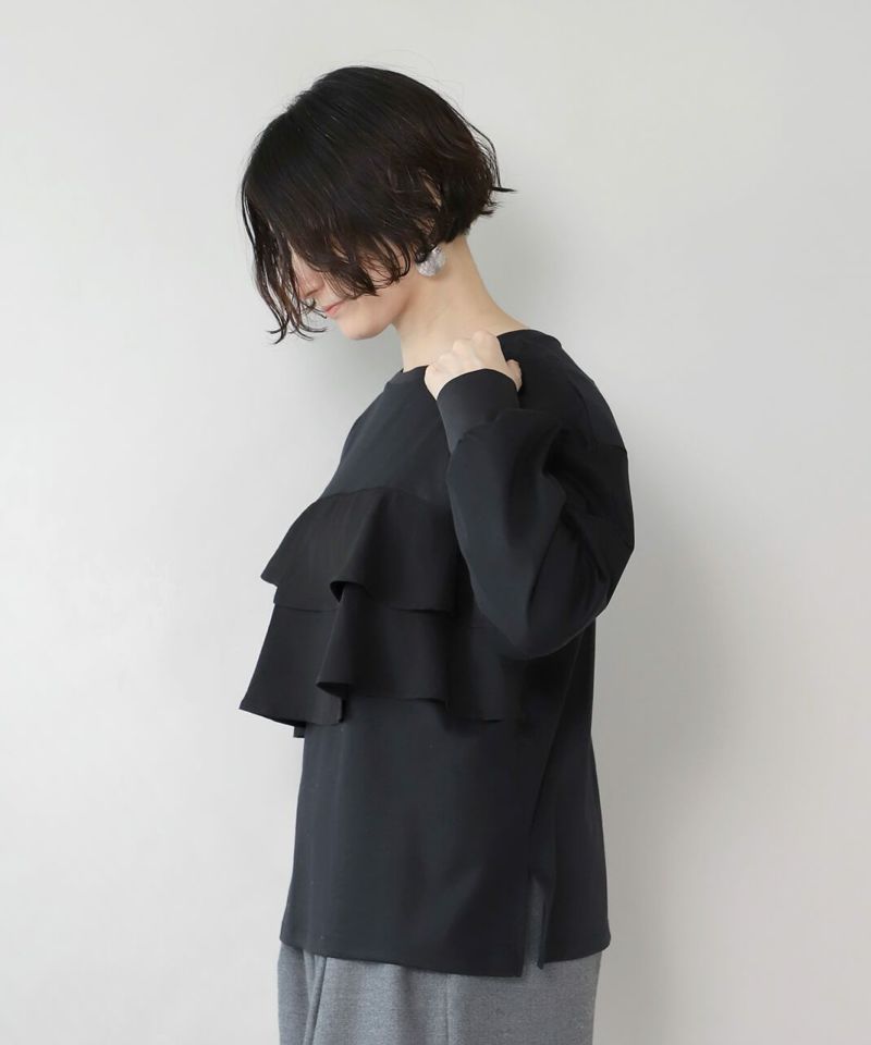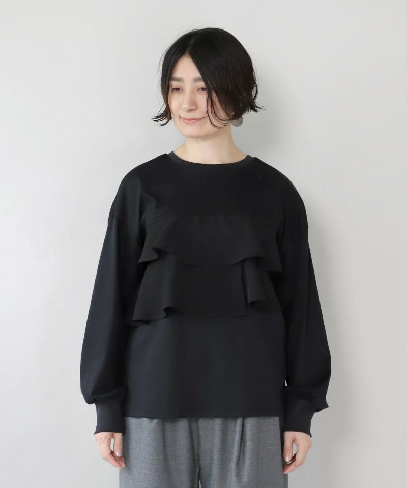 毛羽が少ないコンパクト糸を使用し、目の詰まったさらさらとなめらかなコットン生地を使用したフリルカットソーです。 胸元の大胆な2段のフリルが目を惹き、コーディネートのアクセントになります。カーディガンやジャケットスタイルにおすすめです。前後着用の2WAY仕様なので、フリルを背中に一味違ったスタイルを楽しめます。