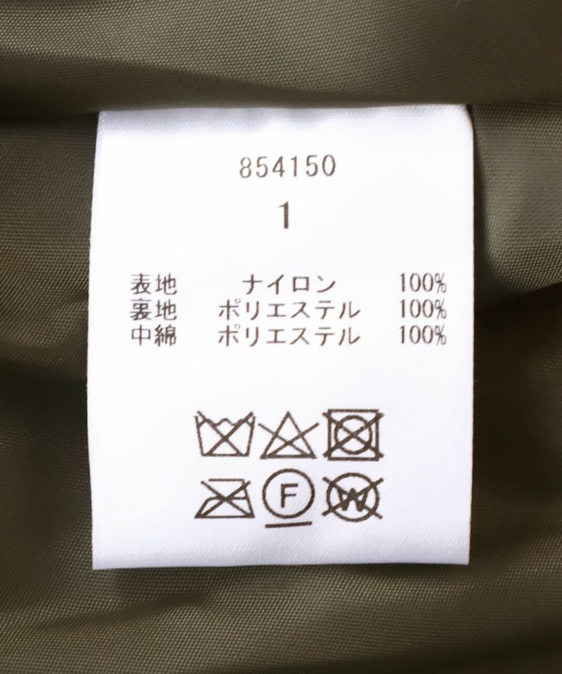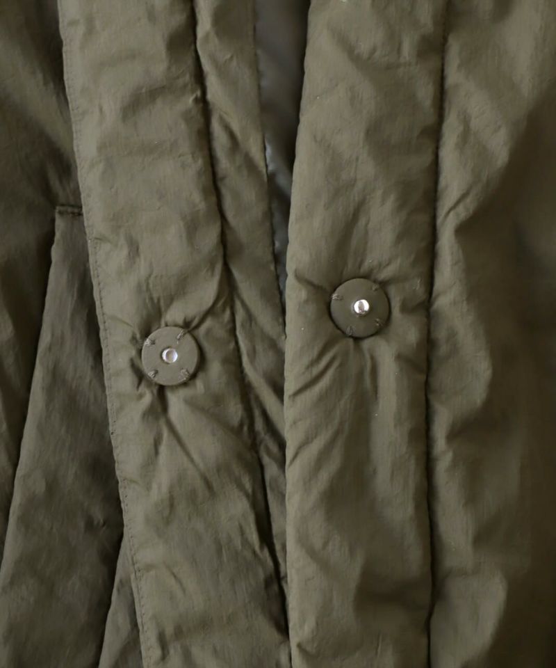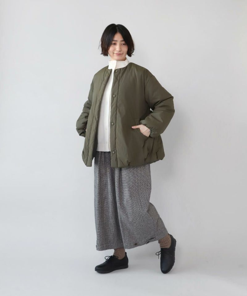 摩擦や摩耗に強く耐久性があり、シワも気になりにくいナイロンを使用した中綿コートです。 ノーカラーに裾ドロップショルダーでゆったりとした着心地。フロントは比翼仕立てですっきりと、裾に向けてふんわり広がるバルーンシルエットに。 中綿入りでボリューム感がありながら、とても軽くストレスなく着用可能。付属の取り外しの出来る薄中綿入りのマフラー付きで首元もあたたかく過ごせます。またベルトでウエストを絞れば、また違うシルエットを楽しめます。