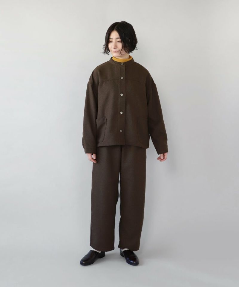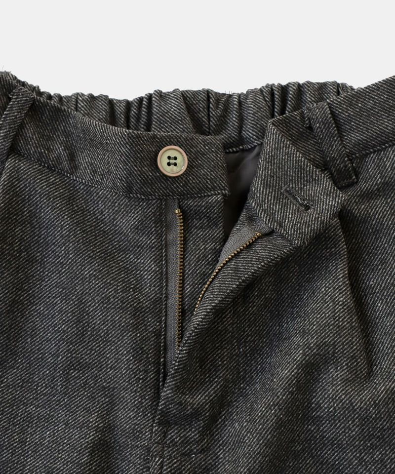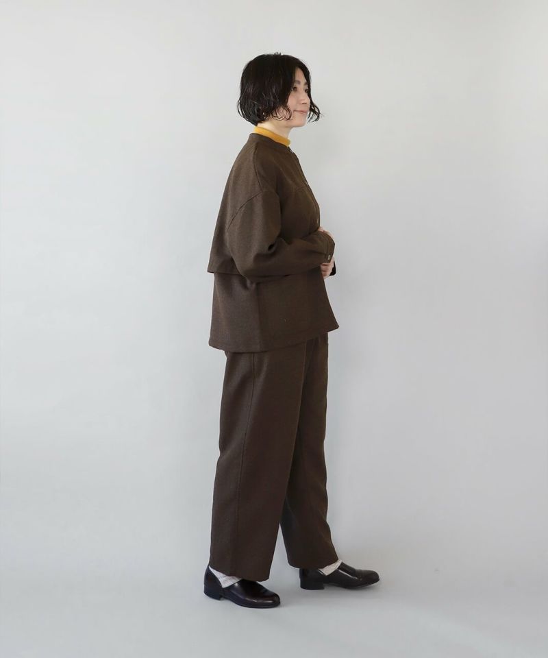 あたかみのあるツイードの風合いのウールミックス素材を使用したパンツです。裾に向けたテーパードシルエットですっきり見せてくれます。型崩れしにくくシワも寄りにくい素材で、裏地には高密度でハリがあるためちくちくしません。ウエストは後ろのみゴム仕様、ベルトループ付きのためジャストサイズで着用可能です。同素材のジャケットとのセットアップもおすすめです。