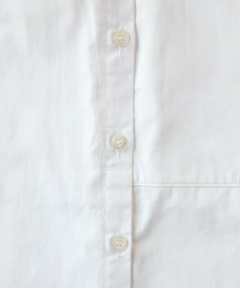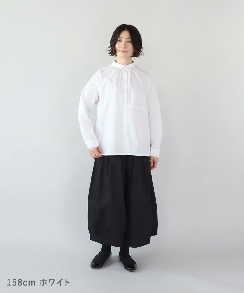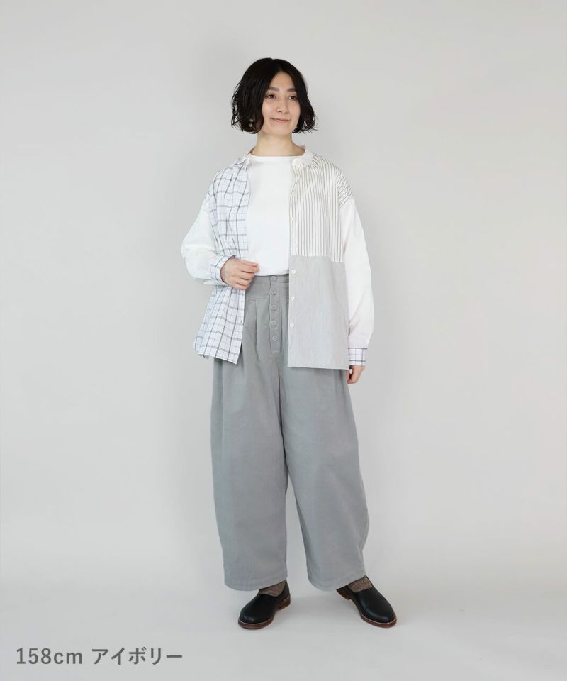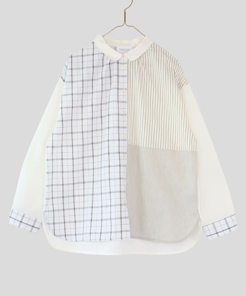 やわらかくなじみやすい先染めコットン生地のブラウスです。フロントの大胆なパッチワークが個性的で目を惹くデザインです。襟周りや後ろにギャザーを施し、ゆったりとしたシルエットに。裾は前後差をつけたラウンドヘムで、気になるラインをさりげなくカバーしてくれます。ブラウスとしてはもちろん、ボタンを開けて軽い羽織りとして重ね着もおすすめです。