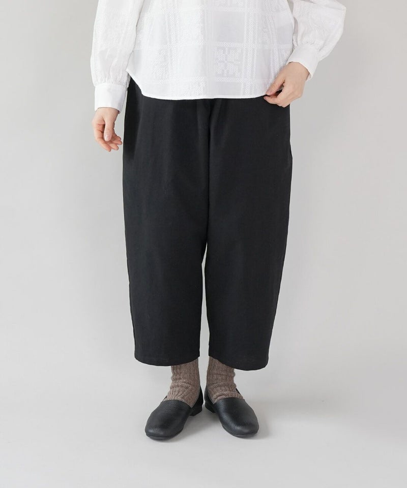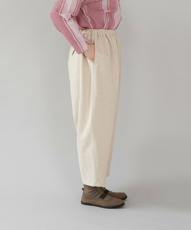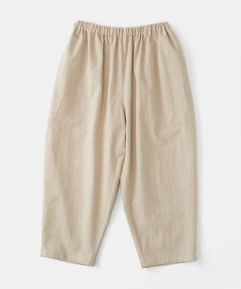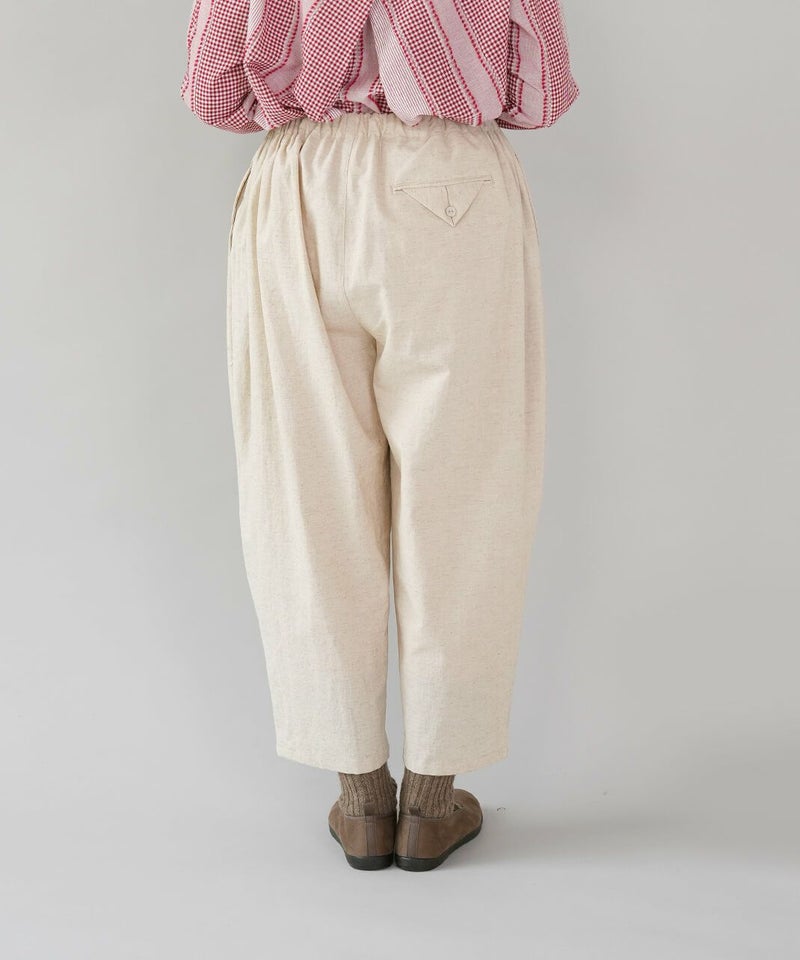 YURK geniet vanの定番、ゆるっとパンツ。ウエストにギャザーがたっぷりと入ったゴム仕様でよく伸び、ゆったりとした着心地です。内紐付きのためサイズ調整が可能です。リネンのシャリ感とコットンのやわらかさのある1着です。三角フラップのポケットがバックスタイルのポイントになります。パンツとしてもインナーパンツとしてもあわせやすく、1枚あると重宝します。