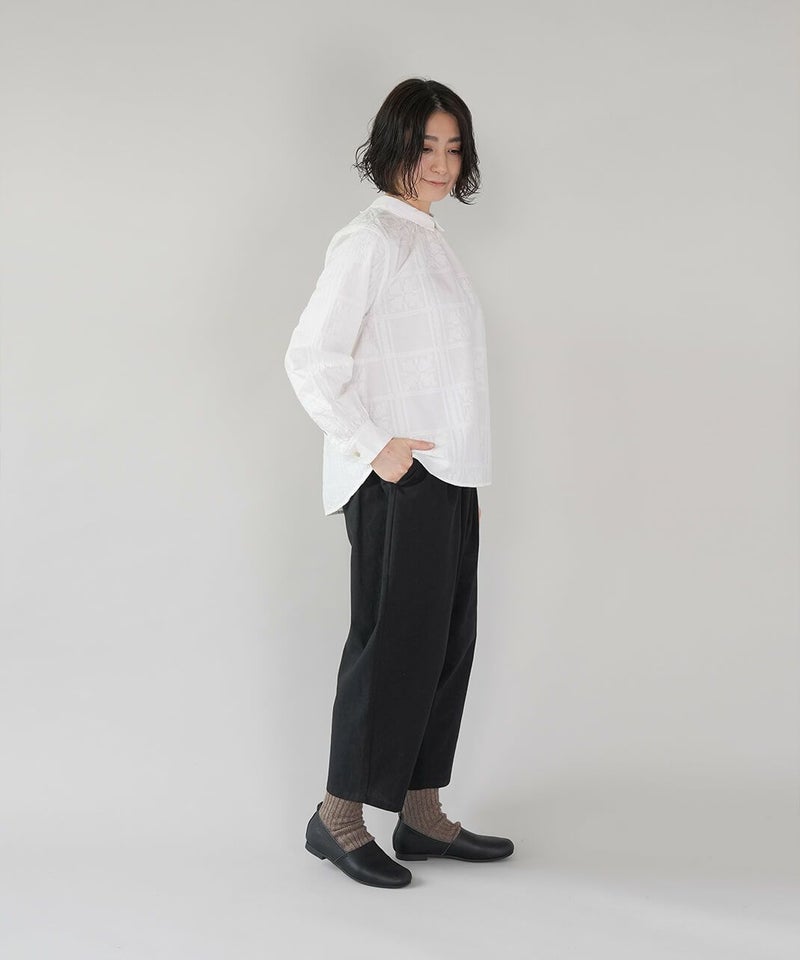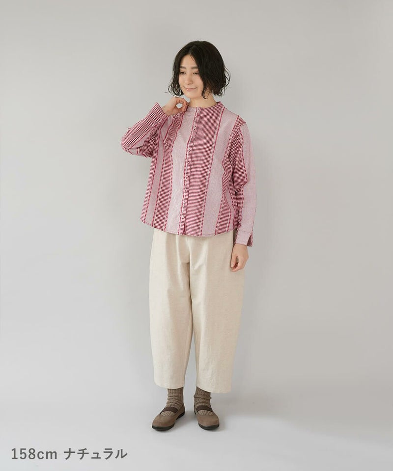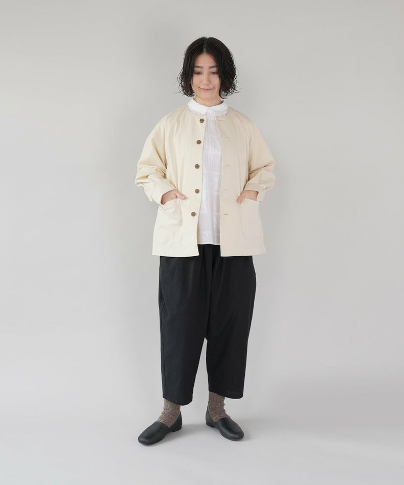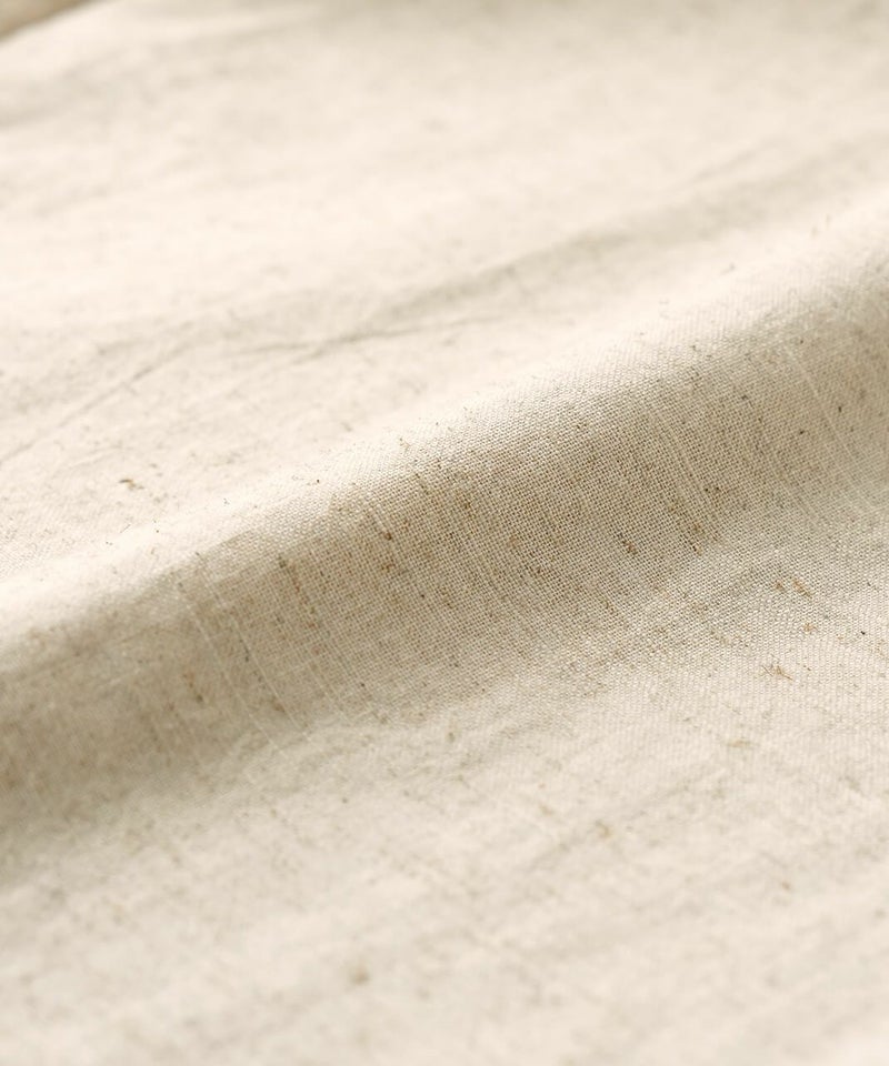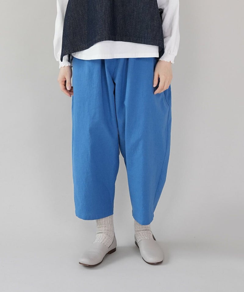 YURK geniet vanの定番、ゆるっとパンツ。ウエストにギャザーがたっぷりと入ったゴム仕様でよく伸び、ゆったりとした着心地です。内紐付きのためサイズ調整が可能です。リネンのシャリ感とコットンのやわらかさのある1着です。三角フラップのポケットがバックスタイルのポイントになります。パンツとしてもインナーパンツとしてもあわせやすく、1枚あると重宝します。