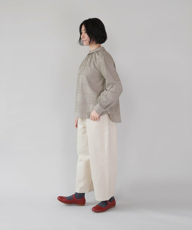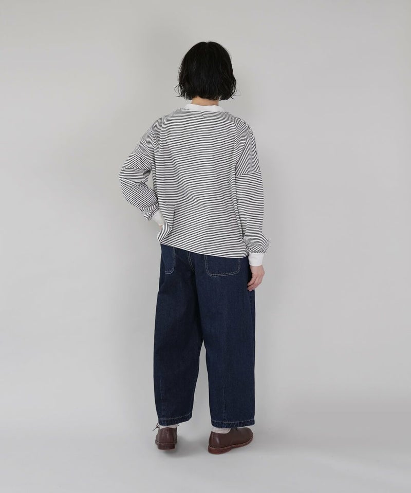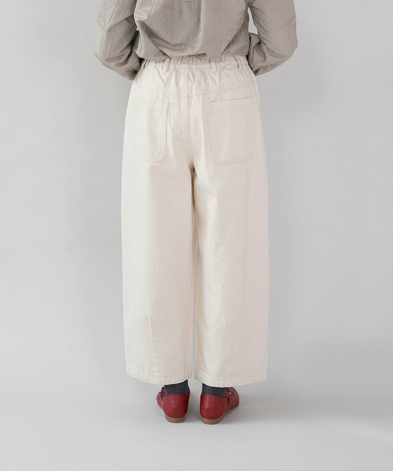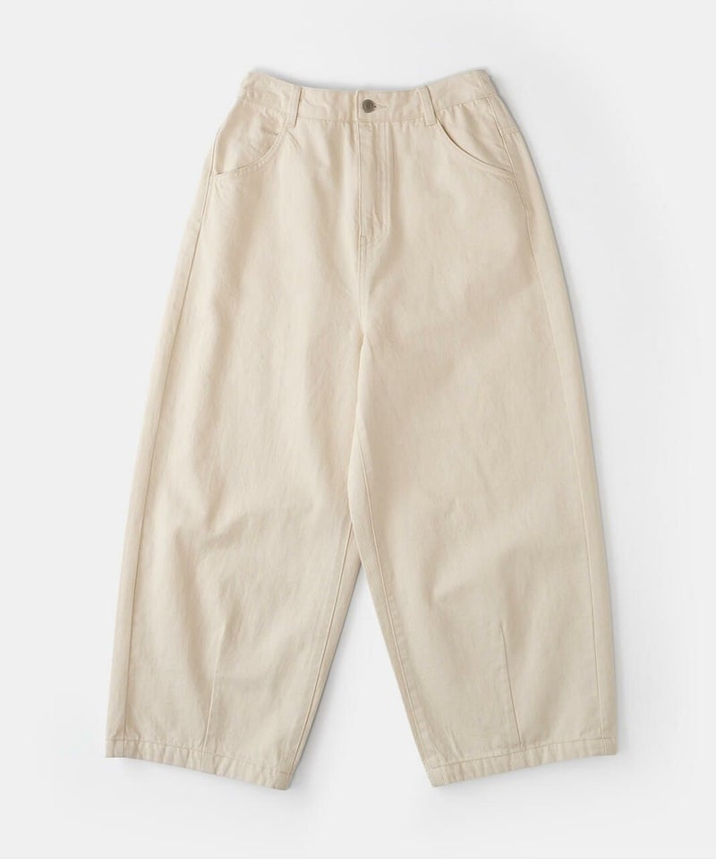 ほどよい厚みの10オンスデニムを使用したカーブパンツです 。裾にダーツが入ることで、立体的で丸みのあるワイドシルエットに仕上がっています。ウエストの後ろはゴム仕様でリラックスした着心地。ハイウエストデザインなので、シャツやインナーをインするスタイルもおすすめです。日常使いがしやすく、季節も問わず楽しめる1着です。