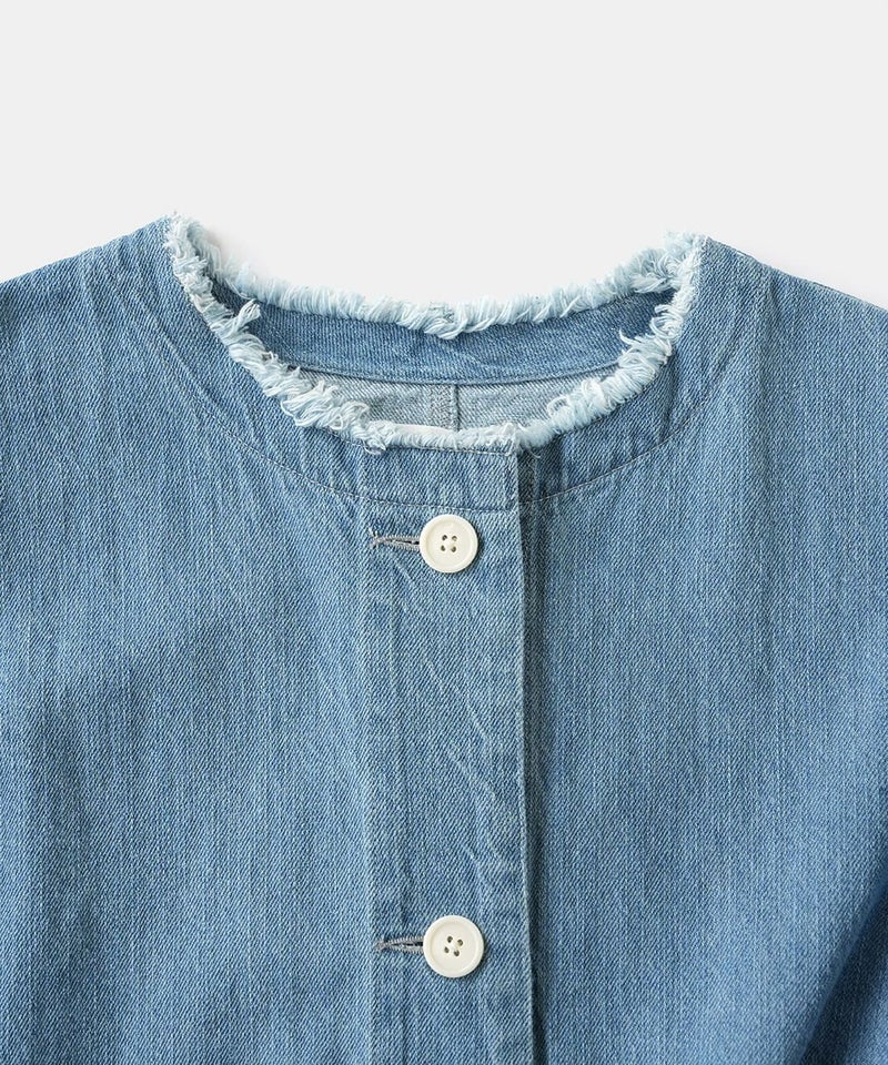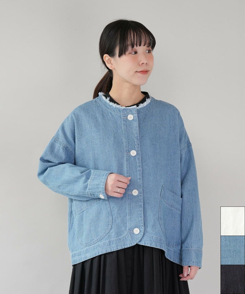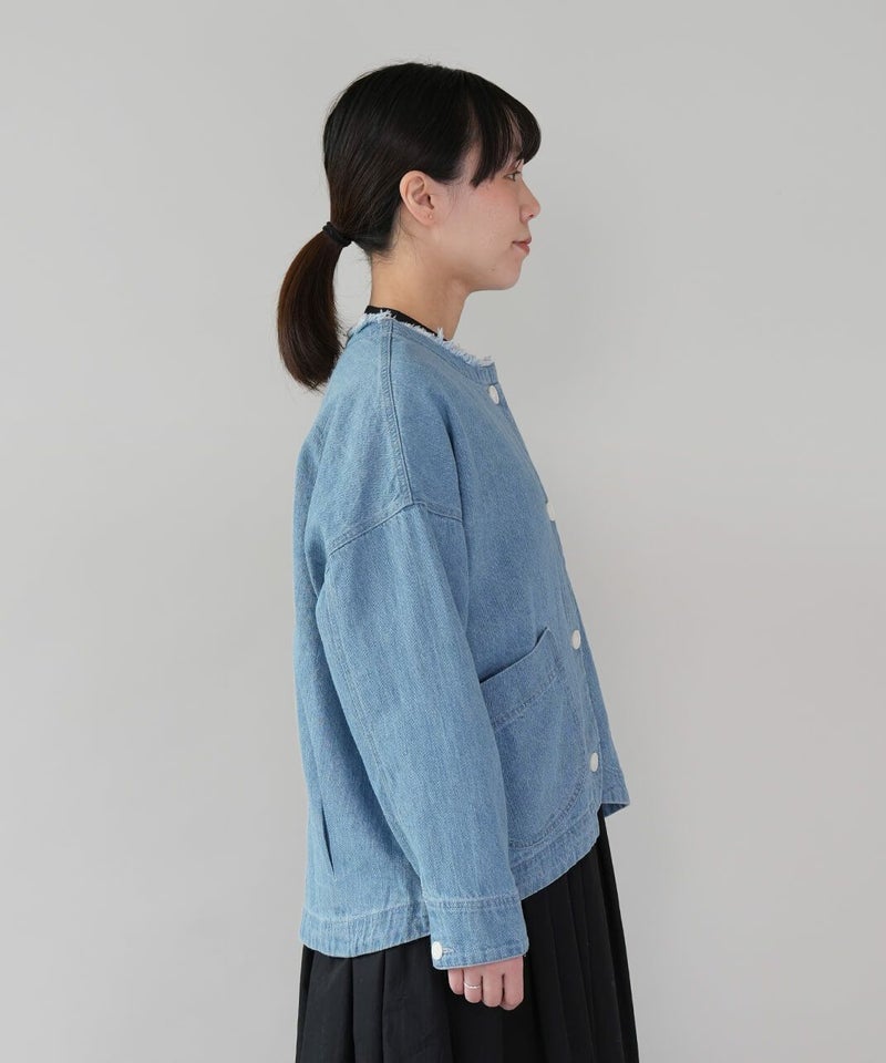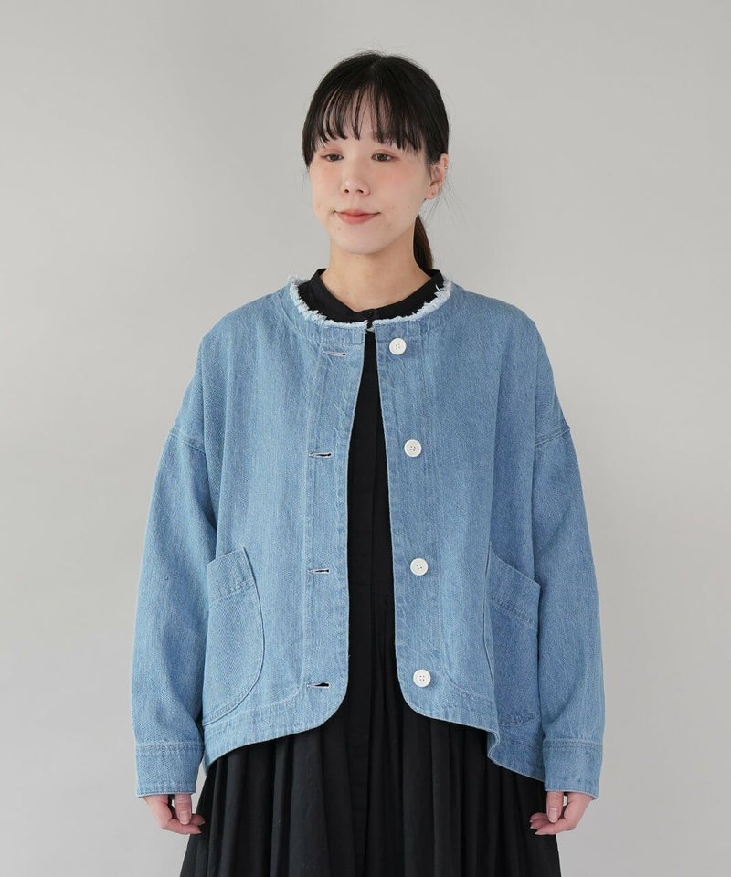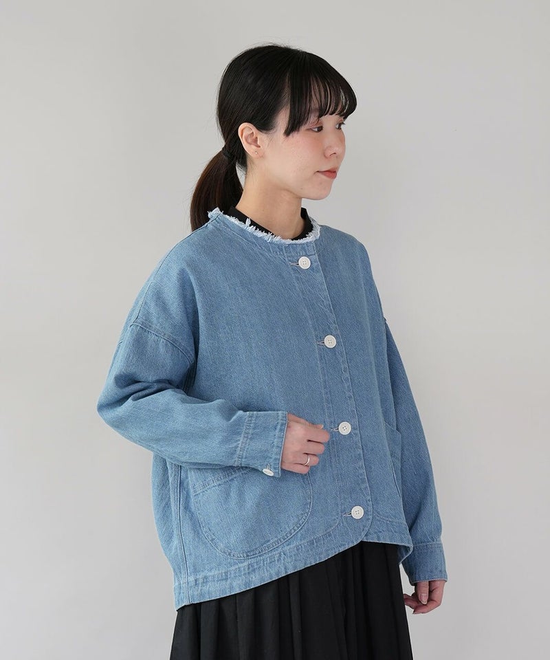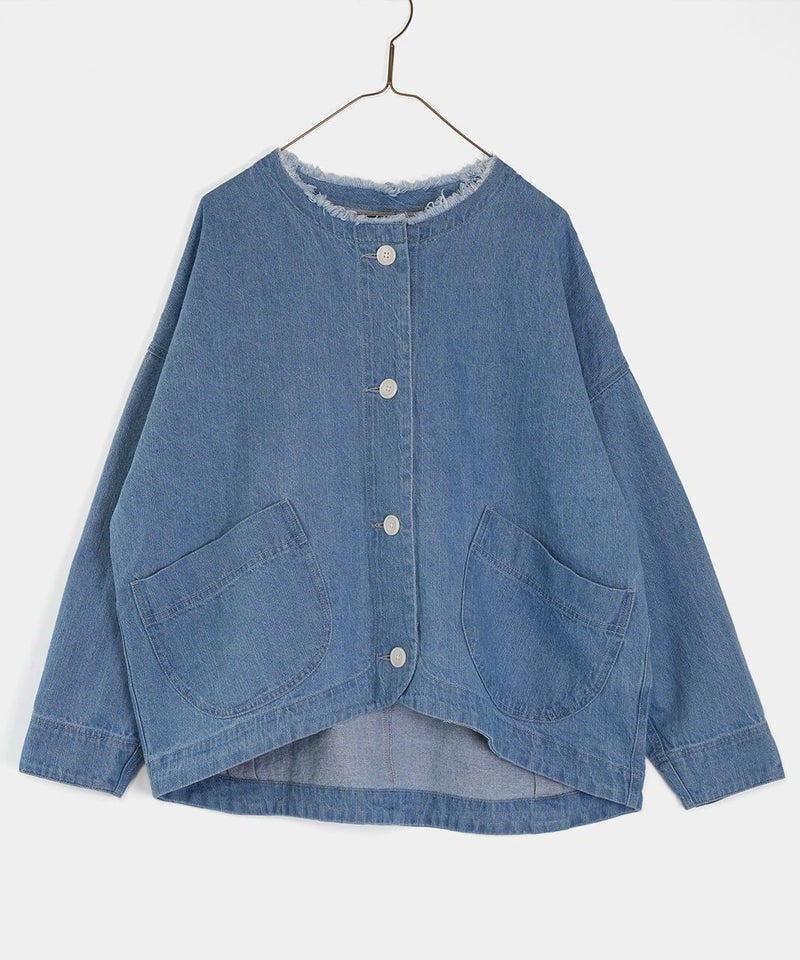 ほどよい厚みのさらりとしたコットンリネンデニムを使用したジャケットです。すっきりとしたノーカラーにフリンジ仕上げが可愛さをプラスしています。斜めにデザインされたポケットと少し大きめのボタンがアクセントに。後ろの裾にタックが施された丸みのあるシルエットで、前後差付きのラウンドヘム。緩やかなスタイルを演出してくれます。