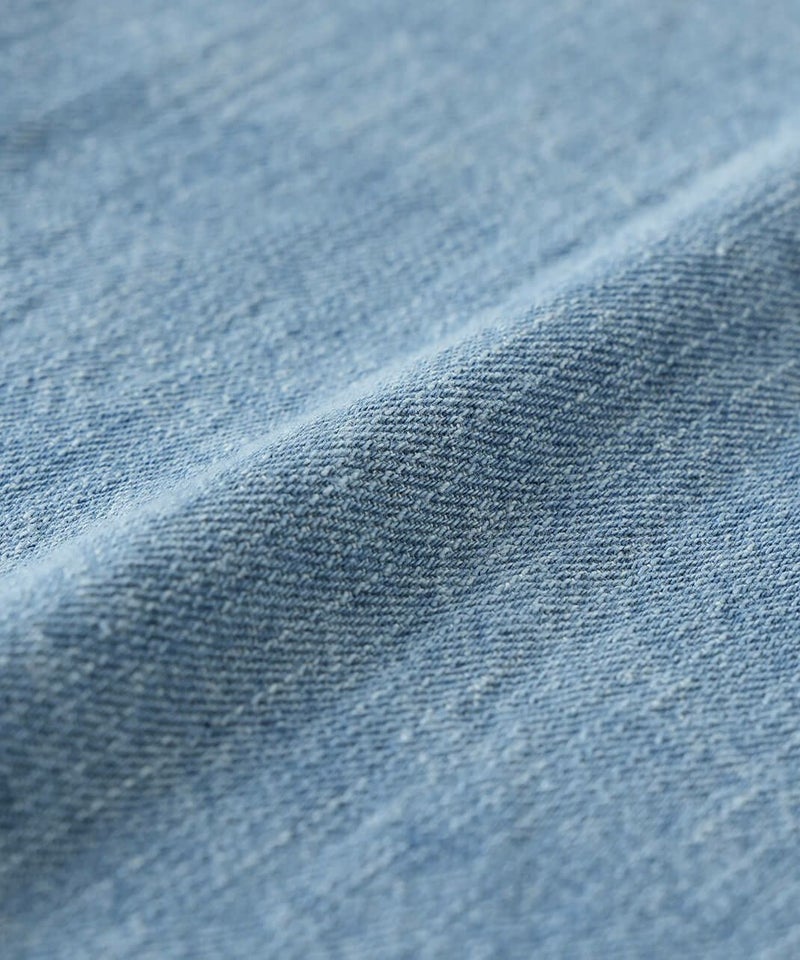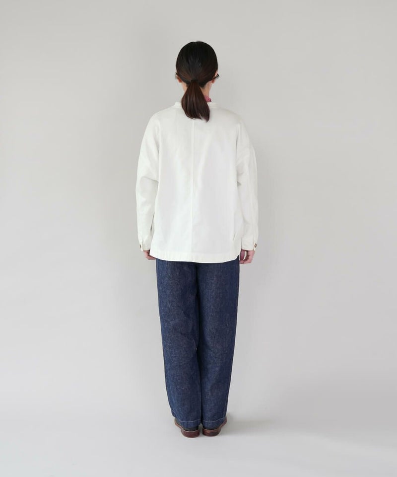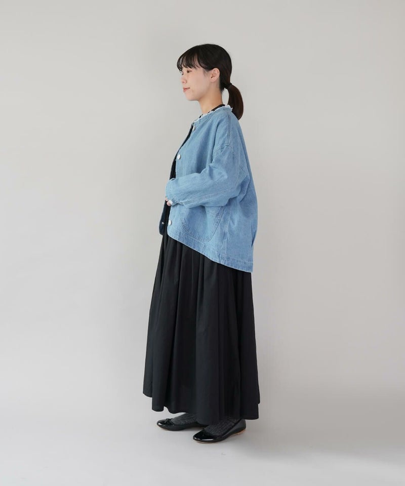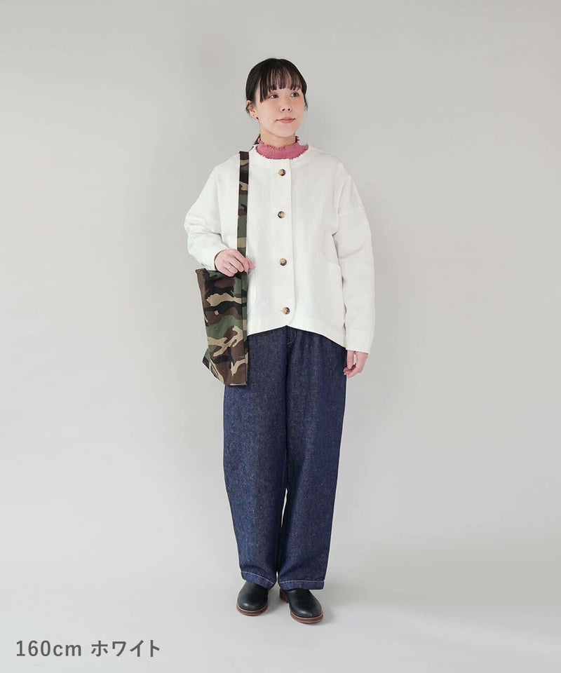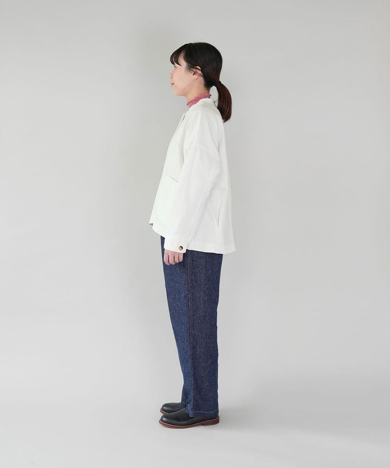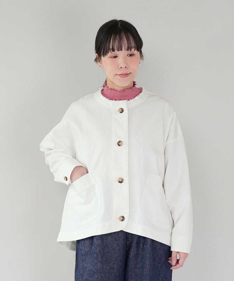 ほどよい厚みのさらりとしたコットンリネンデニムを使用したジャケットです。すっきりとしたノーカラーにフリンジ仕上げが可愛さをプラスしています。斜めにデザインされたポケットと少し大きめのボタンがアクセントに。後ろの裾にタックが施された丸みのあるシルエットで、前後差付きのラウンドヘム。緩やかなスタイルを演出してくれます。