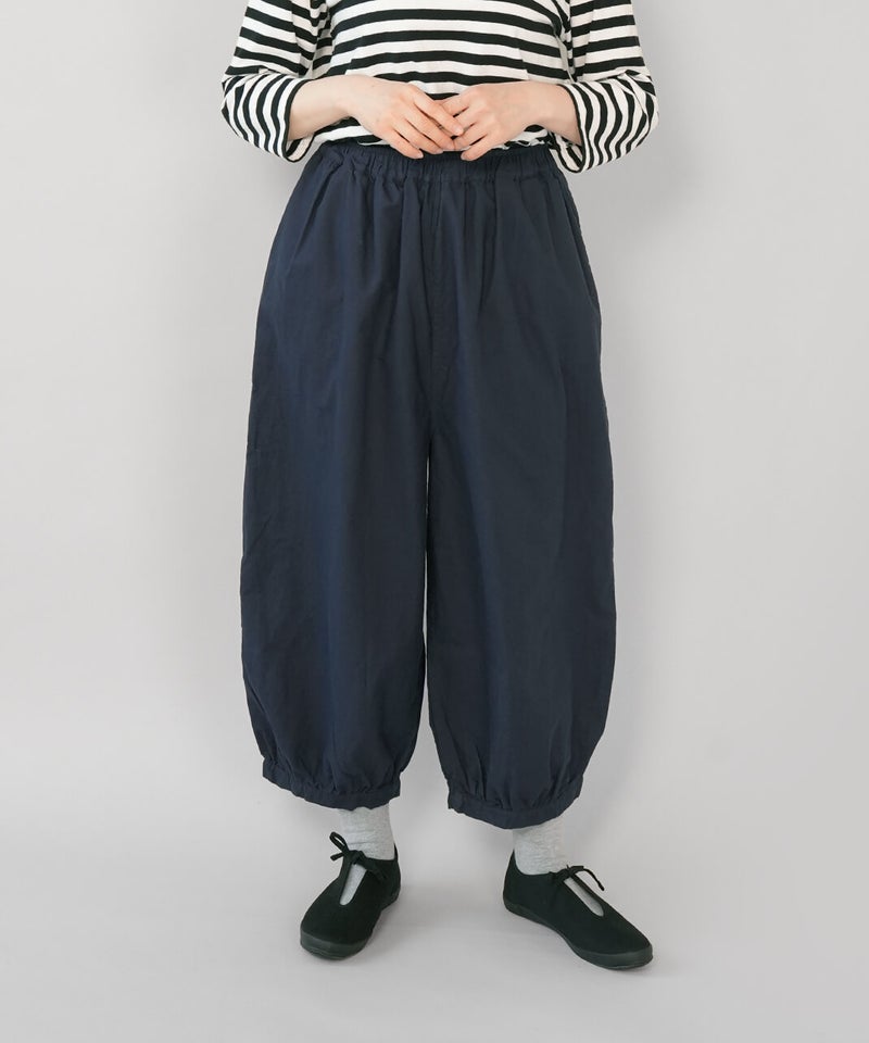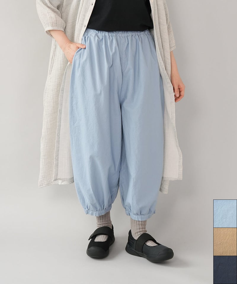 さらりとした肌ざわりで、やわらかなオックス生地のパンツです。国内の職人の手で、製品染めに。奥行きのある表情に仕上がっています。裾にはさりげなくギャザーを入れて、丸みのあるシルエット。立体感がありながらもシンプルなデザインです。ウエストはゴム仕様で、締めつけ感も少なくリラックスしたはき心地。1枚でパンツとしてはもちろん、ワンピースやスカートの下に合わせるペチパンツとしてもおすすめです。