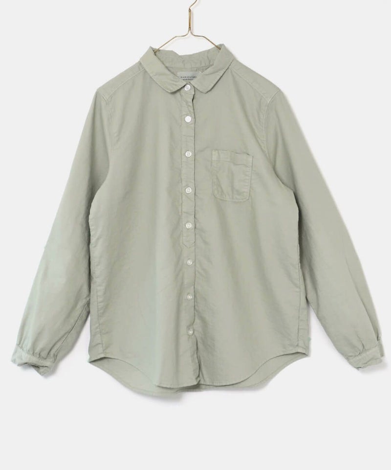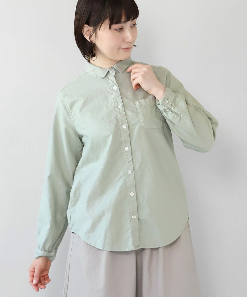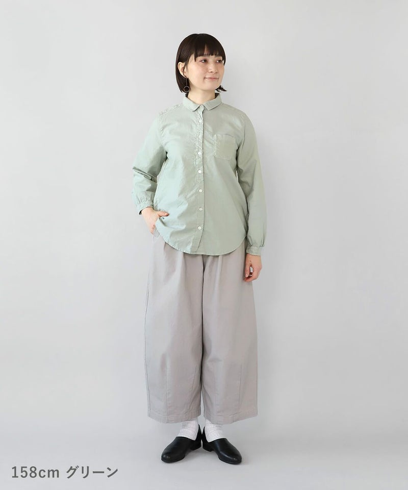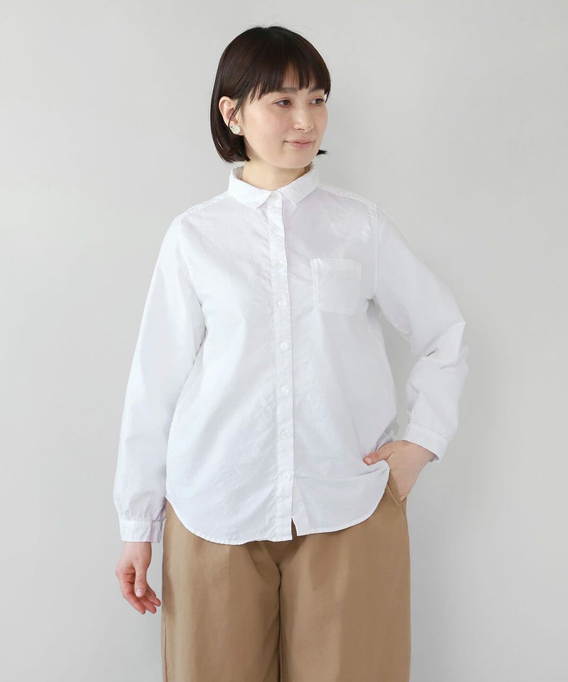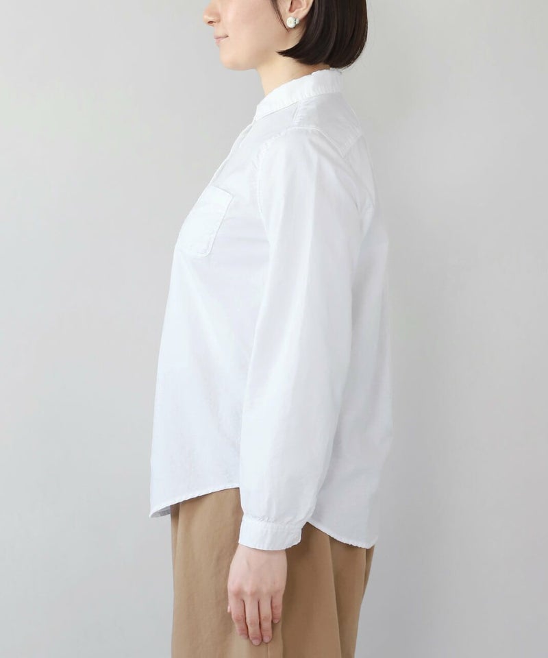 小ぶりな襟が可愛らしく、胸元のミニポケットがアクセントになったデザインです。コンパクトなサイズで清潔感があり、ワークシーンでの着用にもおすすめ。春先はベストとの重ね着を楽しんで下さい。