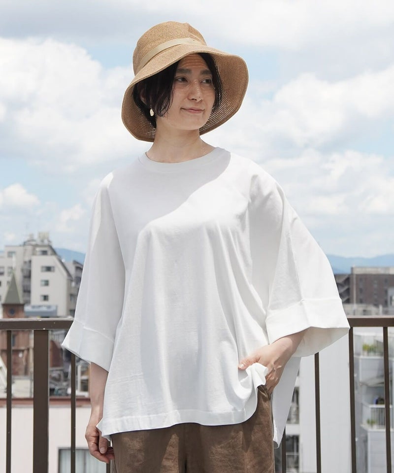 素材には、ひんやりとした接触冷感とUVカット加工を施したコットンを使用。 暑い季節でも心地よく過ごせる1枚です。シンプルなクルーネックが首元をすっきり見せ、1枚で様になるからコーディネートも楽ちん。 軽やかな素材感で、春から秋まで長く活躍してくれます。
