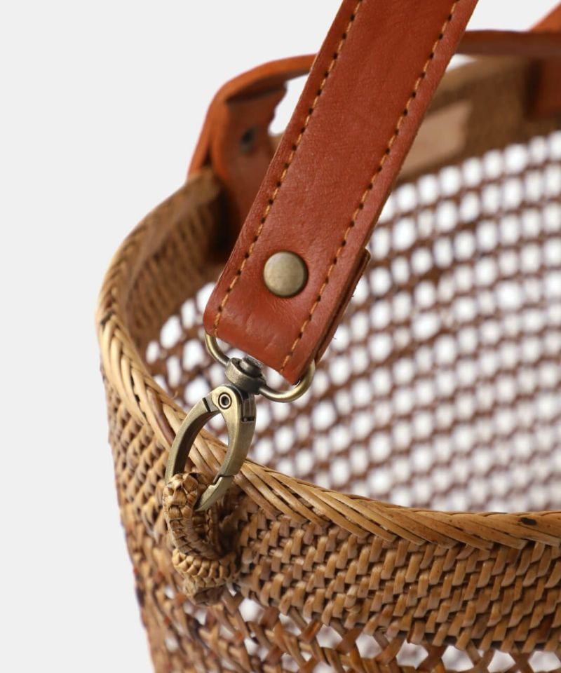 天然草木(アタ)を編み込んだバケツ型のかごバッグ。