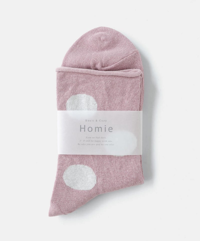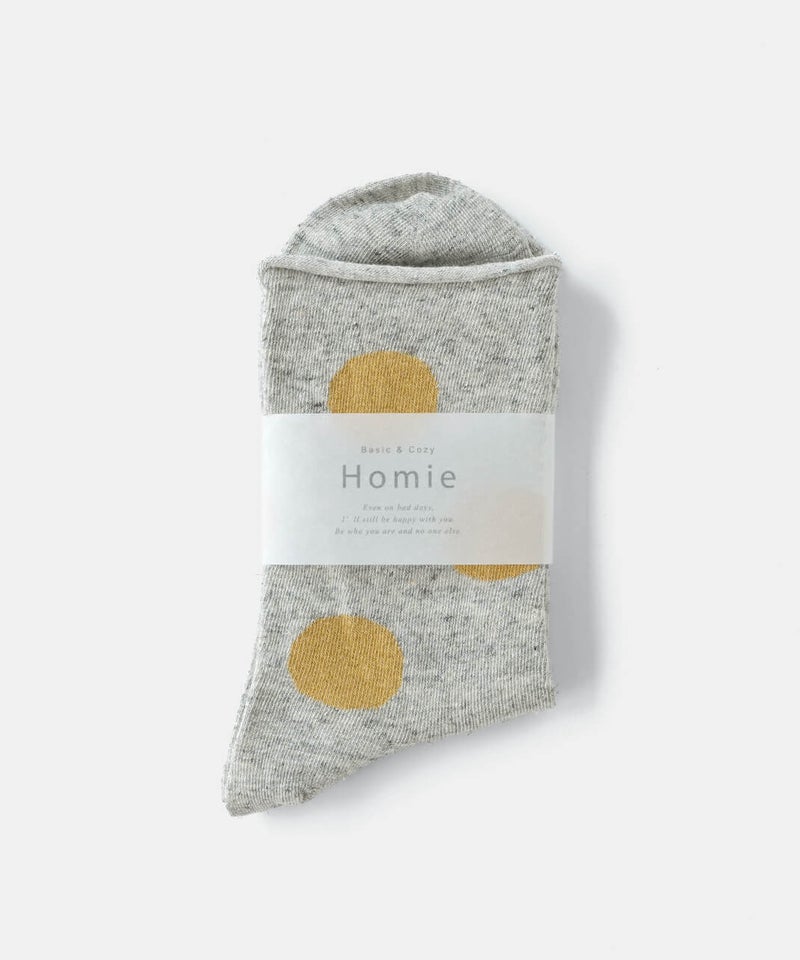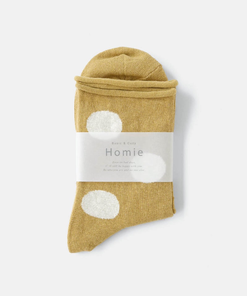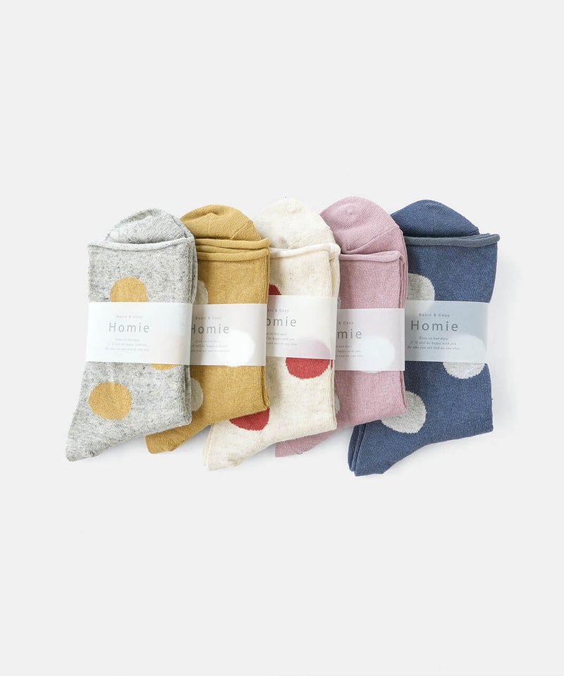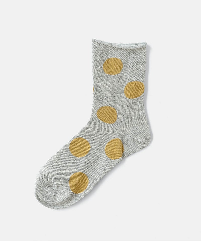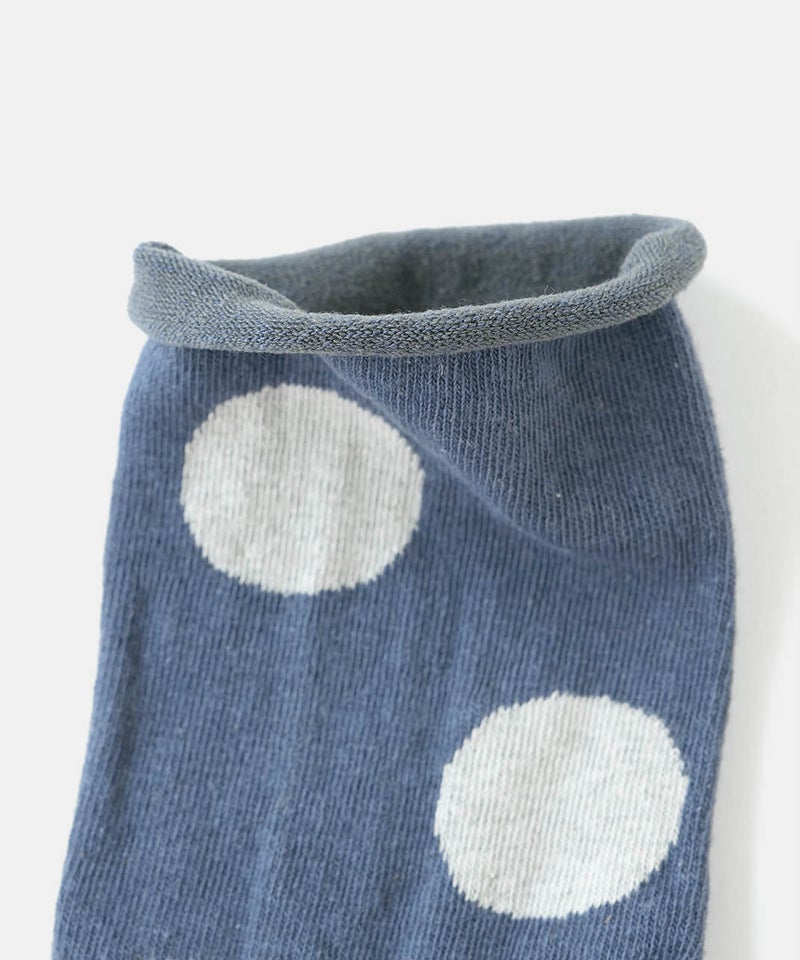 薄手の綿麻素材のドットソックス。履き口はくるっと丸まった仕様でしめつけ感もなく、通気性に優れたやさしい肌触りです。落ち着いたトーンの配色でコーディネートにも取り入れやすく、ミドルゲージなので幅広いシーズンで着用可能です。[ATTENTION]靴下の特性上、色や柄の切り替え部分や、履き口のゴム部分は糸の端末が裏側に出ていることがございます。着用やお洗濯によって、この糸端が表に飛び出してしまうことがあります。この糸を切ってしまうと、ほつれの原因になりますので、切らずに内側へ入れ込んでください。