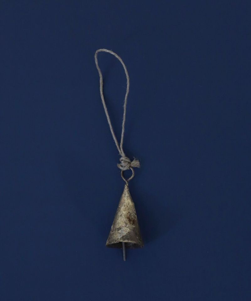 インドから届いたとんがり帽子のようなデザインのベル。 アンティーク調のくすんだ色合いで趣があり、ひとつひとつハンドメイドで音色が違うのも魅力です。 大きさはS・Mの2サイズ。 ドアや窓辺にぶら下げたり、グリーンに吊るしてもいいですね。 ホリデイシーズンにはスワッグと一緒にリボンで結んでも素敵です。
