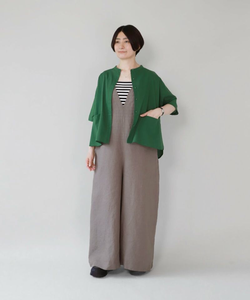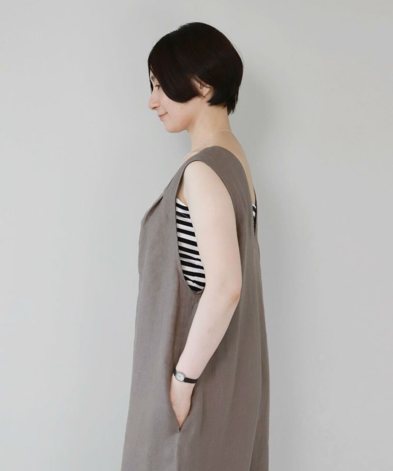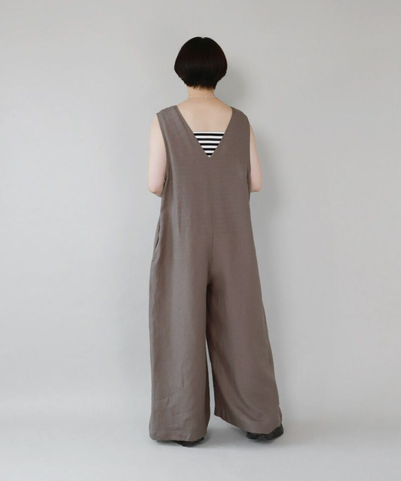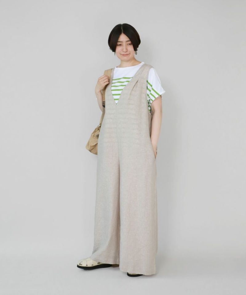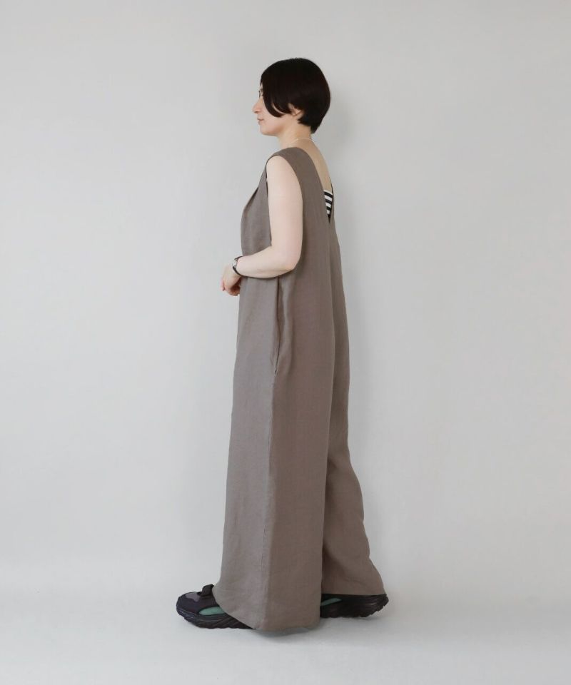 程よいハリと通気性の良さが心地よい平織リネンを使用したオールインワンです。 すっきりとした深めのVネックのワイドストレートシルエットでゆったりとした着心地。リネンならではのネップやシワがナチュラルでリラックスした雰囲気を演出してくれます。 カットソーやブラウスなどアイテム次第で、カジュアルからシンプルなナチュラルコーディネートまで幅広く対応する1着です。ノースリーブのため1年を通して長く着られるのも嬉しいポイント。