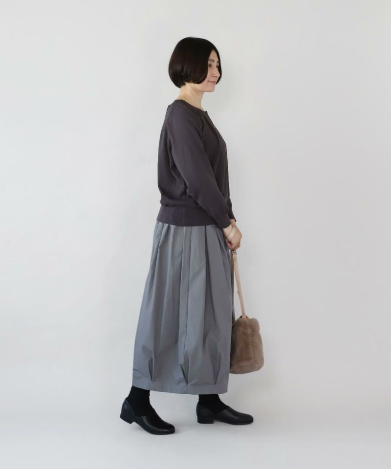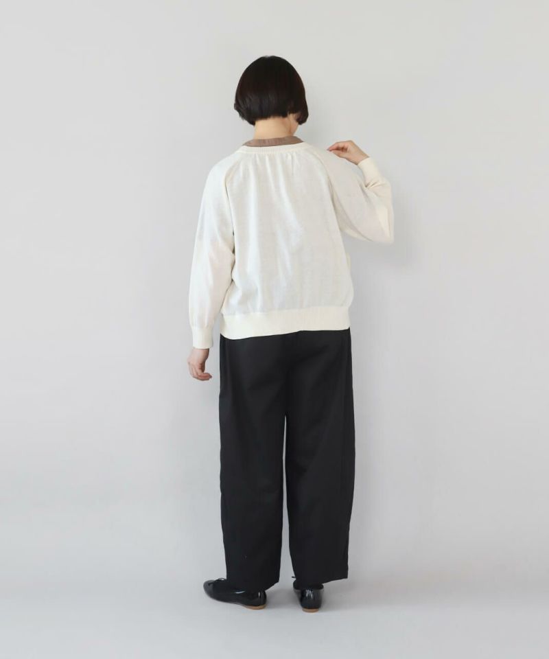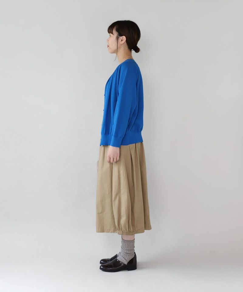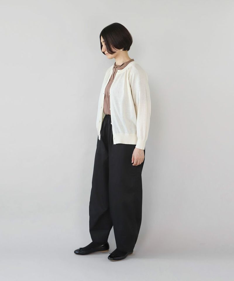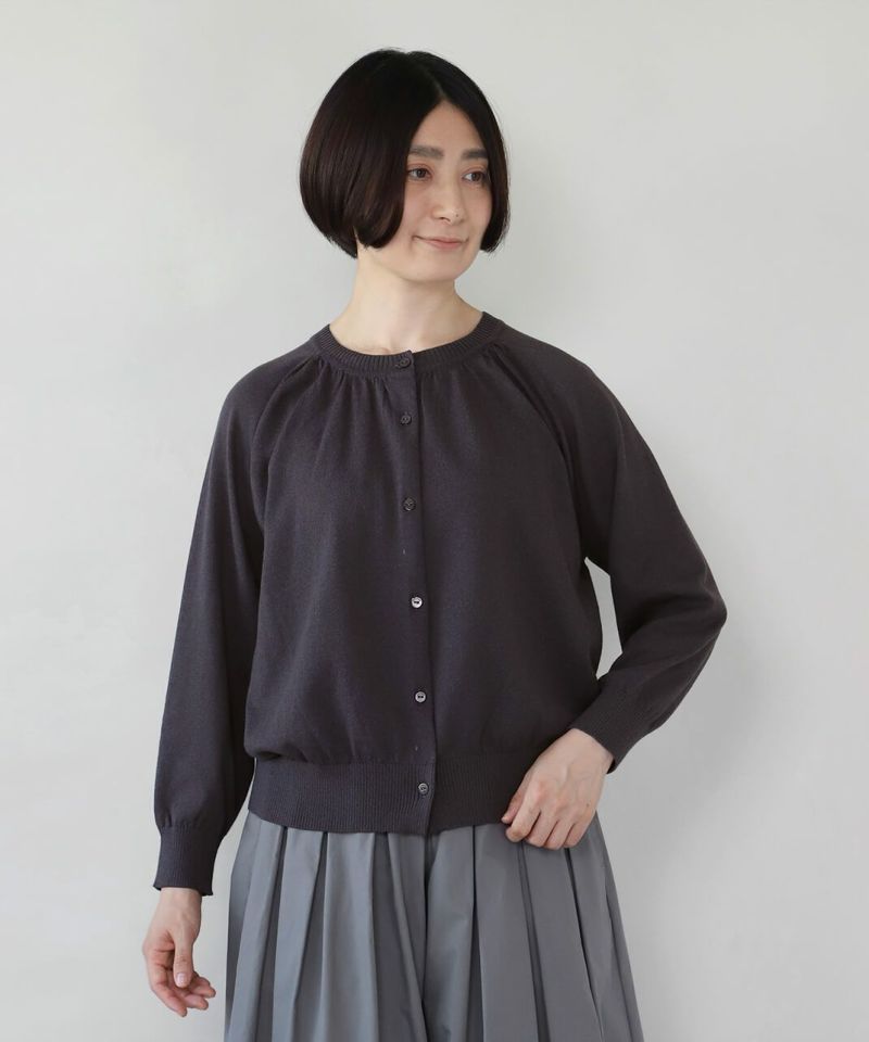 コットン強撚糸を使用し、ドライな肌触りのカーディガンです。 襟ぐりと裾・袖にギャザーが入ることで、ふんわりと軽い着心地に。コンパクトでシンプルなデザインです。ほどよいシアー感はこれからの季節におすすめの1着です。