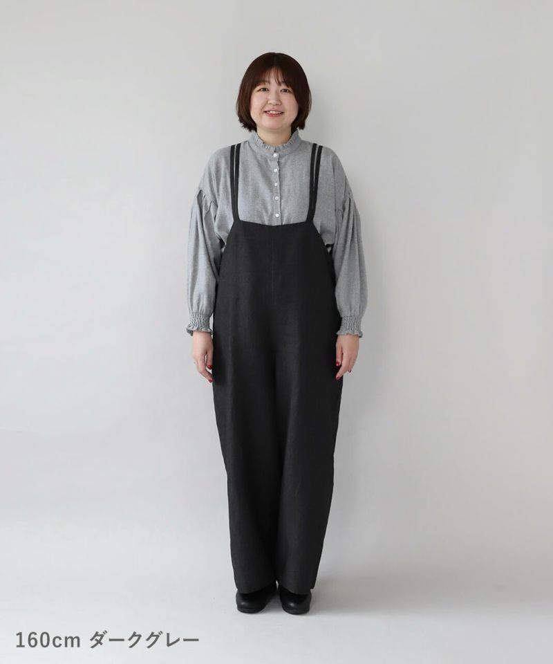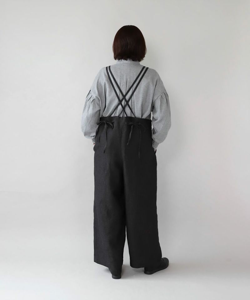ハリのある太番手のリネン糸を使用したサロペットです。 ゆったりとしたシルエットでリラックスした着心地。二重になった細い肩紐が華奢でおしゃれな印象を演出してくれます。後ろのリボン結びがコーディネートのアクセントになります。紐の長さはそのリボンで調整可能です。リネン特有のナチュラルな風合いがカジュアルにもキレイめにもスタイリングできます。