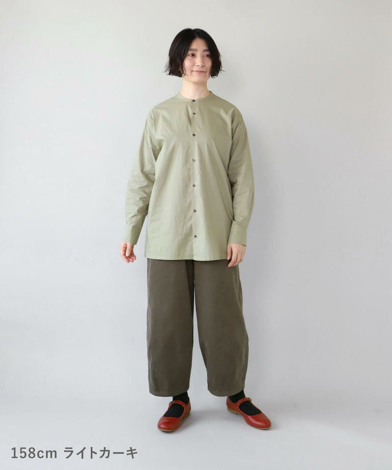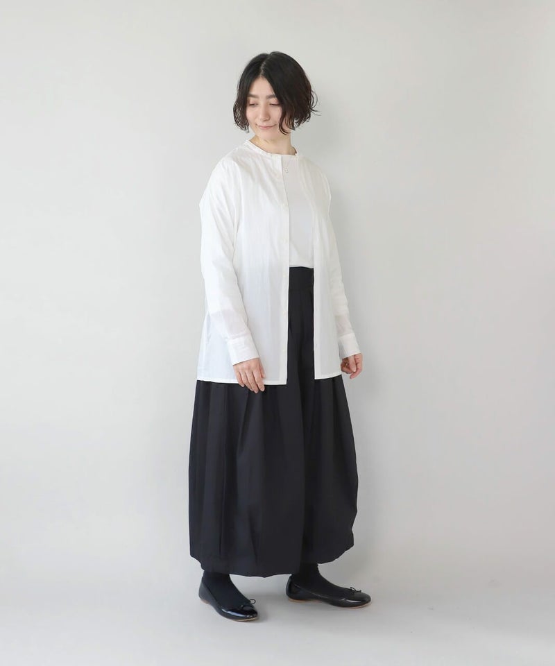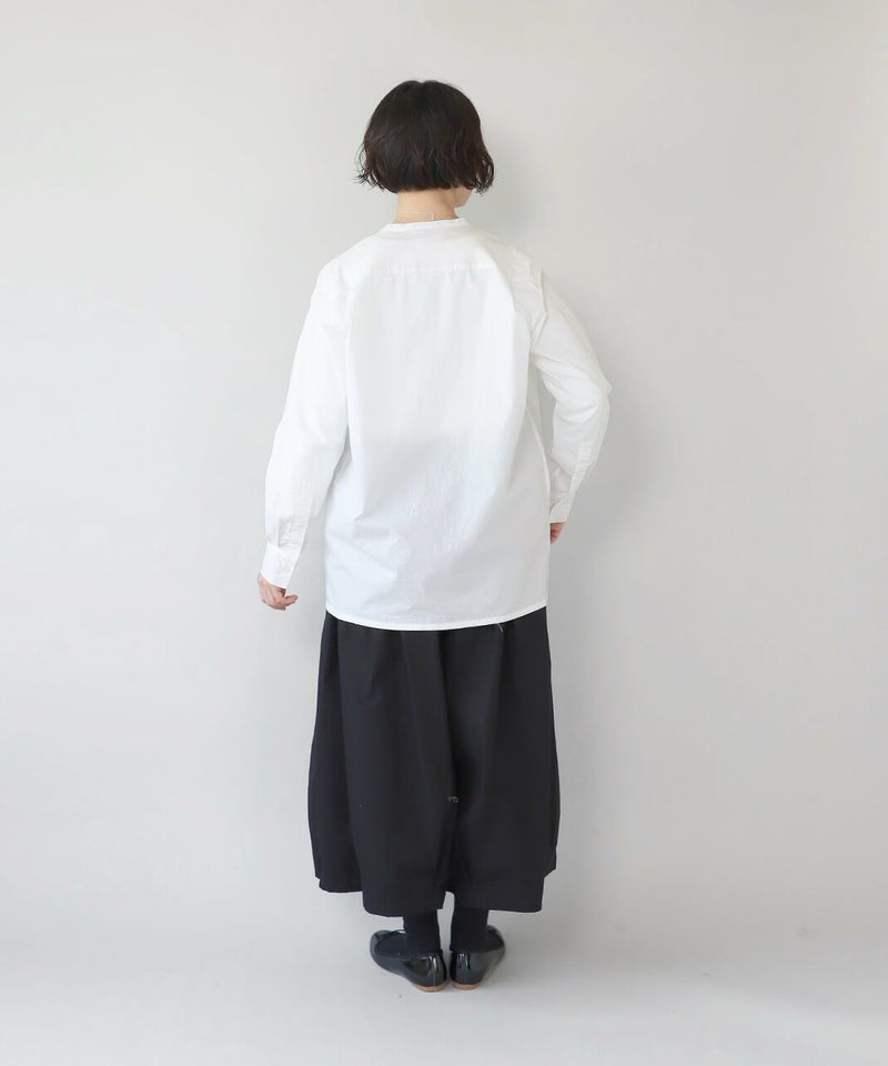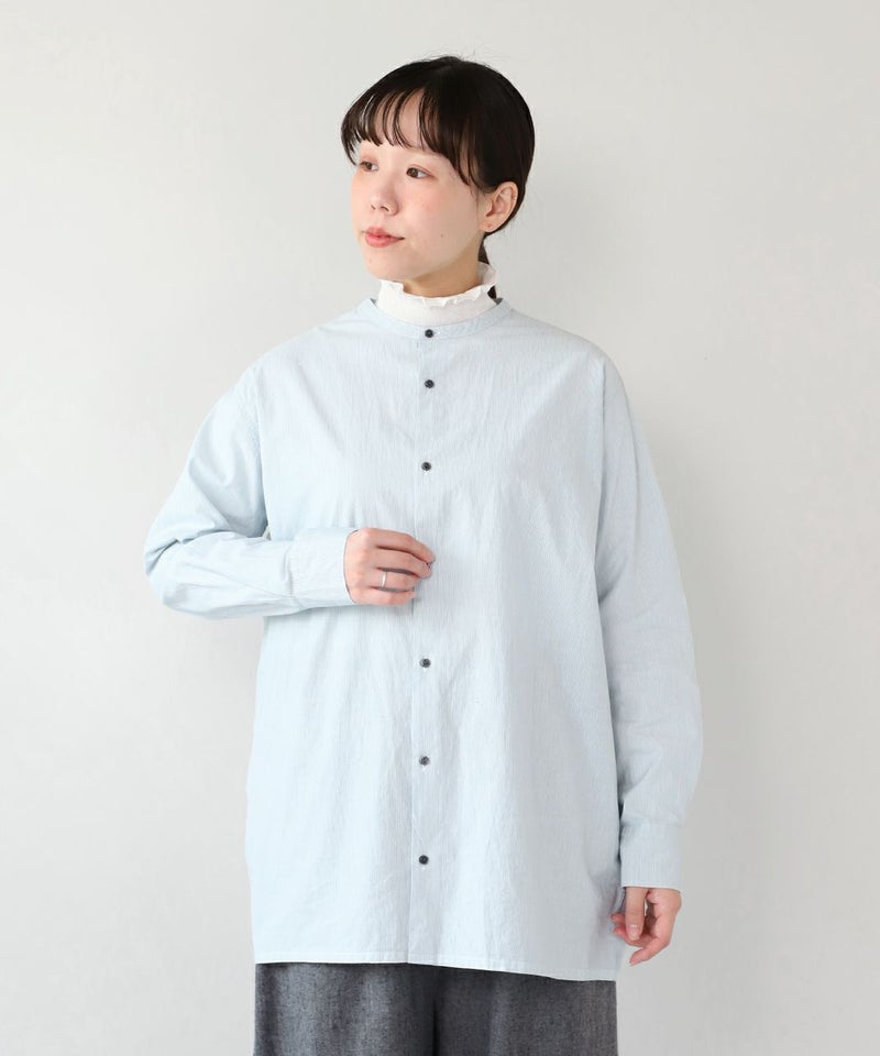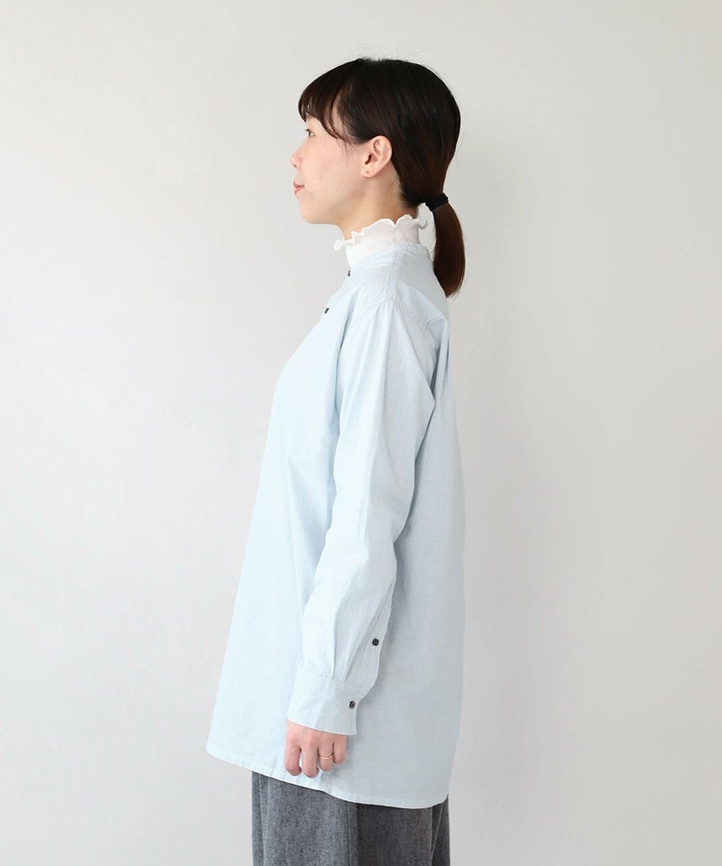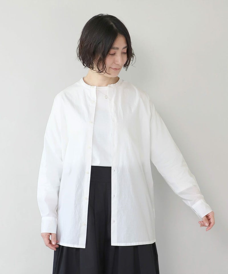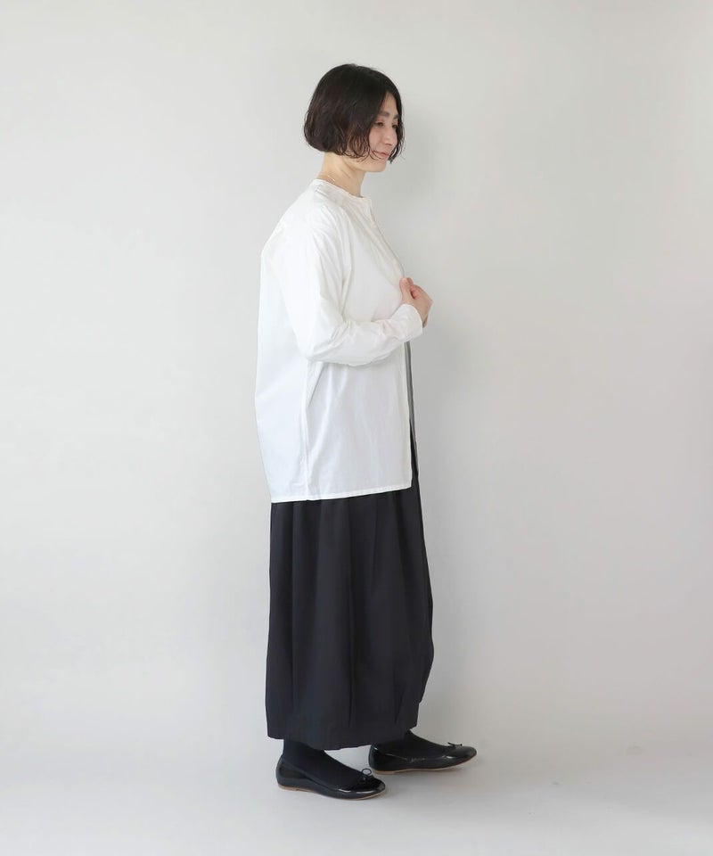 やわらかなコットン生地のバンドカラーチュニックです。 シンプルな細めのバンドカラーにドロップショルダーで、すっきりとしながらもゆとりのある1着です。チュニック丈はレイヤーを楽しみながら、おしり周りもカバーしてくれます。両サイド裾のゆるやかなラウンドカット仕上げもポイントです。1枚持っておけば、定番として一年中着用できます。