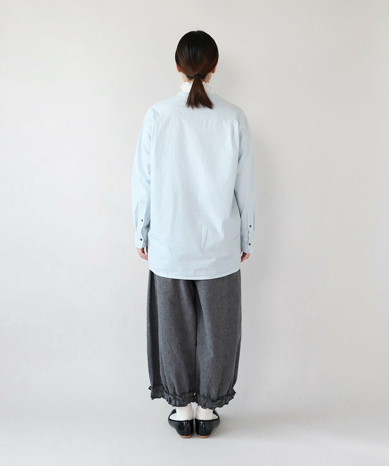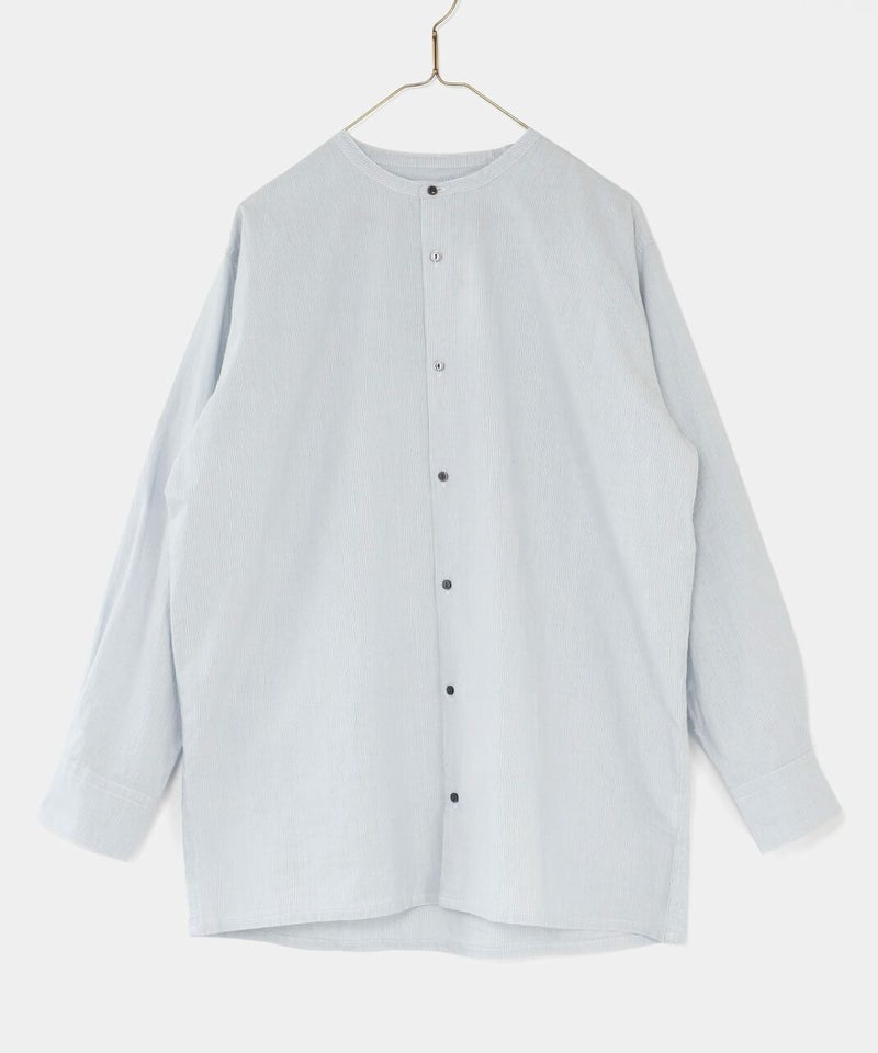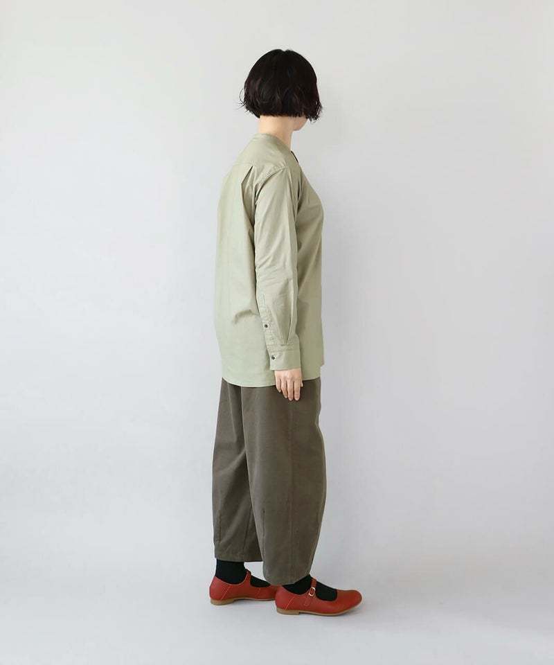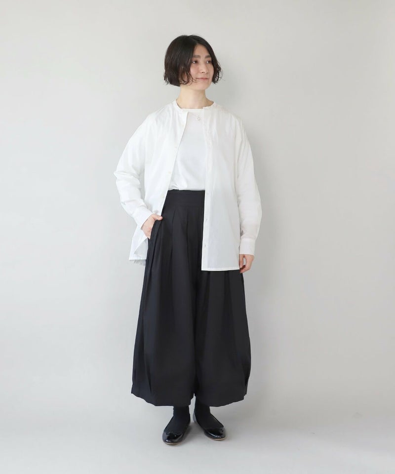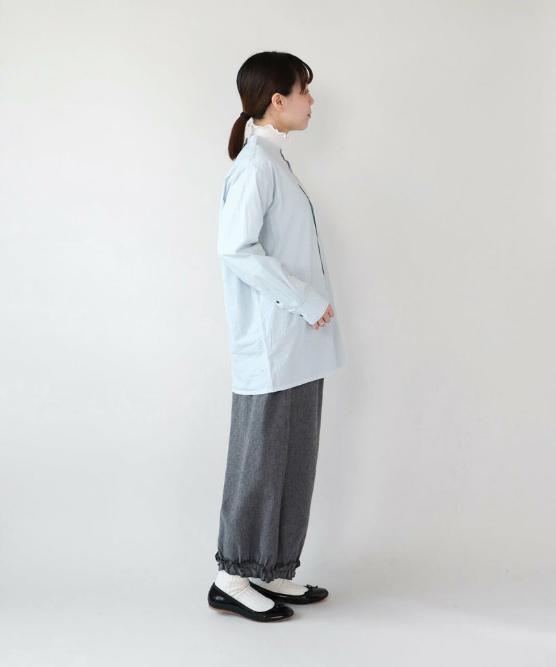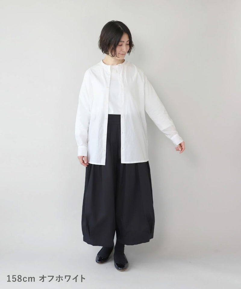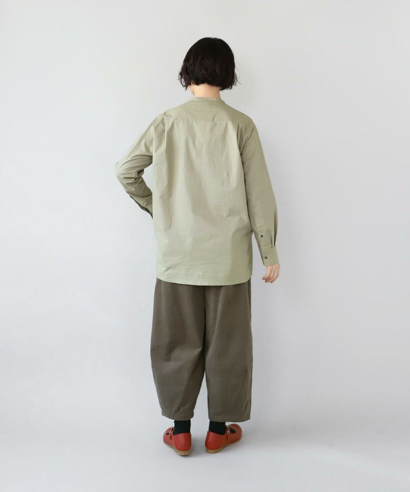 やわらかなコットン生地のバンドカラーチュニックです。 シンプルな細めのバンドカラーにドロップショルダーで、すっきりとしながらもゆとりのある1着です。チュニック丈はレイヤーを楽しみながら、おしり周りもカバーしてくれます。両サイド裾のゆるやかなラウンドカット仕上げもポイントです。1枚持っておけば、定番として一年中着用できます。