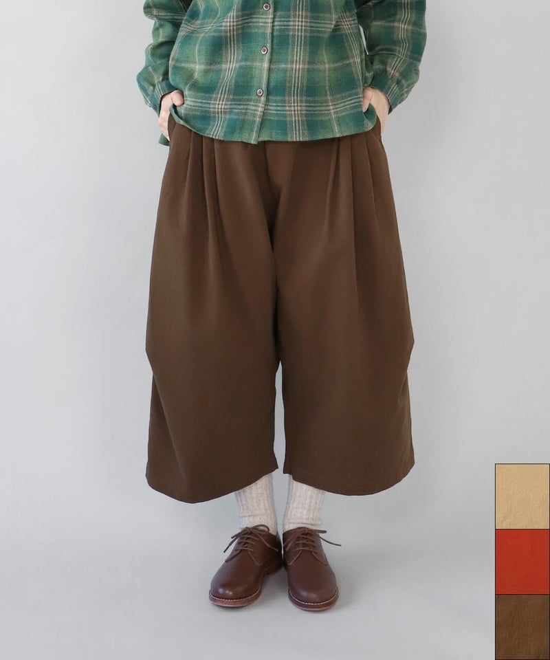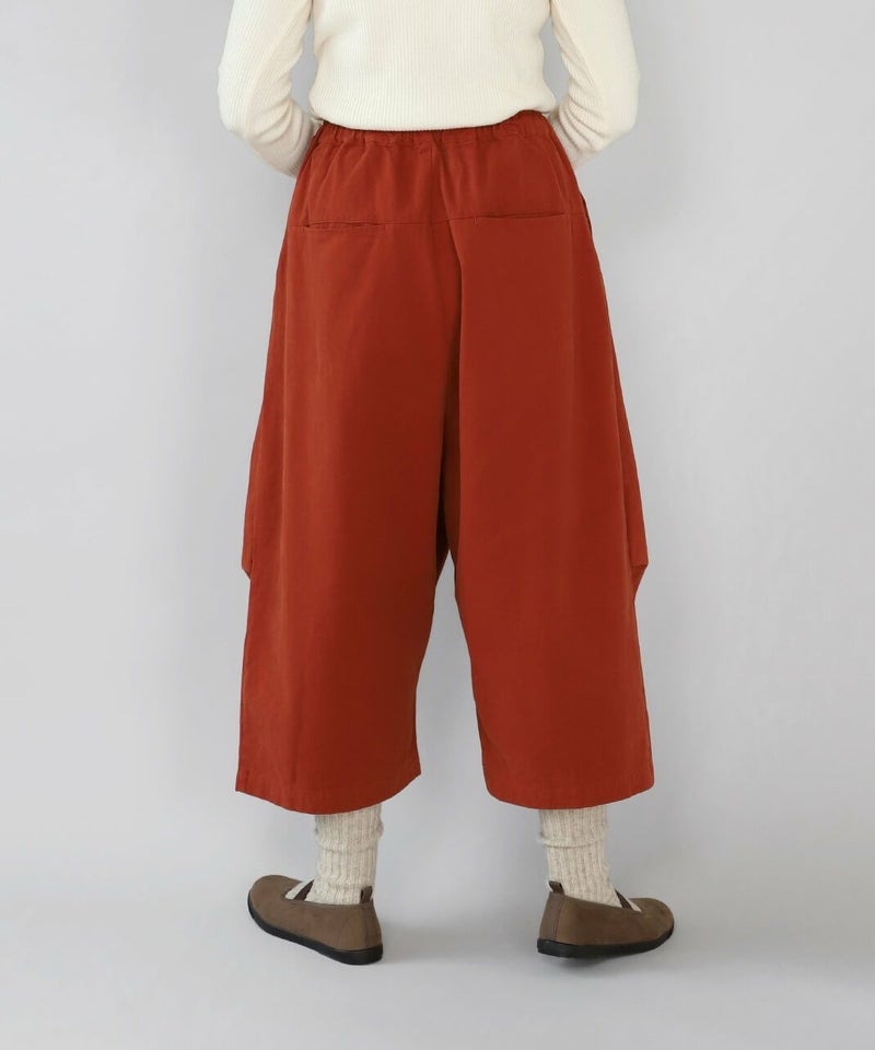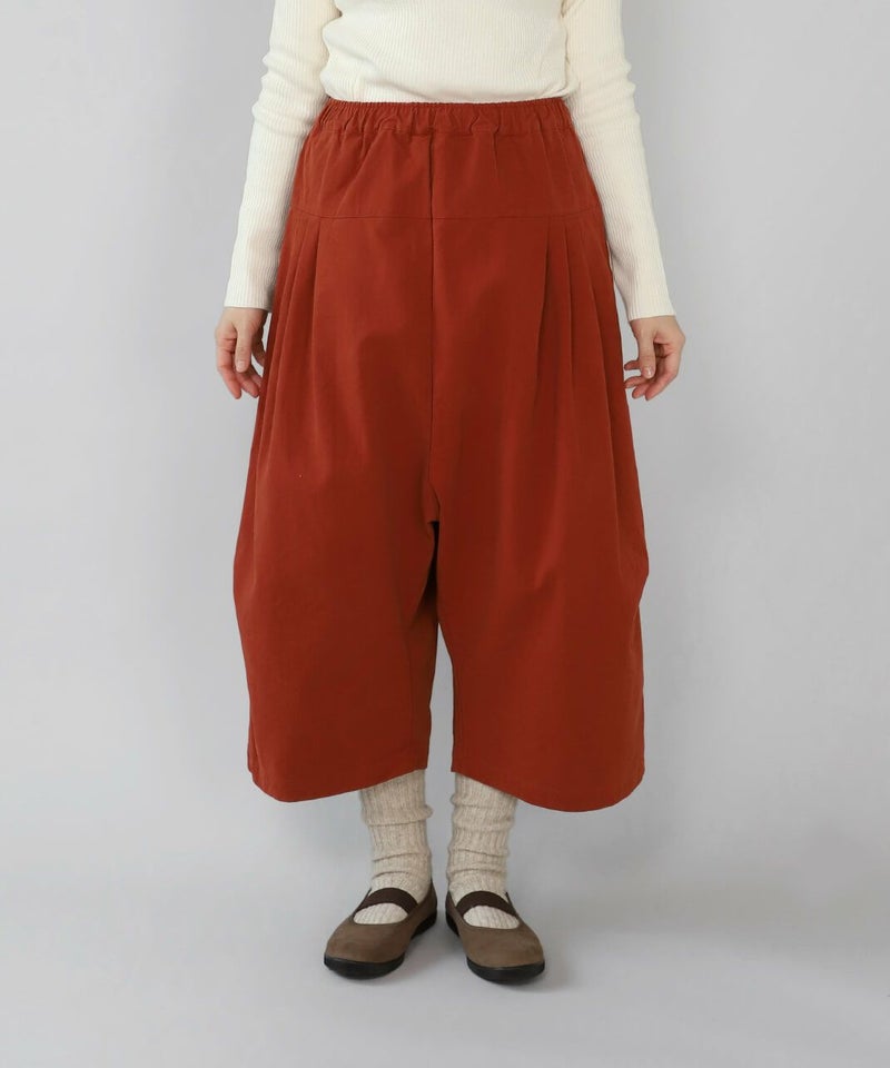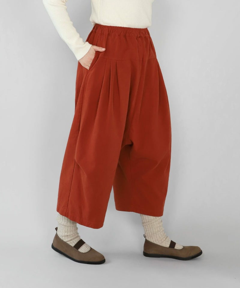 柔らかで密度のあるソフトコットン素材を使用したサルエルパンツです。生地表面にピーチ起毛を施したなめらかな肌触り。腰とすねにタック切替が、裾に向かってふんわりとしたコクーンシルエットに。サルエルの深めの股が上ゆったりとした履き心地です。ウエストはぐるりとゴム仕様で内紐付きのためサイズ調整可能です。サイドとバックにポケット付き。足首が見える丈感は靴下選びも楽しめます。