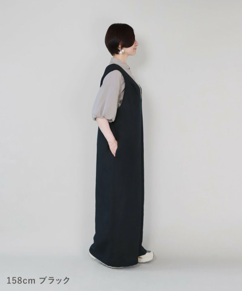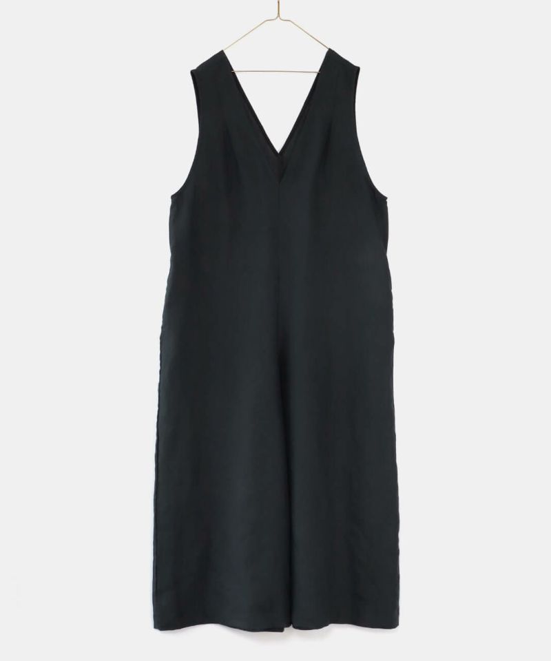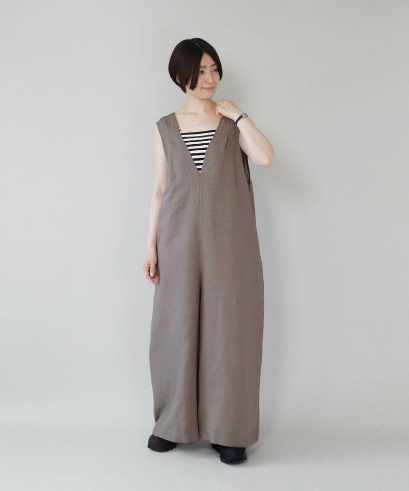 程よいハリと通気性の良さが心地よい平織リネンを使用したオールインワンです。 すっきりとした深めのVネックのワイドストレートシルエットでゆったりとした着心地。リネンならではのネップやシワがナチュラルでリラックスした雰囲気を演出してくれます。 カットソーやブラウスなどアイテム次第で、カジュアルからシンプルなナチュラルコーディネートまで幅広く対応する1着です。ノースリーブのため1年を通して長く着られるのも嬉しいポイント。