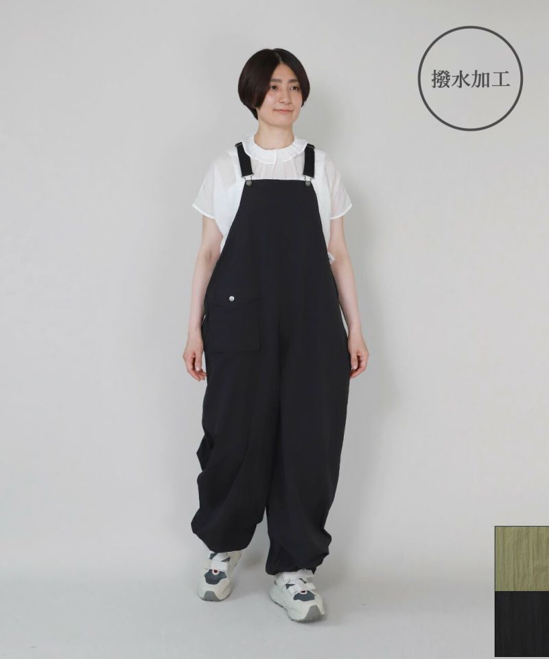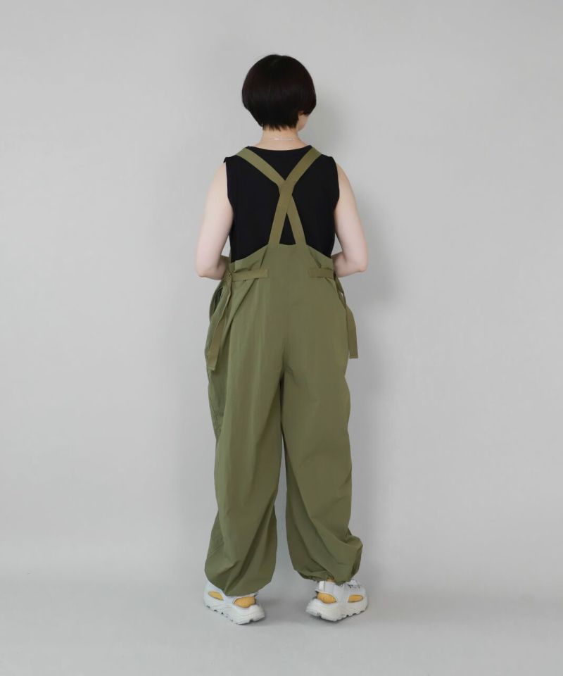 薄くて軽いナイロン素材に撥水加工を施したワイドサロペットです。 ベーシックな前立てに肩紐を同色の綾テープで切替え、シンプルな中にもミリタリーテイストを持たせています。フロントにひとつ大きな立体ポケットのデザインとワイドシルエットがカジュアルな印象の1着です。ウエストの綾テープとアジャスターでサイズ調整はもちろん、シルエットの変化が可能です。シンプルなインナーを合わせるだけでスタイリングが決まります。