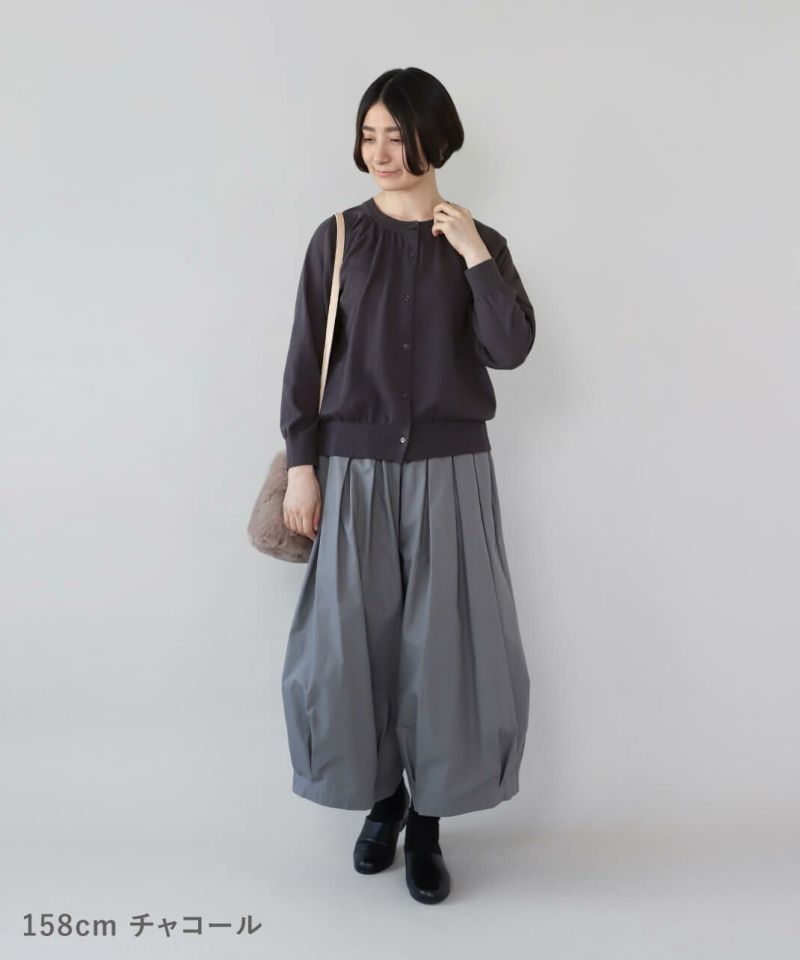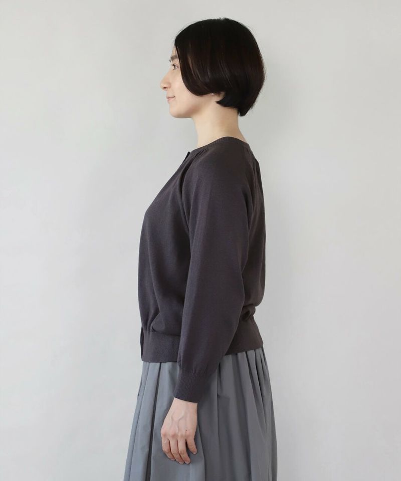 コットン強撚糸を使用し、ドライな肌触りのカーディガンです。 襟ぐりと裾・袖にギャザーが入ることで、ふんわりと軽い着心地に。コンパクトでシンプルなデザインです。ほどよいシアー感はこれからの季節におすすめの1着です。