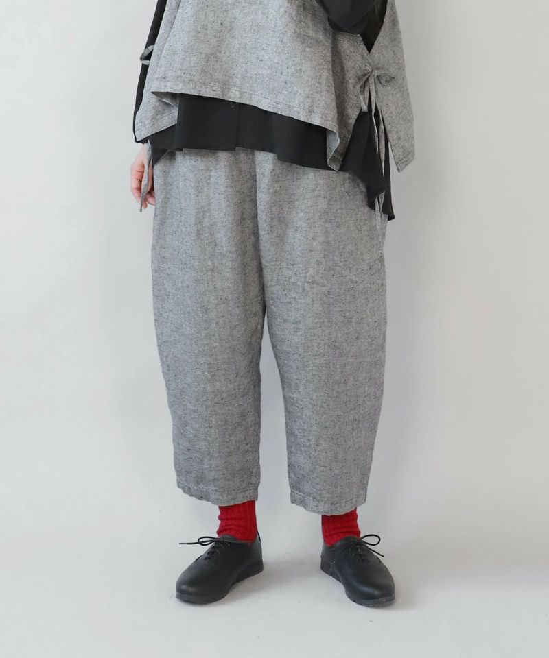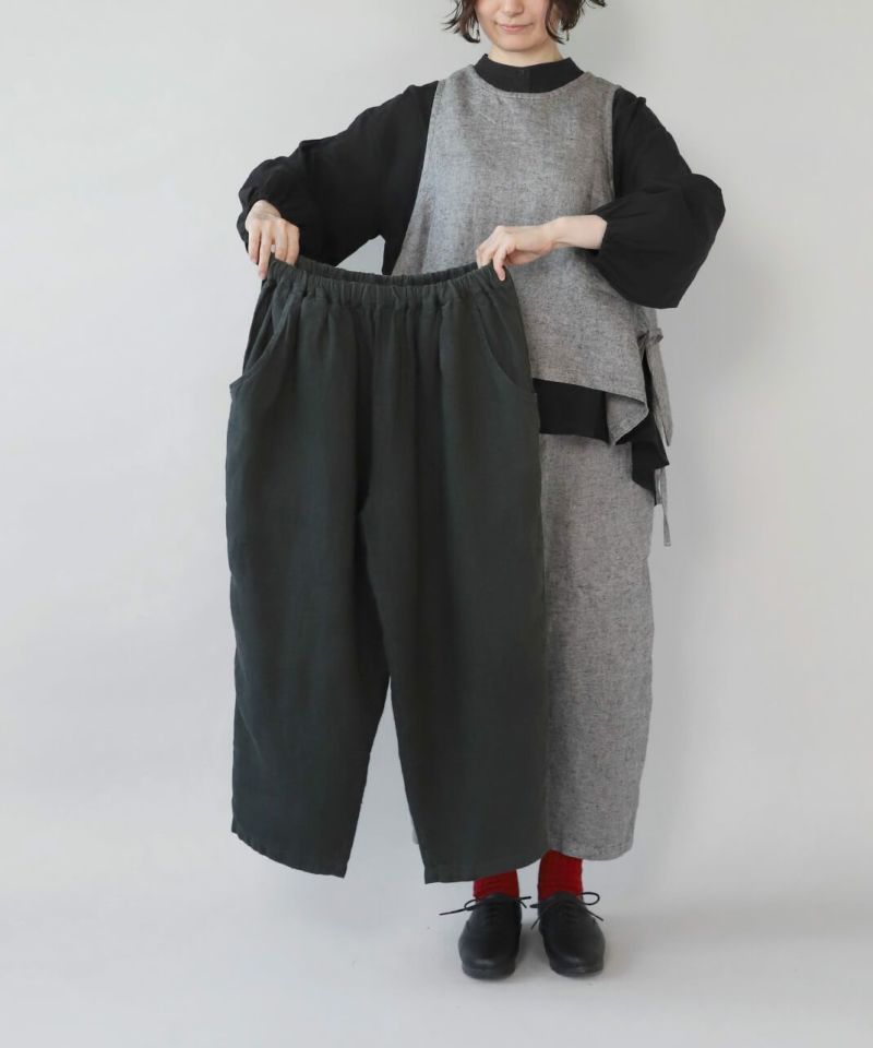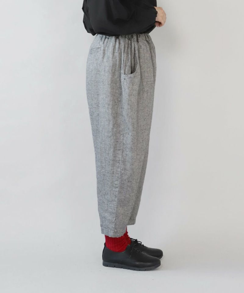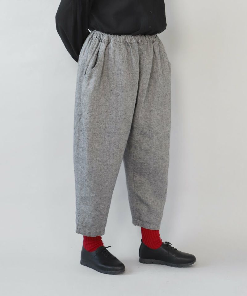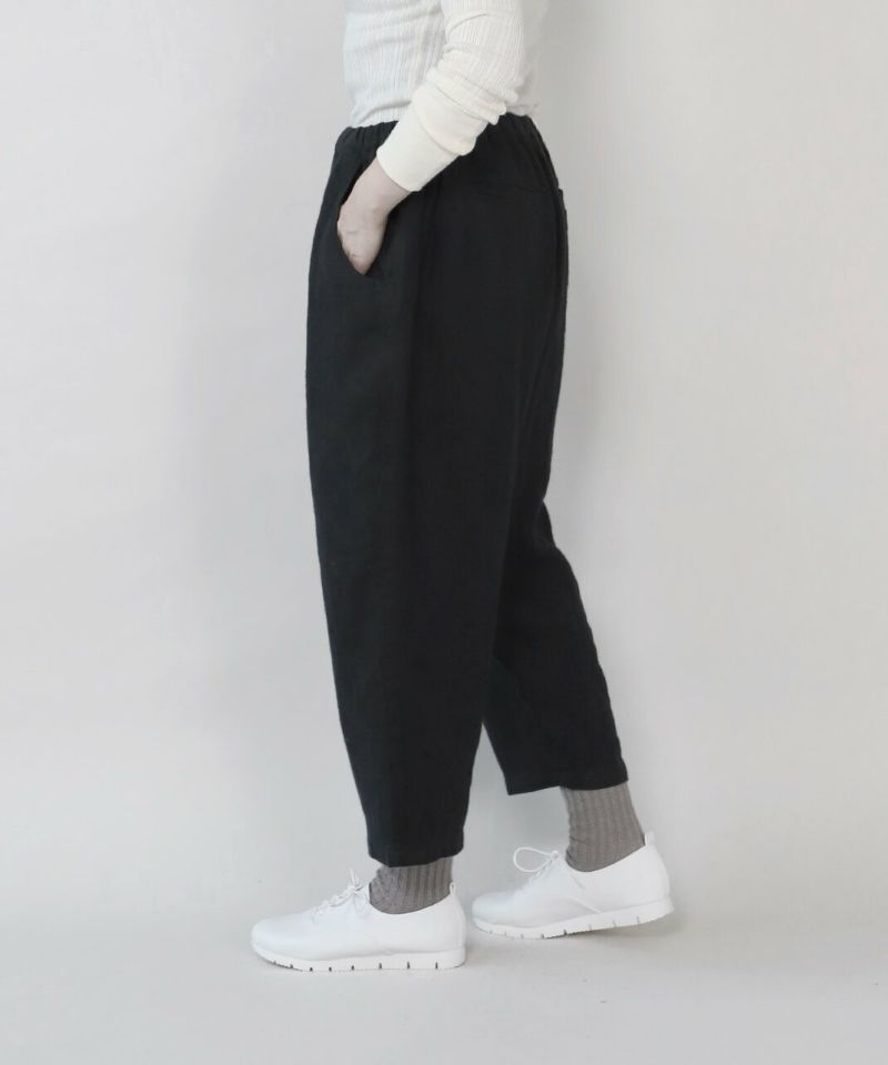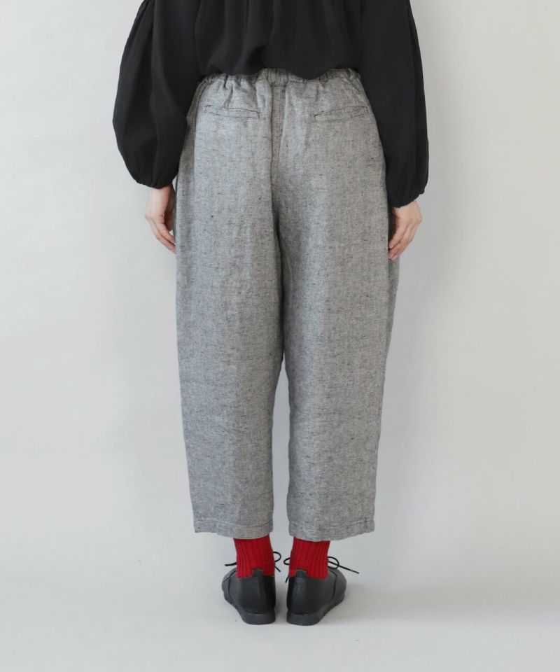 ネップ感のある起毛リネンを使用したパンツです。 ウエストがぐんと伸びるista-ireの定番、istaパンツ。太もも周りにゆとりがあり、テーパードの効いたアンクル丈のシルエットに仕上がっています。 柔らかく温かみのある風合いがナチュラルな雰囲気を演出してくれます。 同素材のベストとのセットアップもおすすめです。