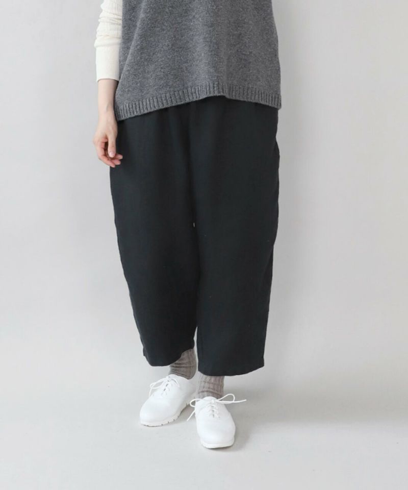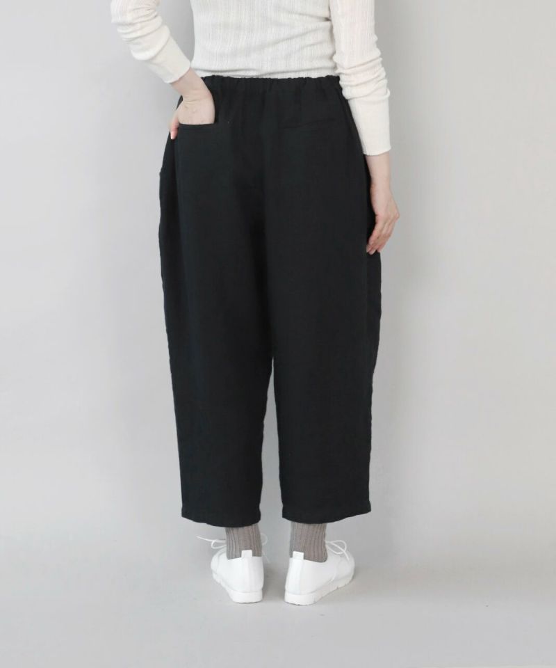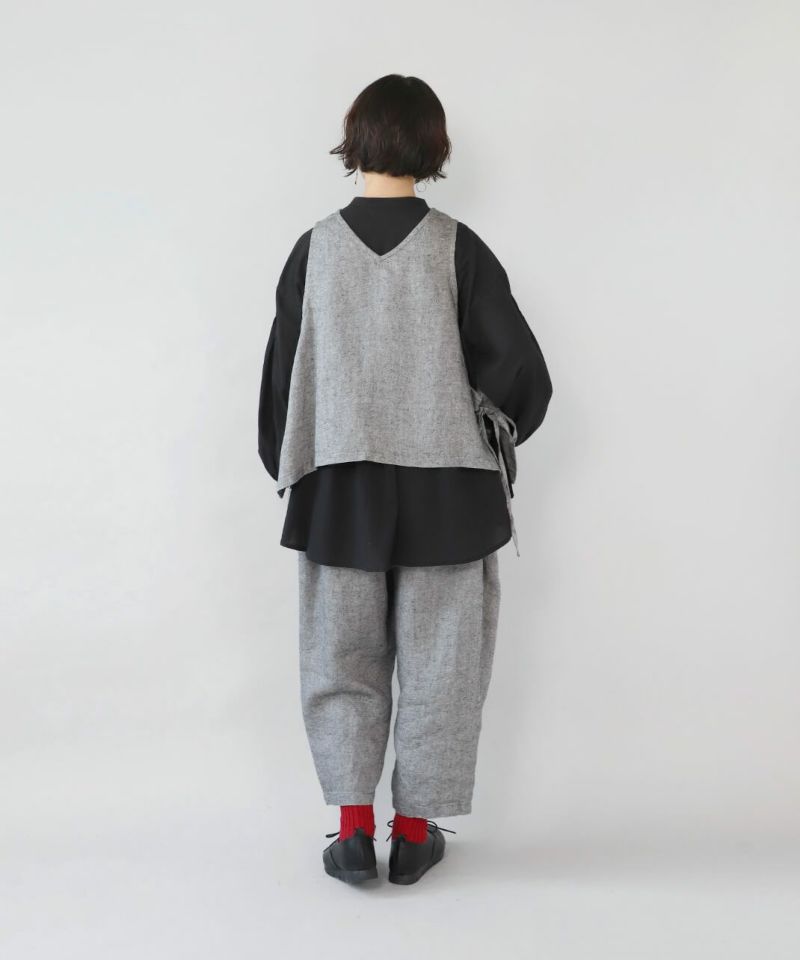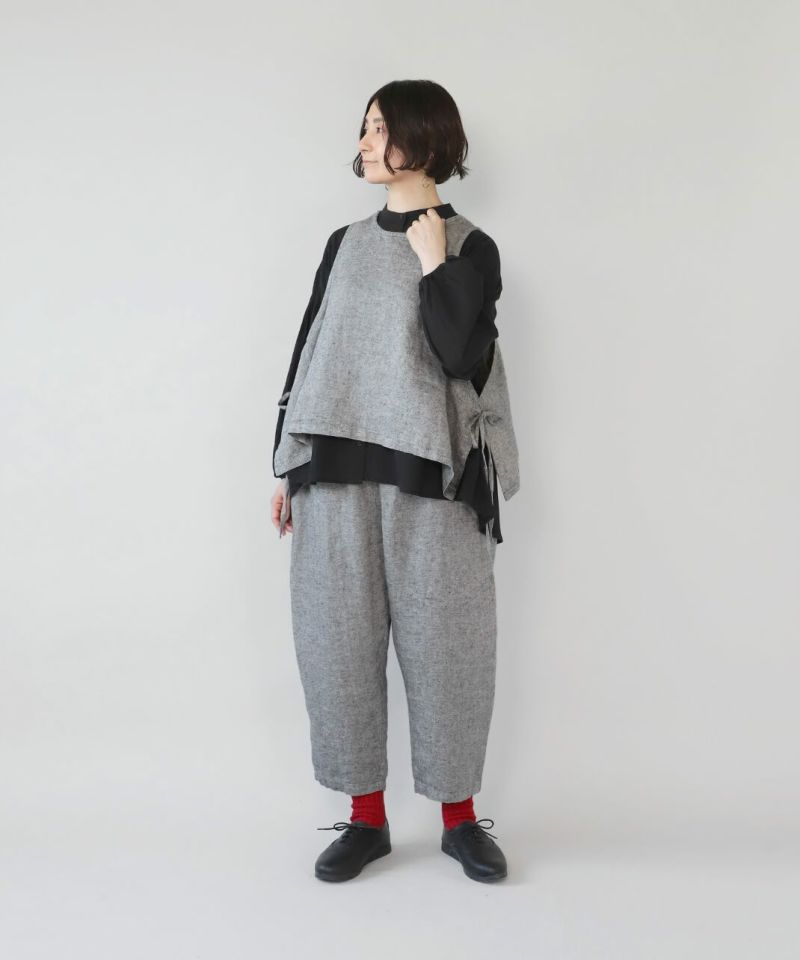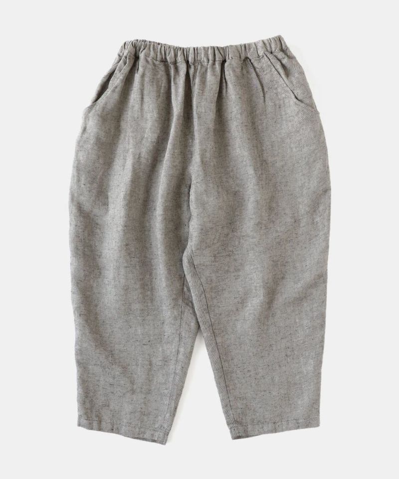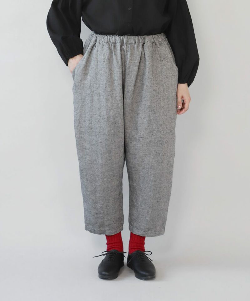 ネップ感のある起毛リネンを使用したパンツです。 ウエストがぐんと伸びるista-ireの定番、istaパンツ。太もも周りにゆとりがあり、テーパードの効いたアンクル丈のシルエットに仕上がっています。 柔らかく温かみのある風合いがナチュラルな雰囲気を演出してくれます。 同素材のベストとのセットアップもおすすめです。