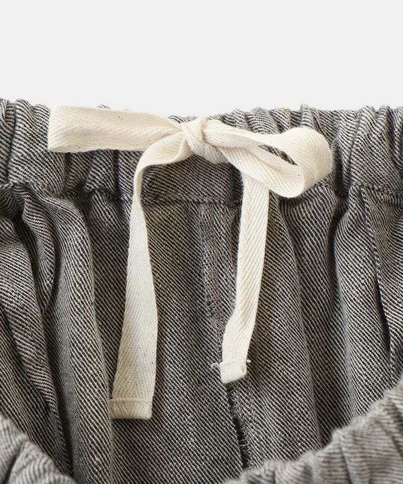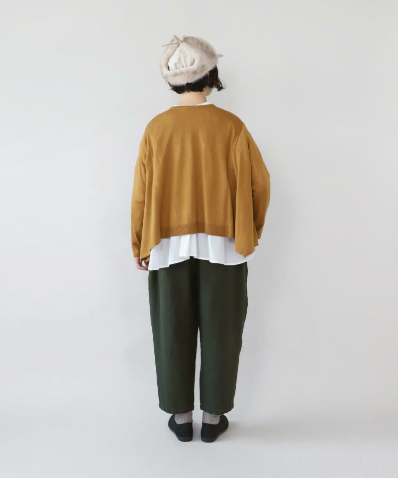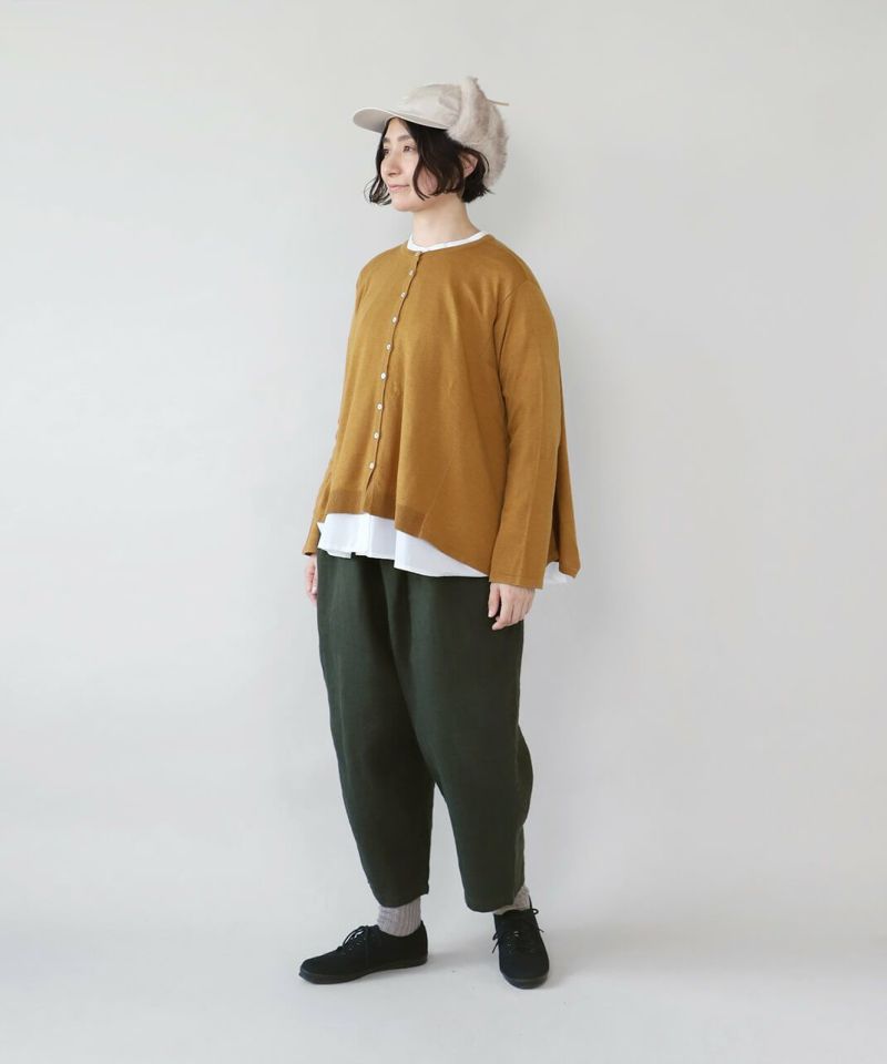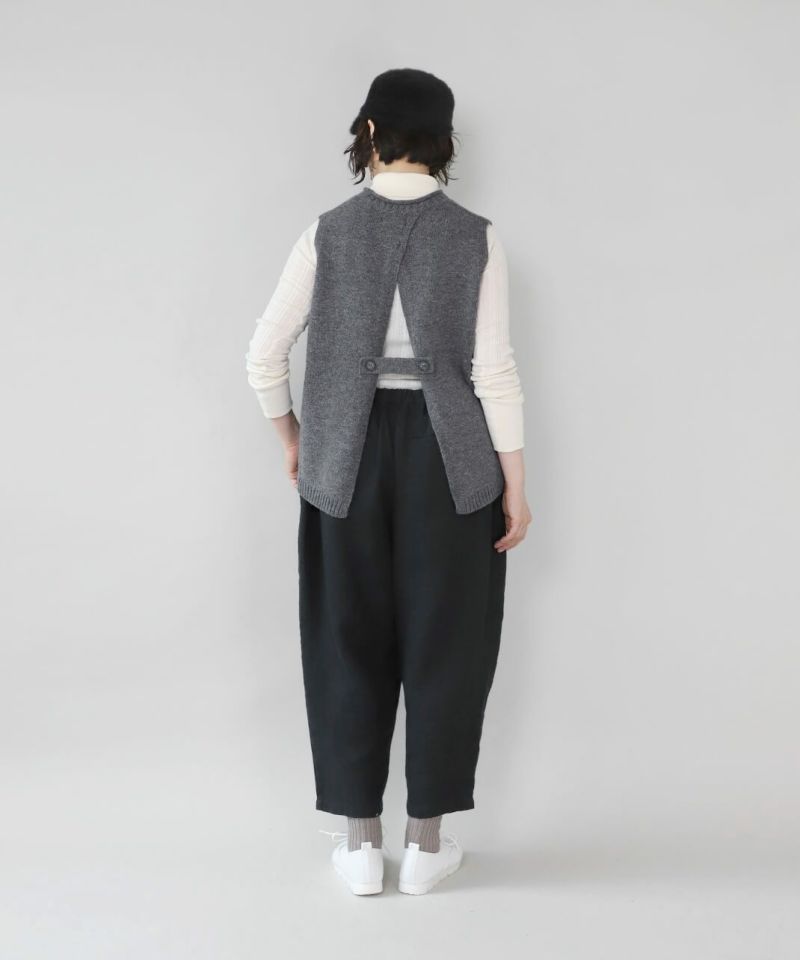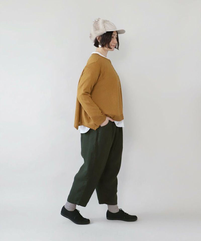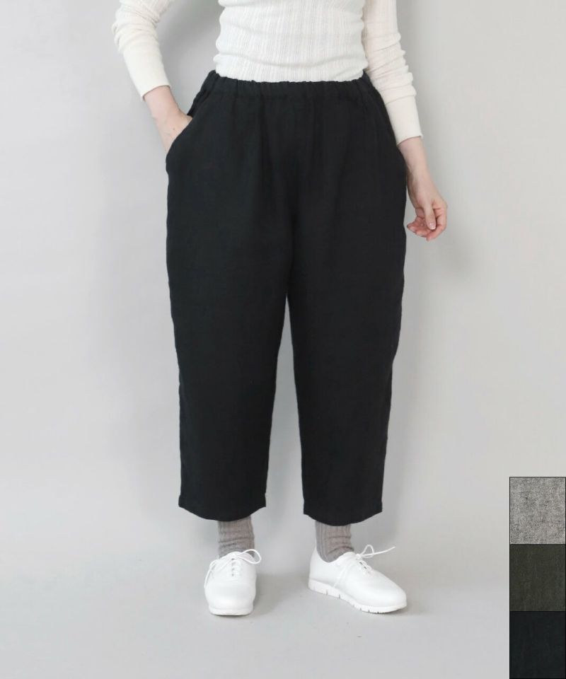 ネップ感のある起毛リネンを使用したパンツです。 ウエストがぐんと伸びるista-ireの定番、istaパンツ。太もも周りにゆとりがあり、テーパードの効いたアンクル丈のシルエットに仕上がっています。 柔らかく温かみのある風合いがナチュラルな雰囲気を演出してくれます。 同素材のベストとのセットアップもおすすめです。