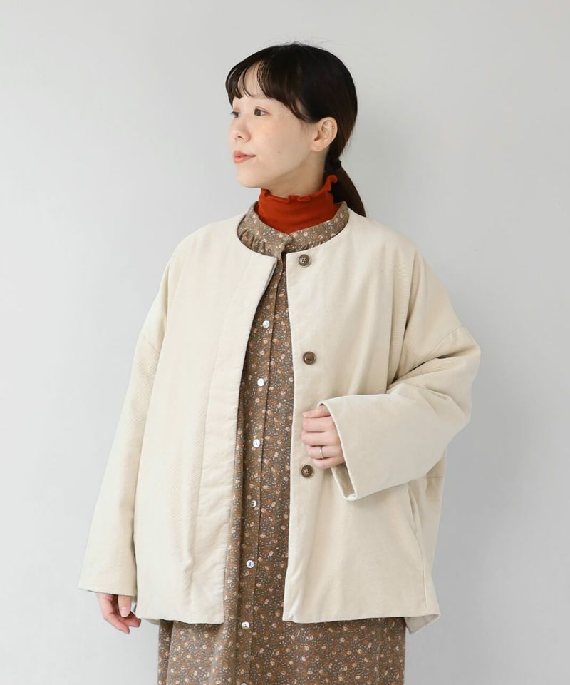 表面が起毛したコットン生地で作られたコクーンジャケットです。 斜めに入った細畝のコーデュロイがいつもと違う雰囲気の1着です。シンプルなノーカラーにワイドな身頃でゆったりとした着心地。かさばるインナーも気にならないくらいワイドなデザインです。脇にダーツが施され、立体的なコクーンシルエットに。肌寒い時にさっと羽織れ、インナーも着込めるため長い期間楽しめます。同生地のパンツとのセットアップもおすすめです。