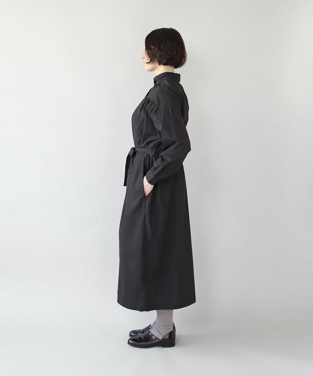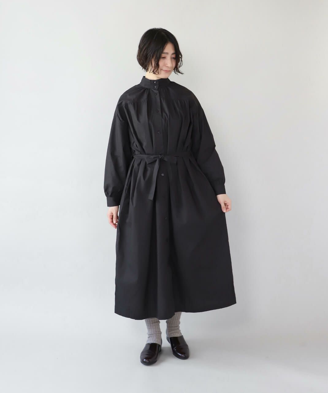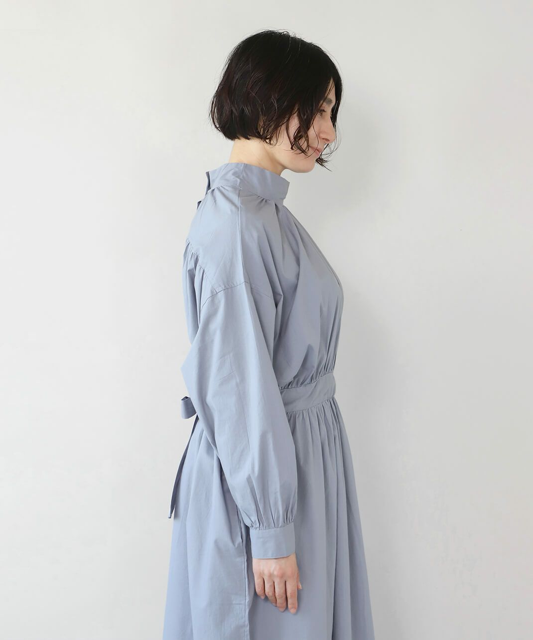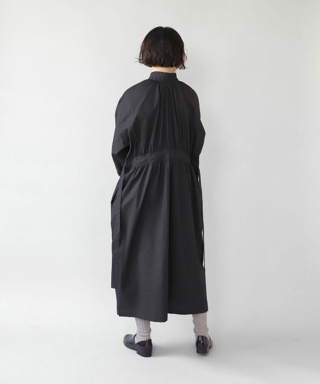 コットンポプリン素材を使用した2WAYハイネックワンピース。 ミリタリーのサージカルガウンから着想を得たデザインで、ボタンを前後に着用可能な2WAY仕様です。 前後の印象に加えてリボンがあるので、数パターンのシルエットの変化を楽しめます。 ベストやニット、カーディガンとも合わせやすく、羽織りにもおすすめです。
