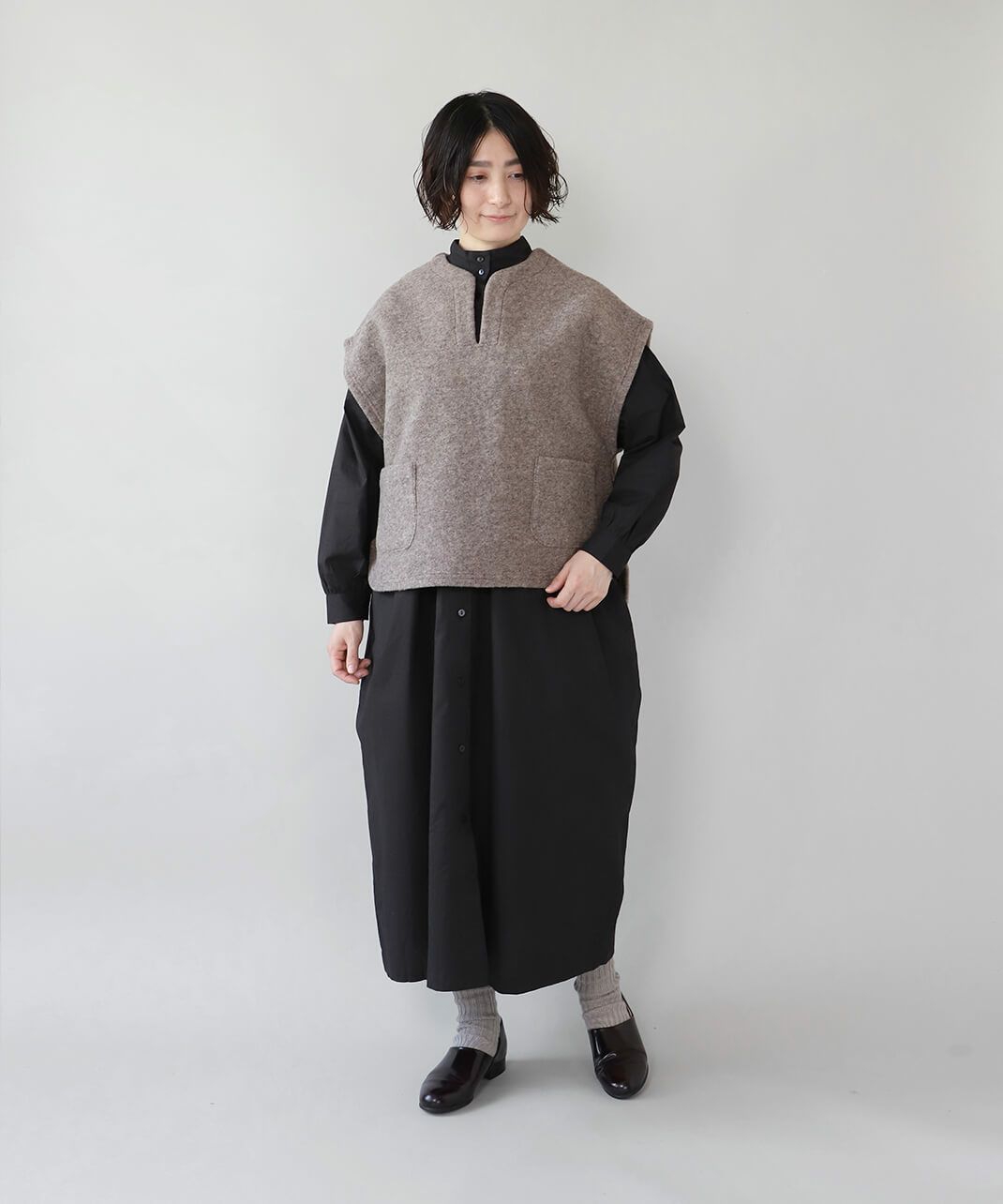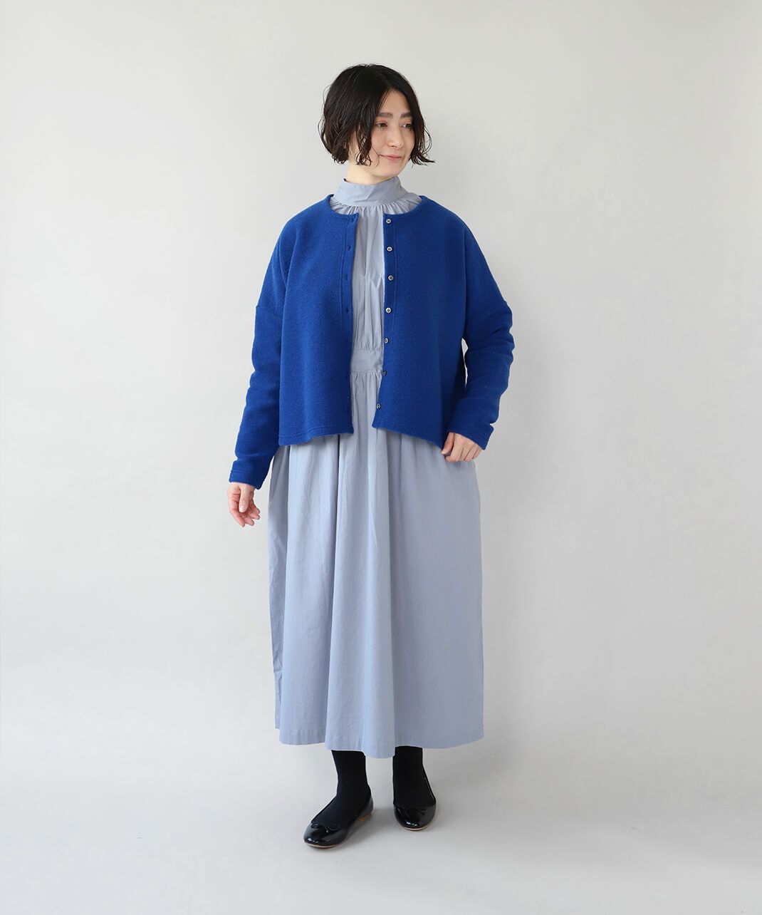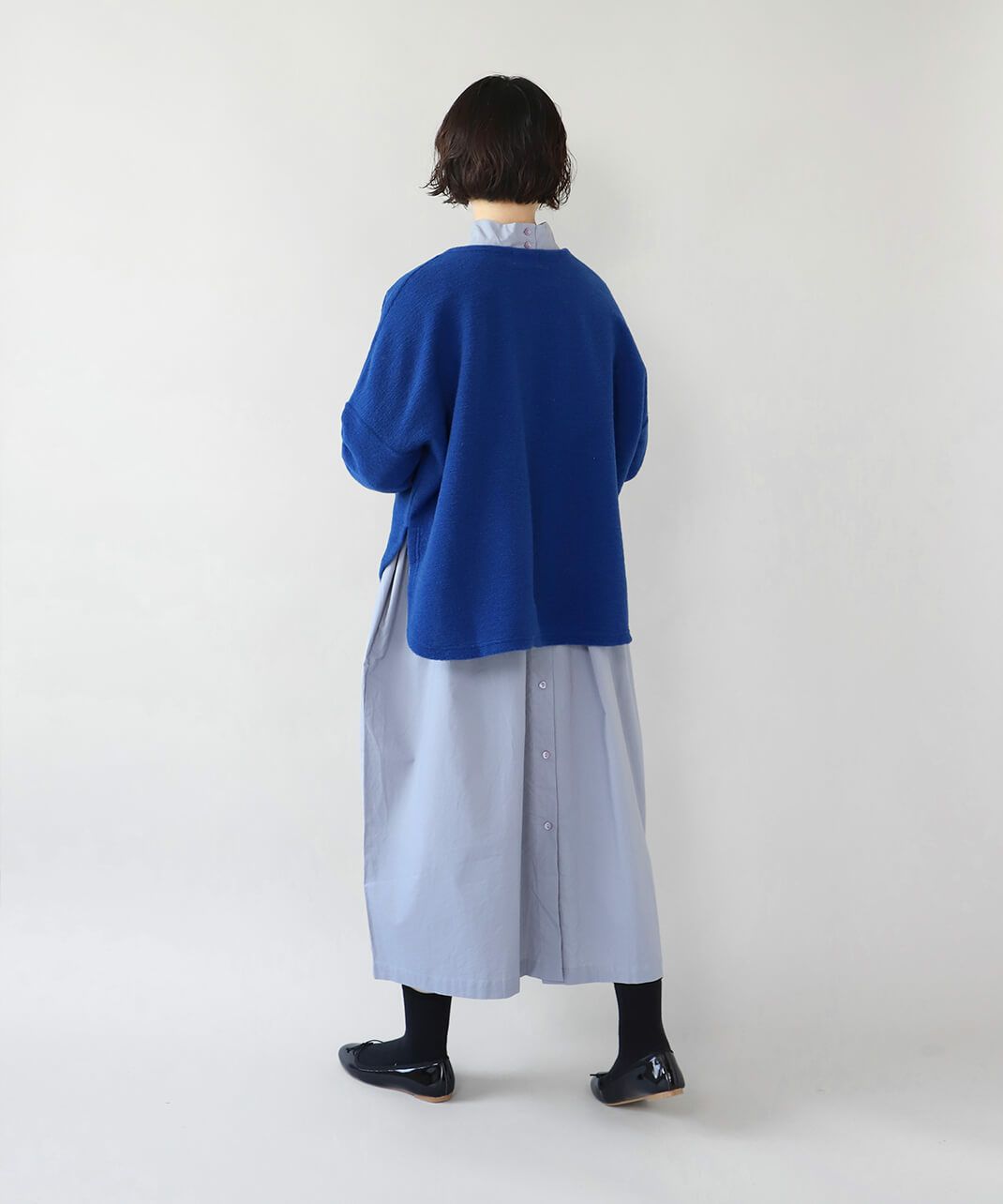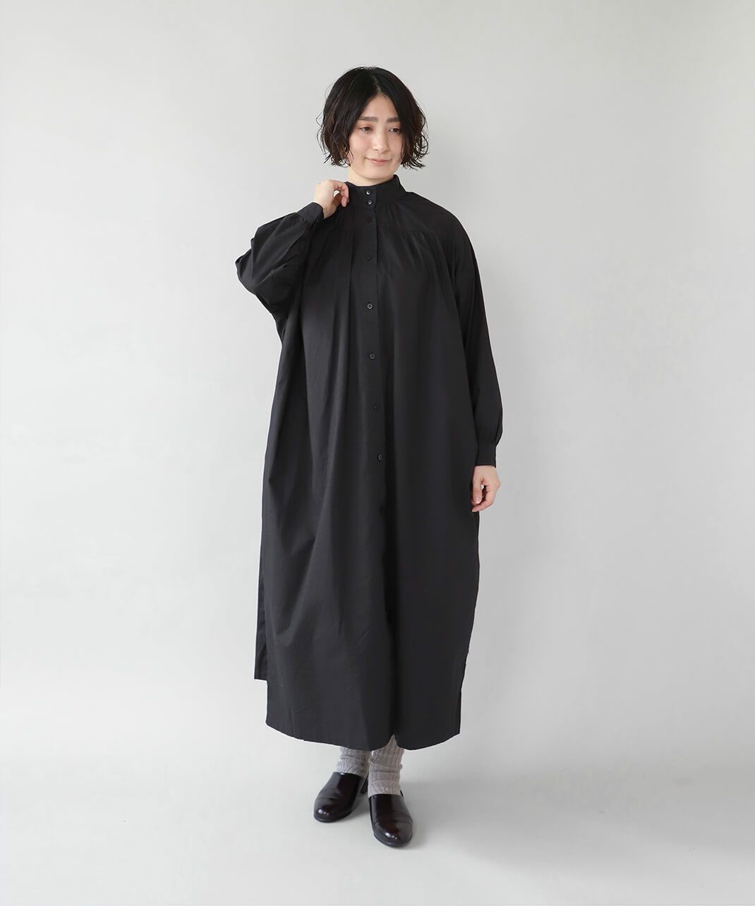 コットンポプリン素材を使用した2WAYハイネックワンピース。 ミリタリーのサージカルガウンから着想を得たデザインで、ボタンを前後に着用可能な2WAY仕様です。 前後の印象に加えてリボンがあるので、数パターンのシルエットの変化を楽しめます。 ベストやニット、カーディガンとも合わせやすく、羽織りにもおすすめです。