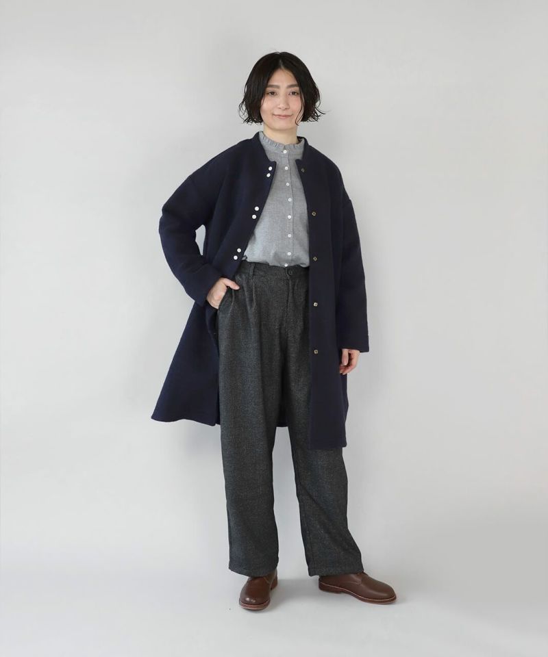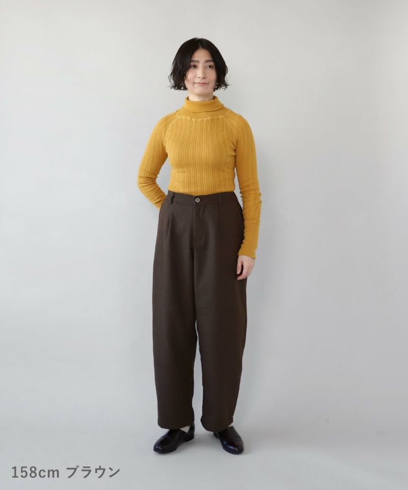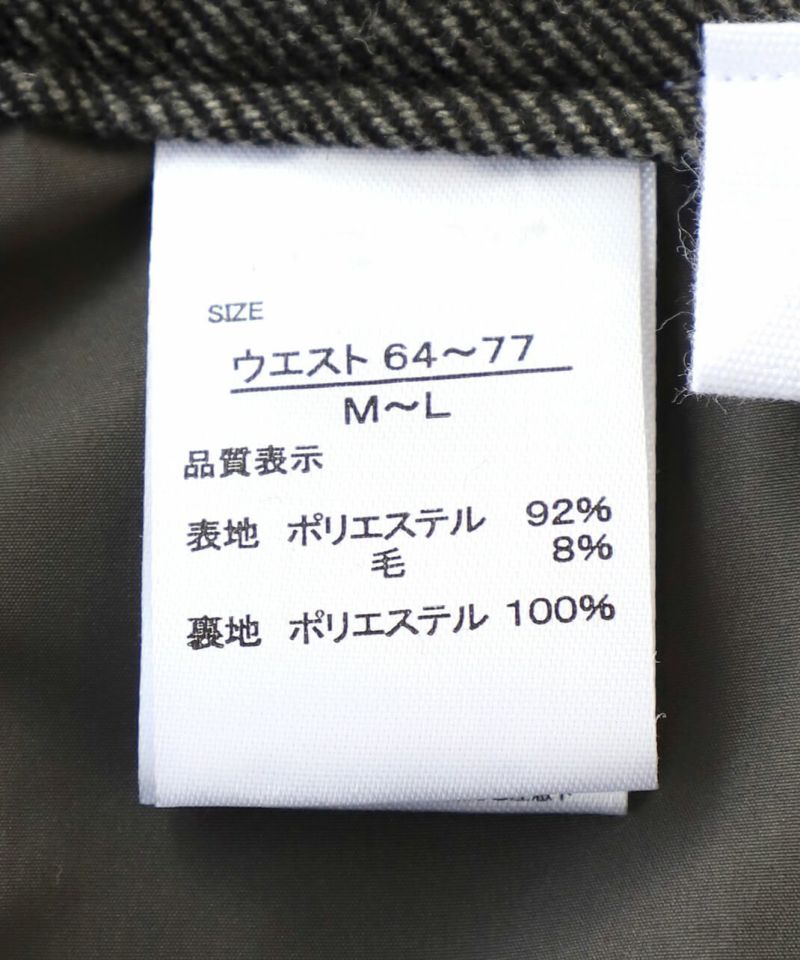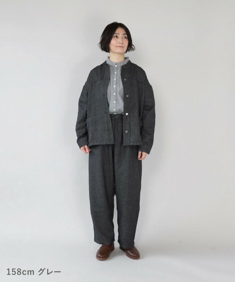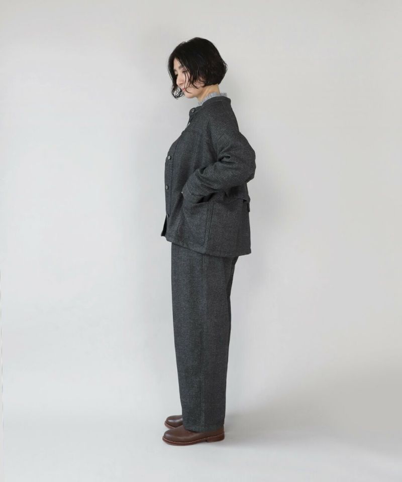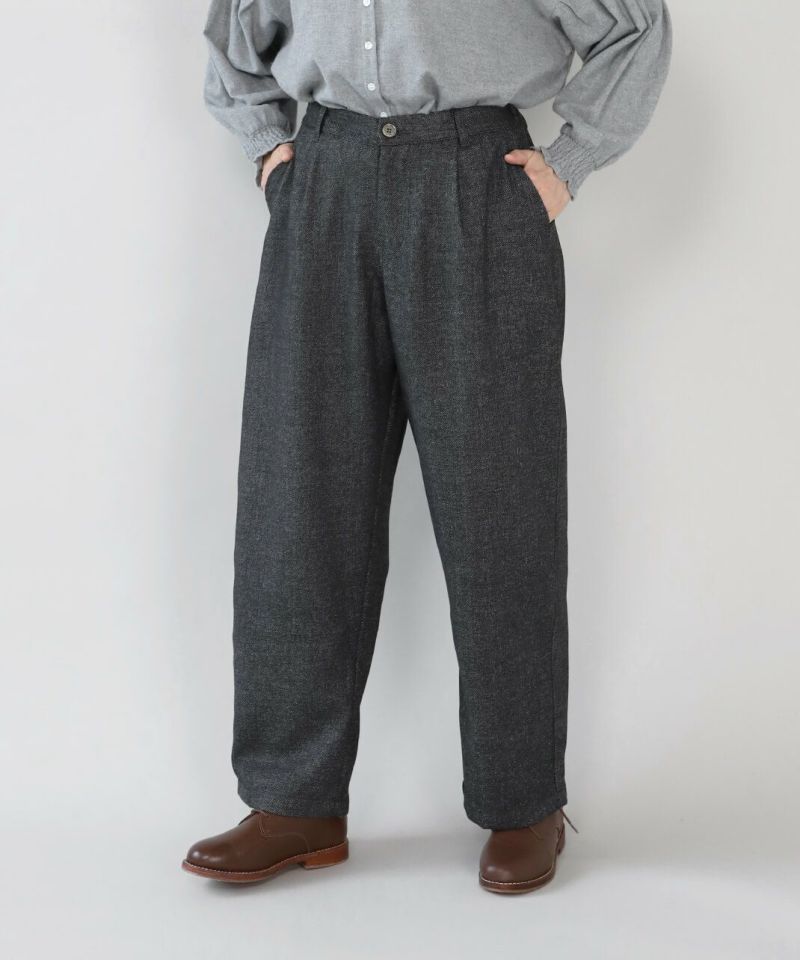 あたかみのあるツイードの風合いのウールミックス素材を使用したパンツです。裾に向けたテーパードシルエットですっきり見せてくれます。型崩れしにくくシワも寄りにくい素材で、裏地には高密度でハリがあるためちくちくしません。ウエストは後ろのみゴム仕様、ベルトループ付きのためジャストサイズで着用可能です。同素材のジャケットとのセットアップもおすすめです。